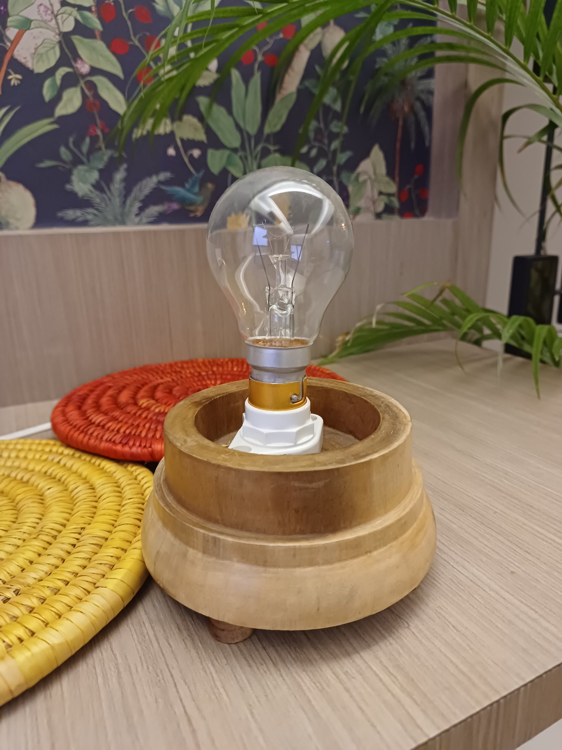 A beautifully hand crafted table lamp with a rounded hand painted solid wood base & a leather hand painted shade that sits on it perfectly.