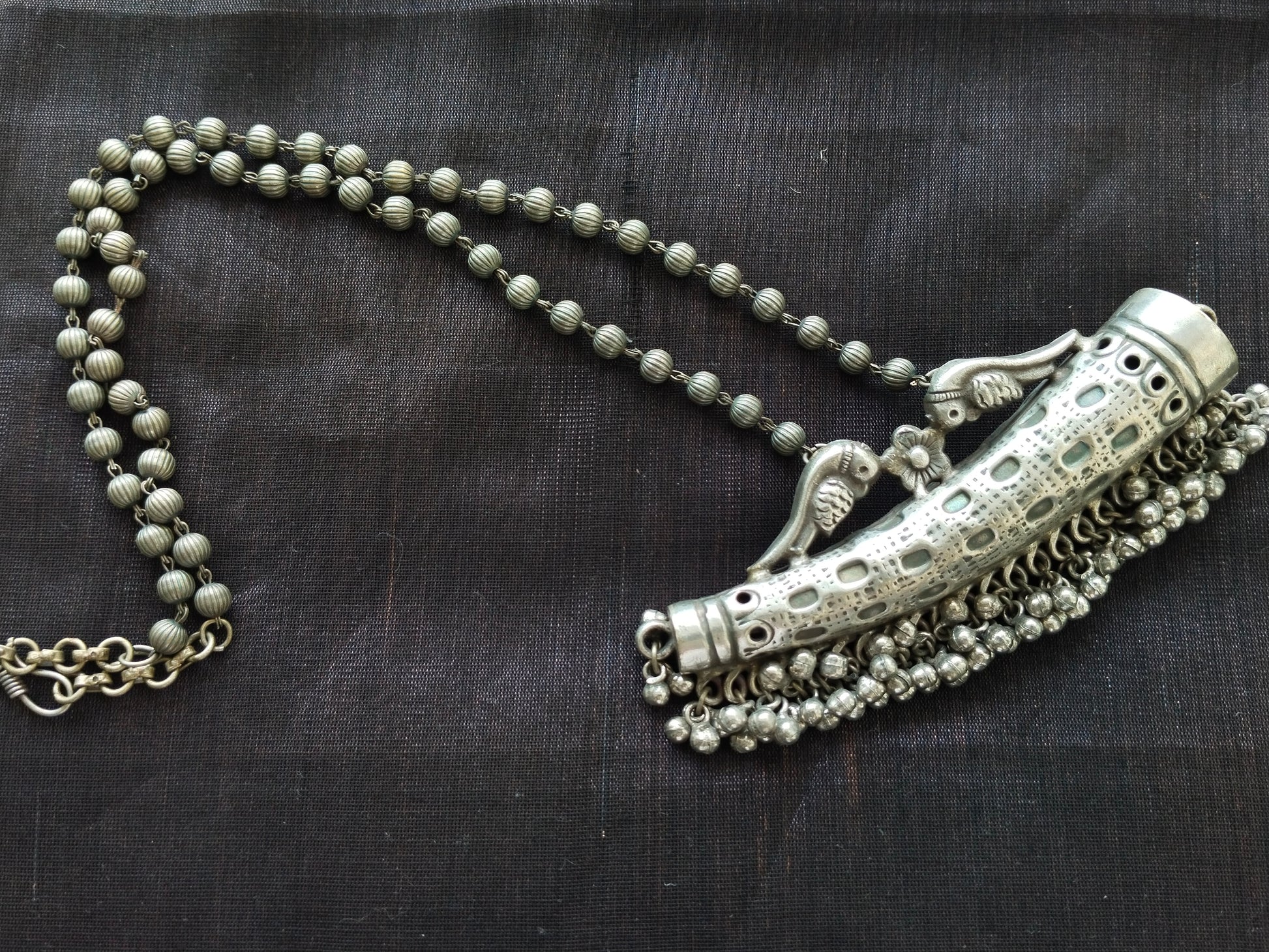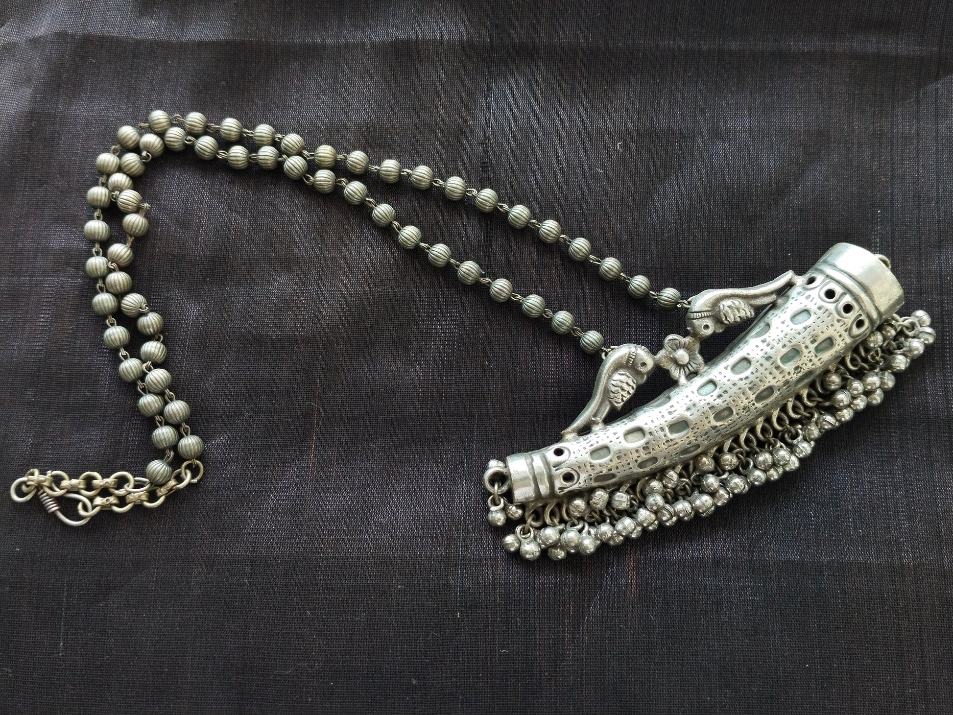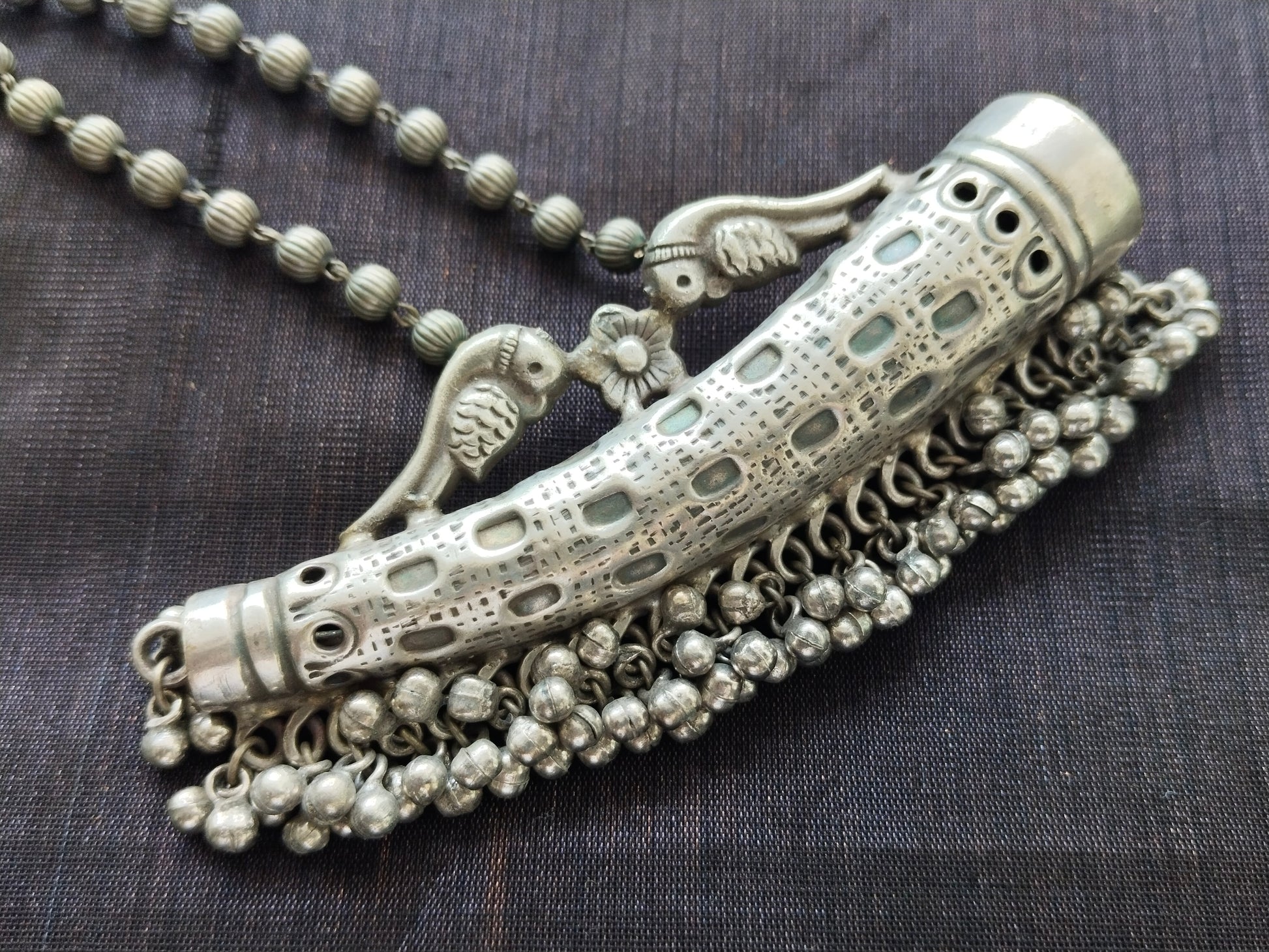 The intricate beads and brass fish motifs add a touch of whimsy, while the delicate ghungroo bells create a subtle, melodic jingle. This piece embodies the beauty of detailed craftsmanship and the allure of vintage elegance, making it a unique and stylish accessory for any occasion.