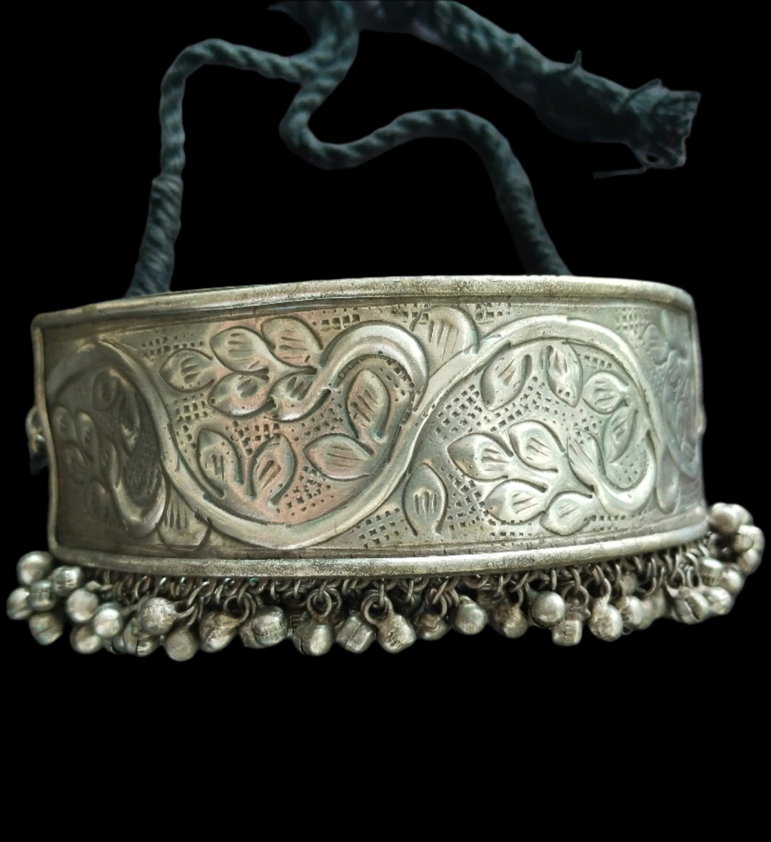 This exquisite piece features intricately crafted brass elements, embellished with delicate ghungroos that add a touch of musical elegance.