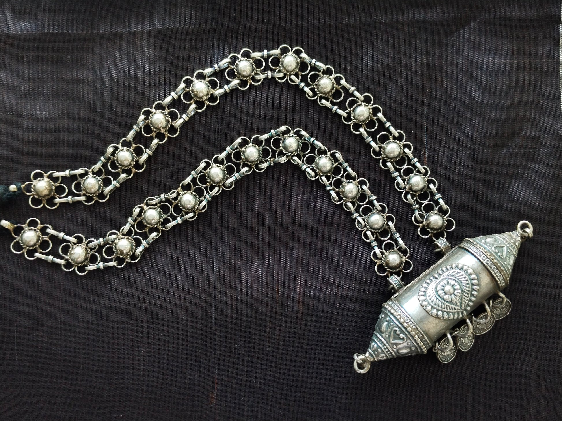 Our long beaded antique brass necklace, adorned with coin charms and intricate images, is a true work of art.