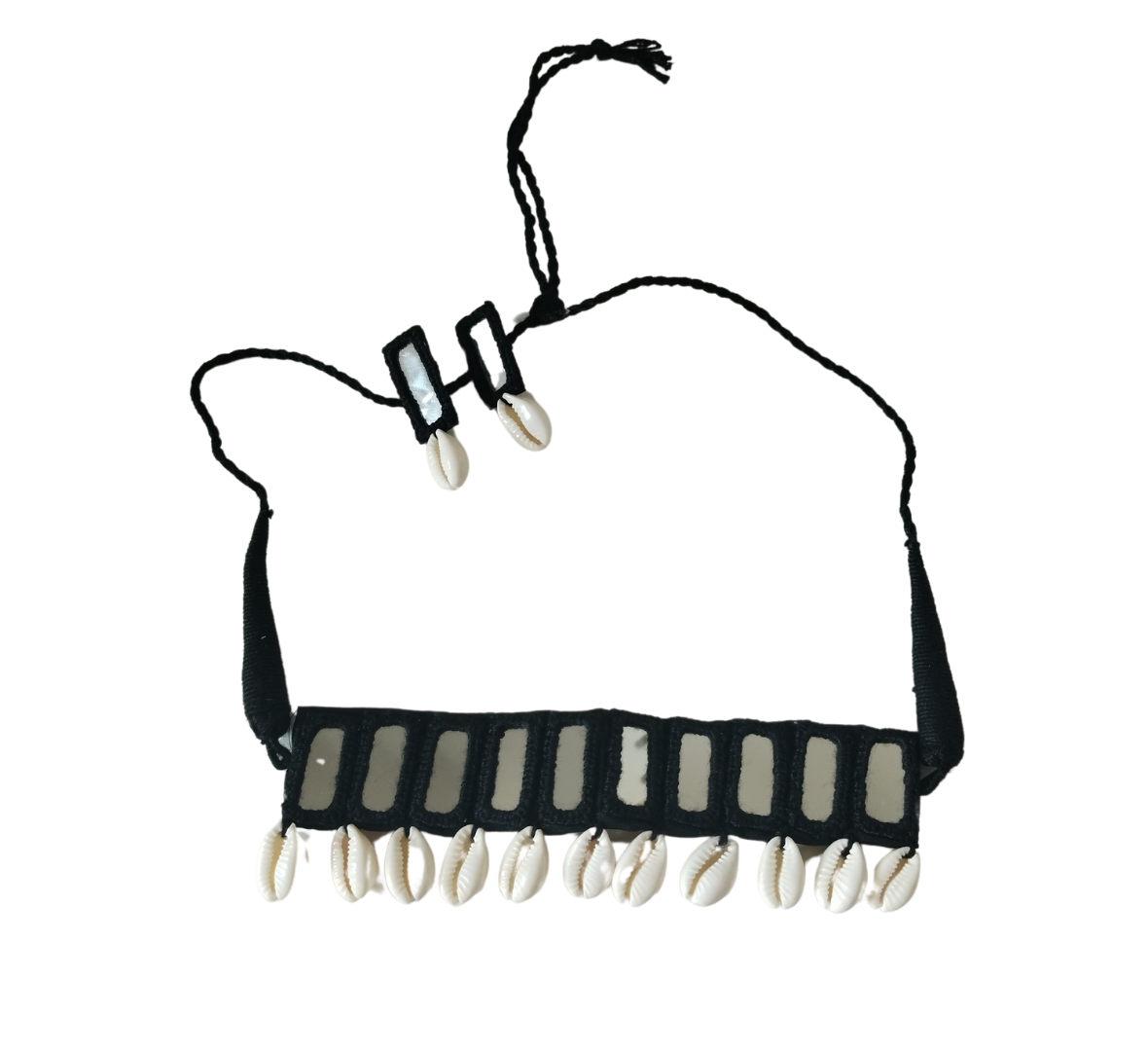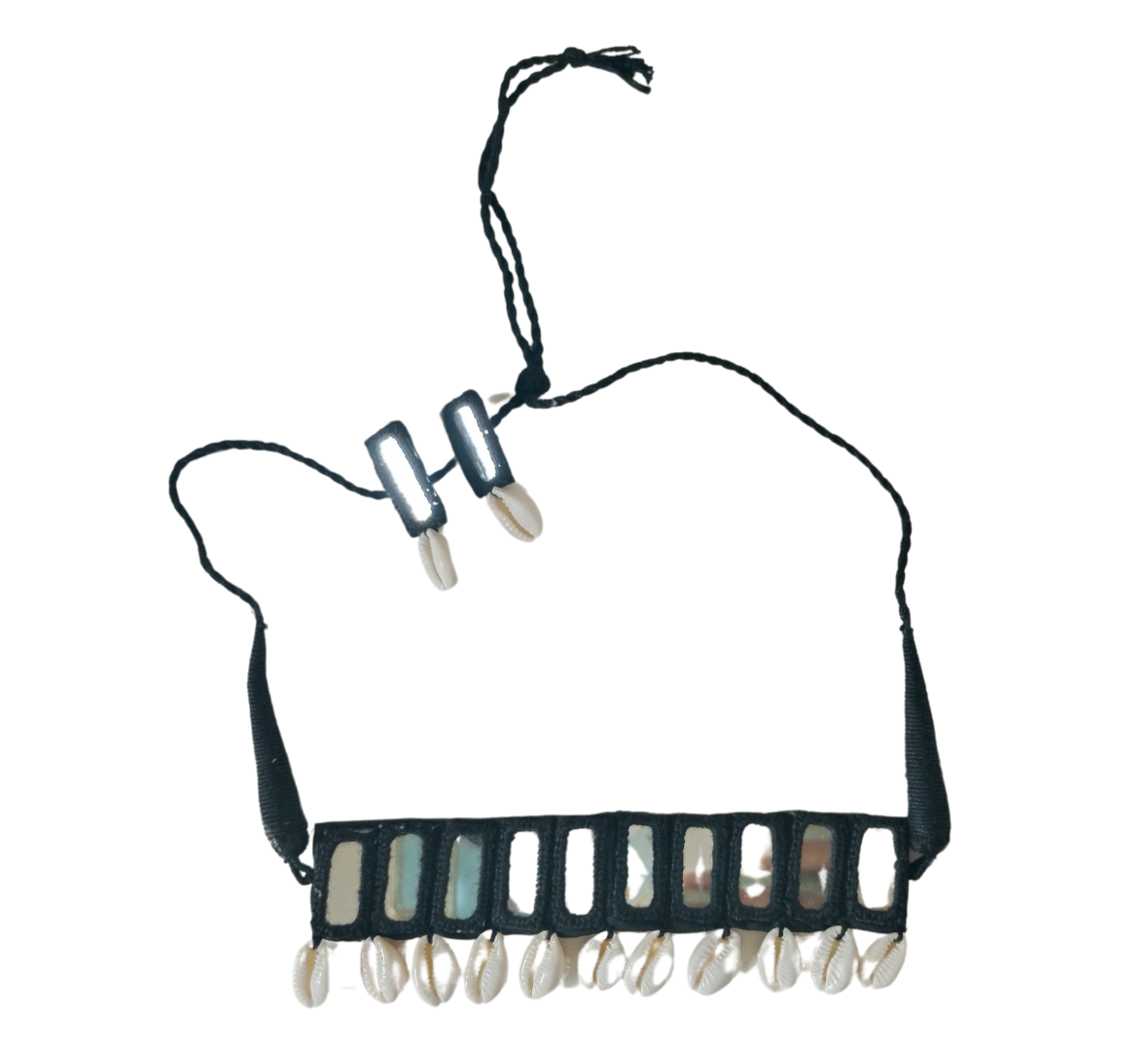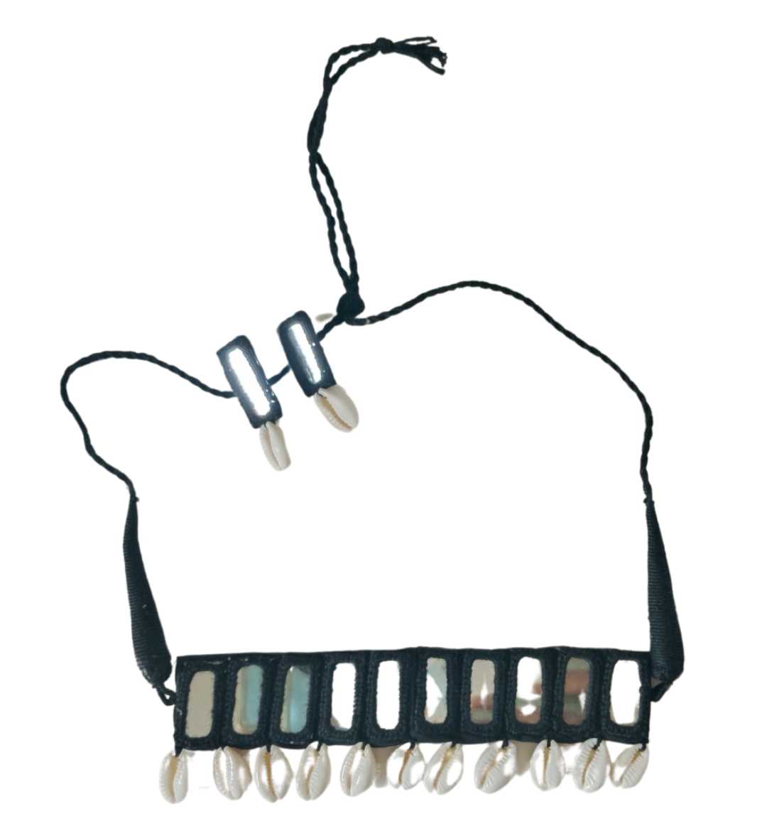 Embrace the festive spirit of Navratri with this striking Black Choker Necklace Set, featuring intricate shell and mirror work for a perfect combination of traditional and boho elegance.
