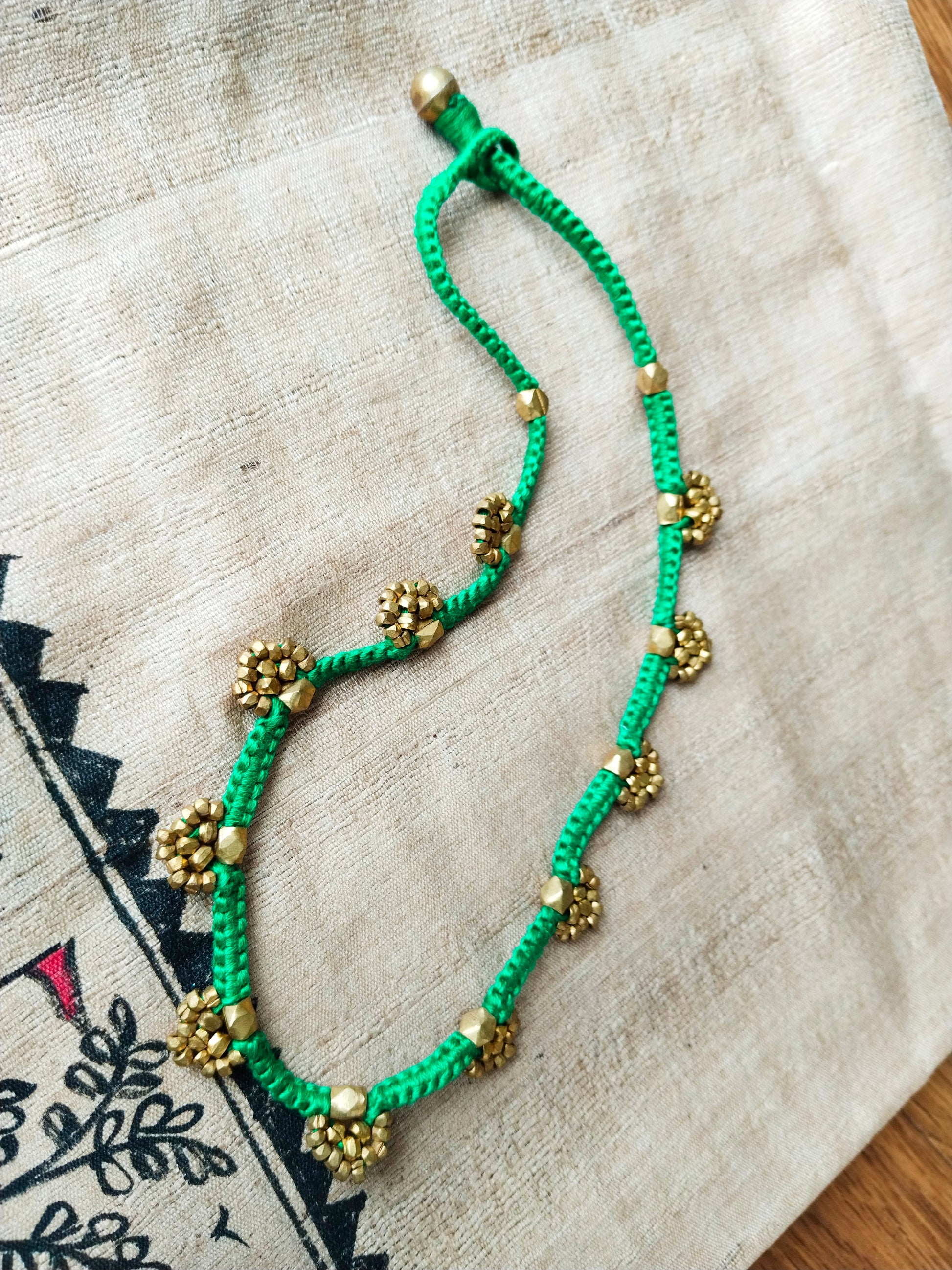 This unique necklace features a meticulously handcrafted brass flower beads using the ancient Dhokra technique, elegantly suspended on a durable green thread. The intricate design and contrasting materials create a striking piece that enhances any outfit with its timeless charm.