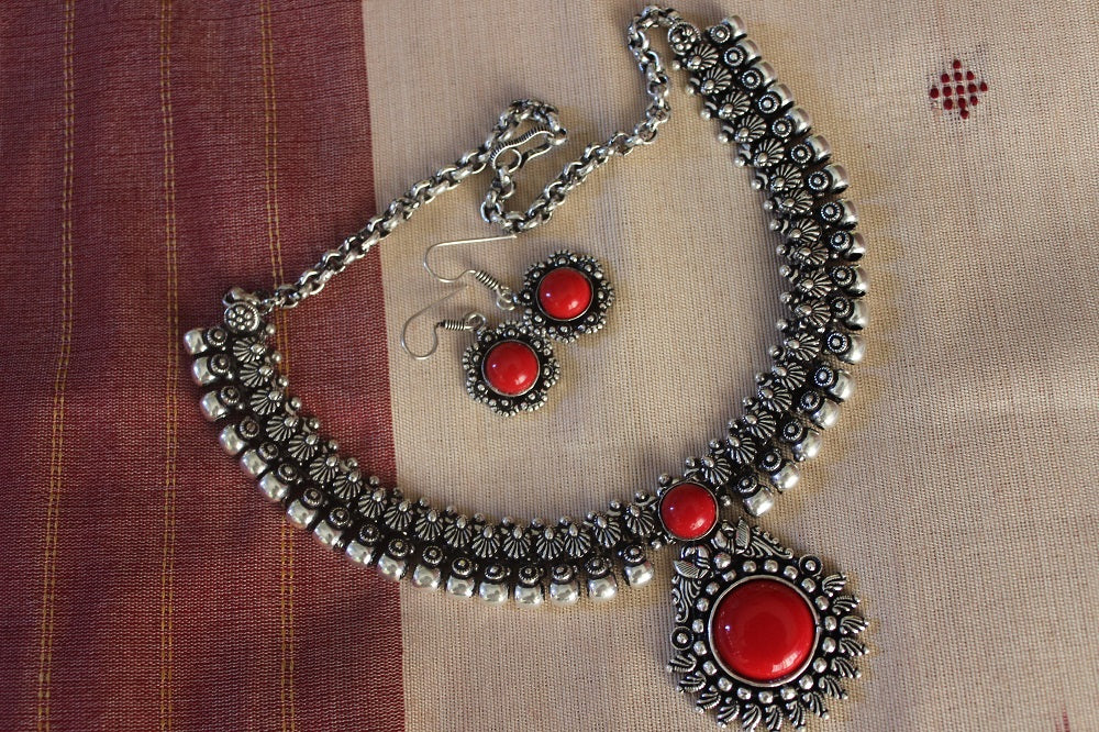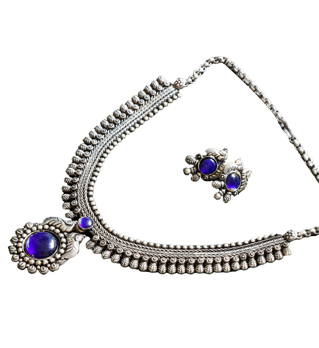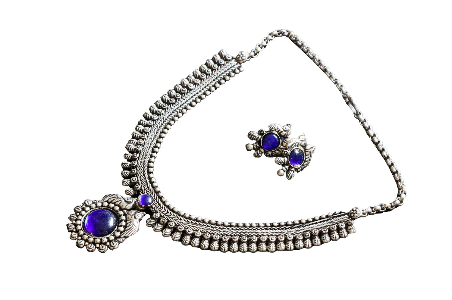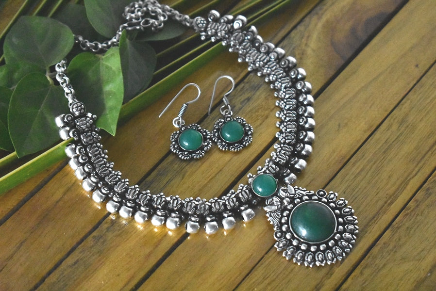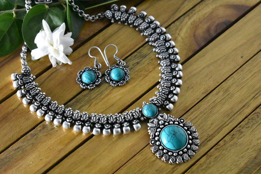 A beautiful Firozi stone handmade german silver necklace with matching earrings.