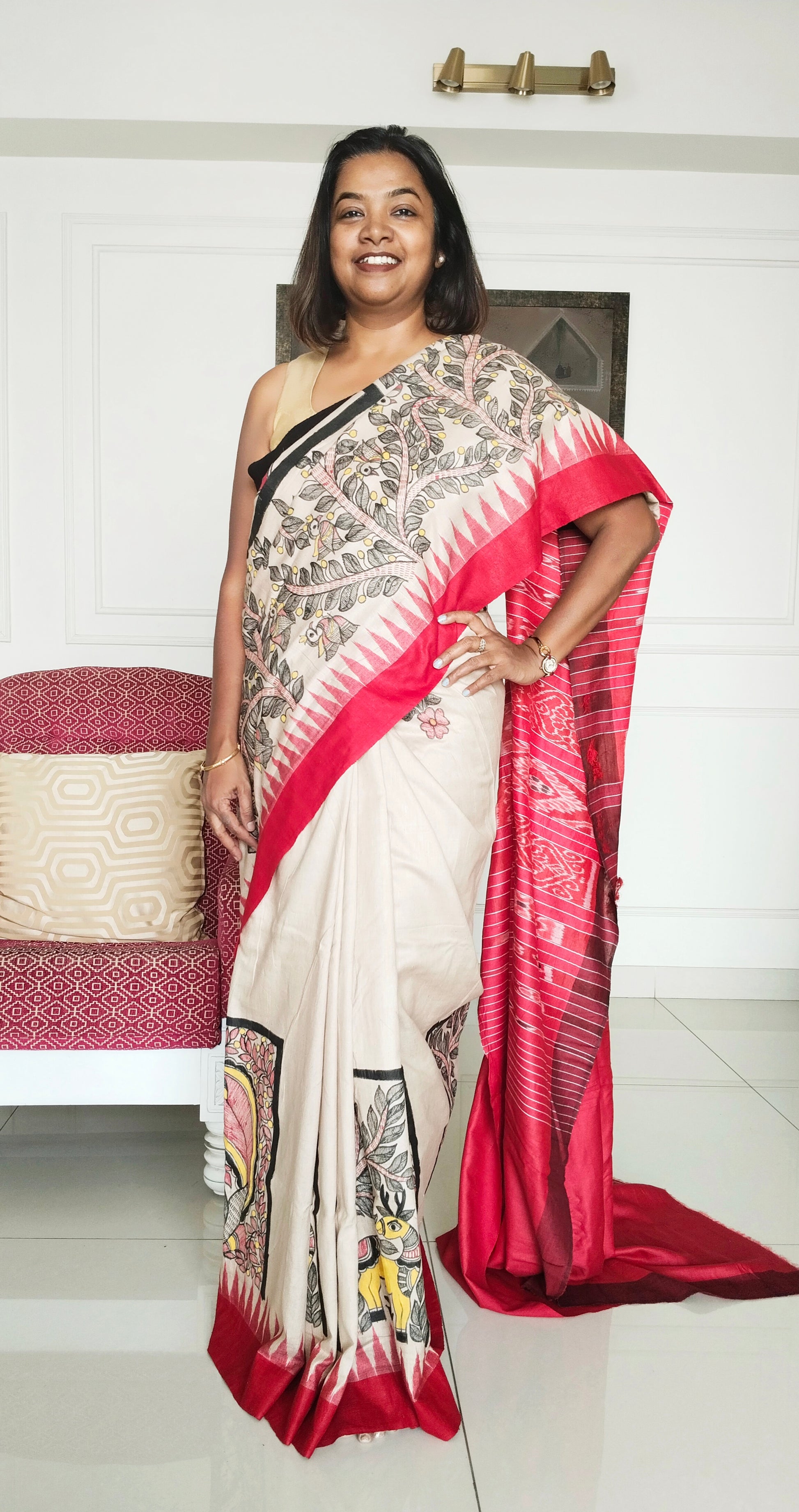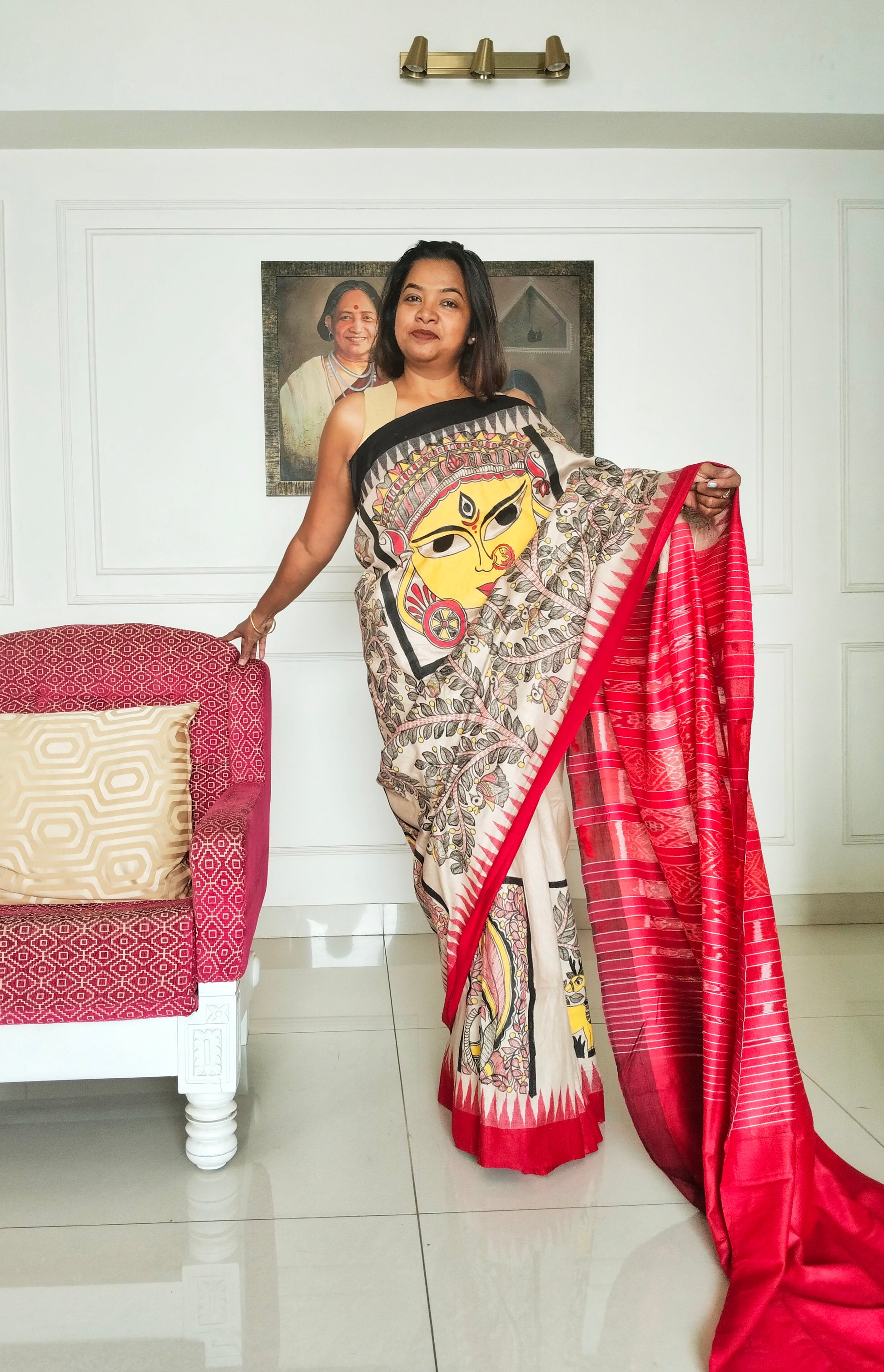 A lovingly hand painted Madhubani saree by one of our women artist depicting Goddess Durga as Banashankari and the beautiful forest and her animal beings roaming wild and free.