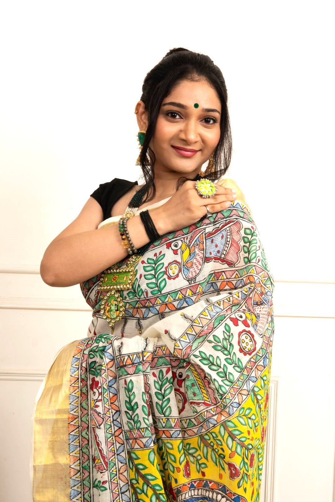 Seek the blessings of Goddess Saraswati with this vibrant handpainted madhubani sare depicting the goddess holding her veena.