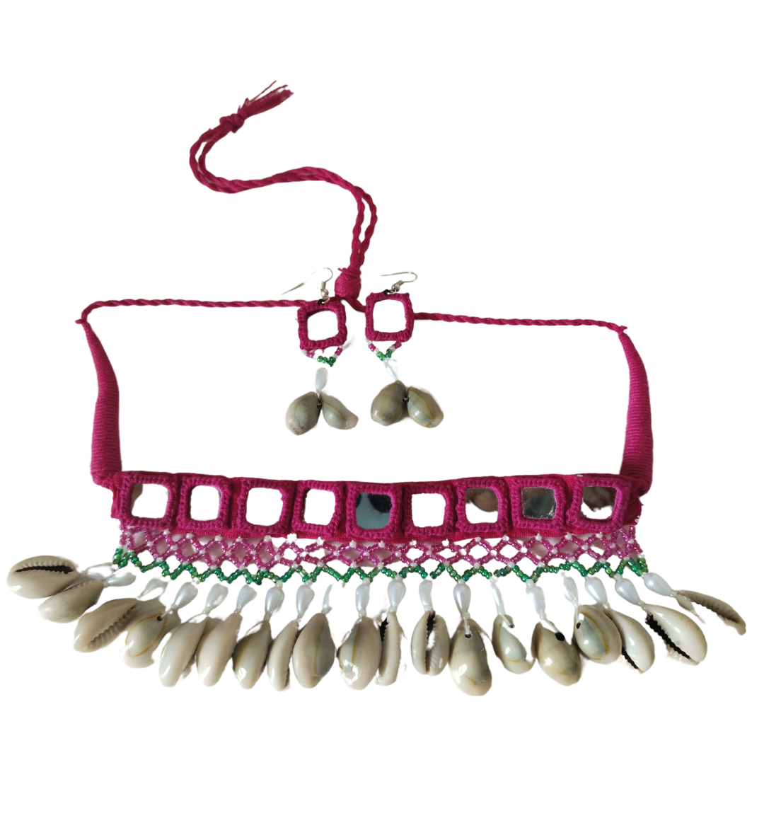 Celebrate the vibrant spirit of Navratri with this stunning Pink Fabric Choker Necklace Set, featuring intricate mirror work and natural shell accents.