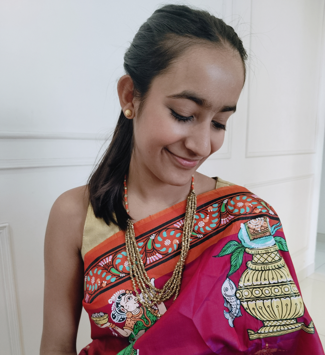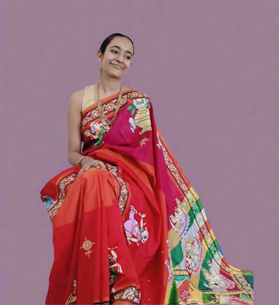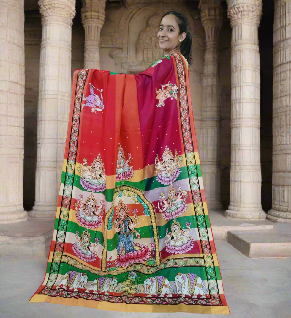 Ashta Lakshmi Saree in Orange and Pink Shade - Patachitra