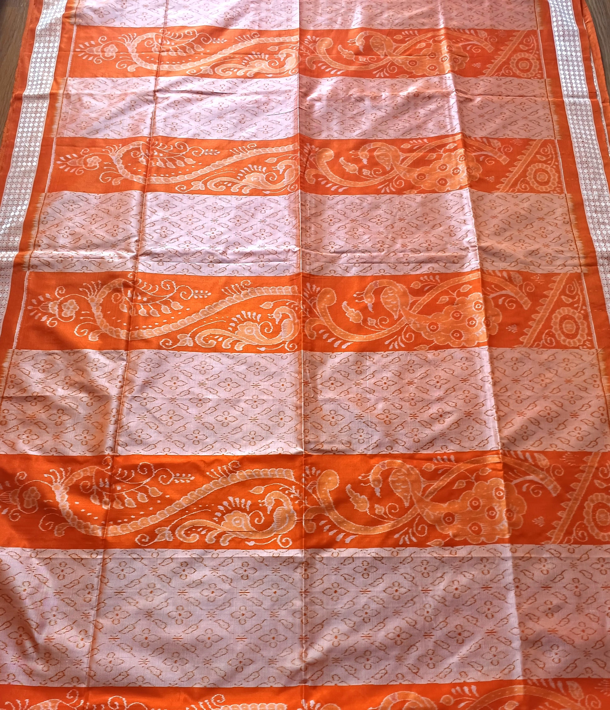 A stunning unique sambalpuri ikkat saree which you won't normally find, given a beautiful colour combination of peach and orange. The saree is a unique blend of modern and traditional with its stripped body in contrasts of peach and orange featuring beautifully woven peacocks with flowers, and the 'chitta' or white rice paste rangoli theme on the pallu