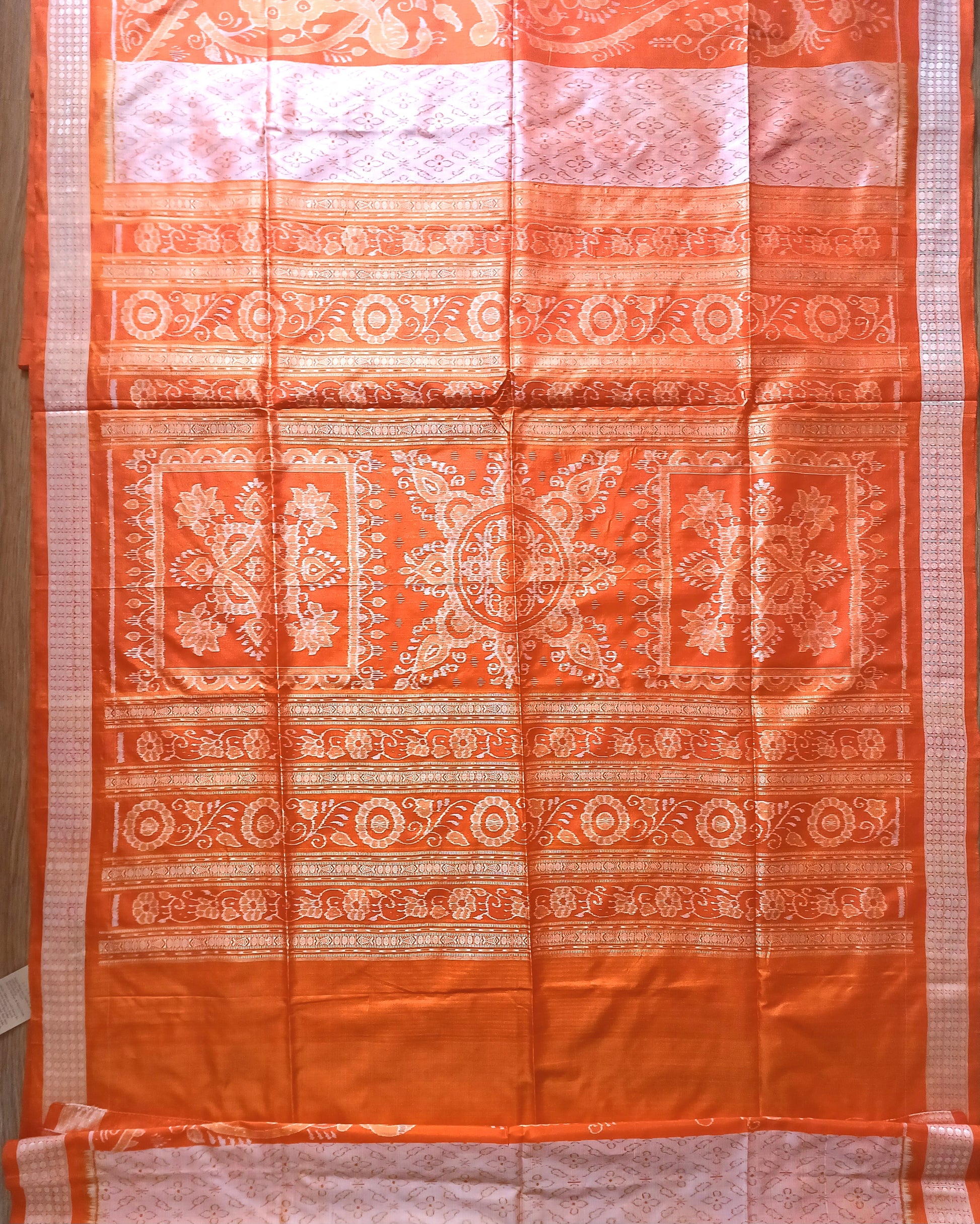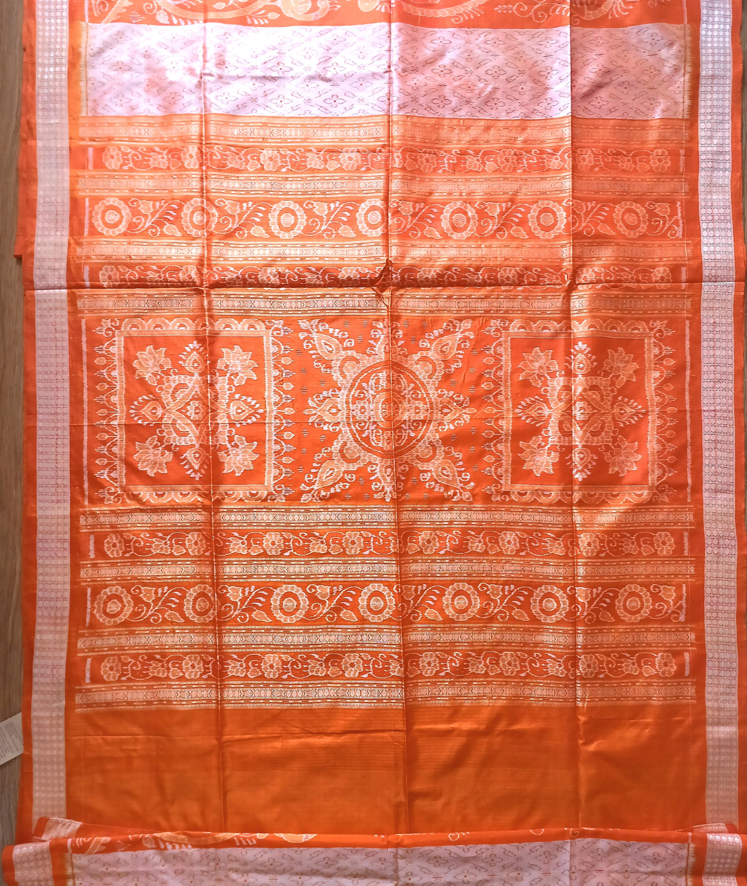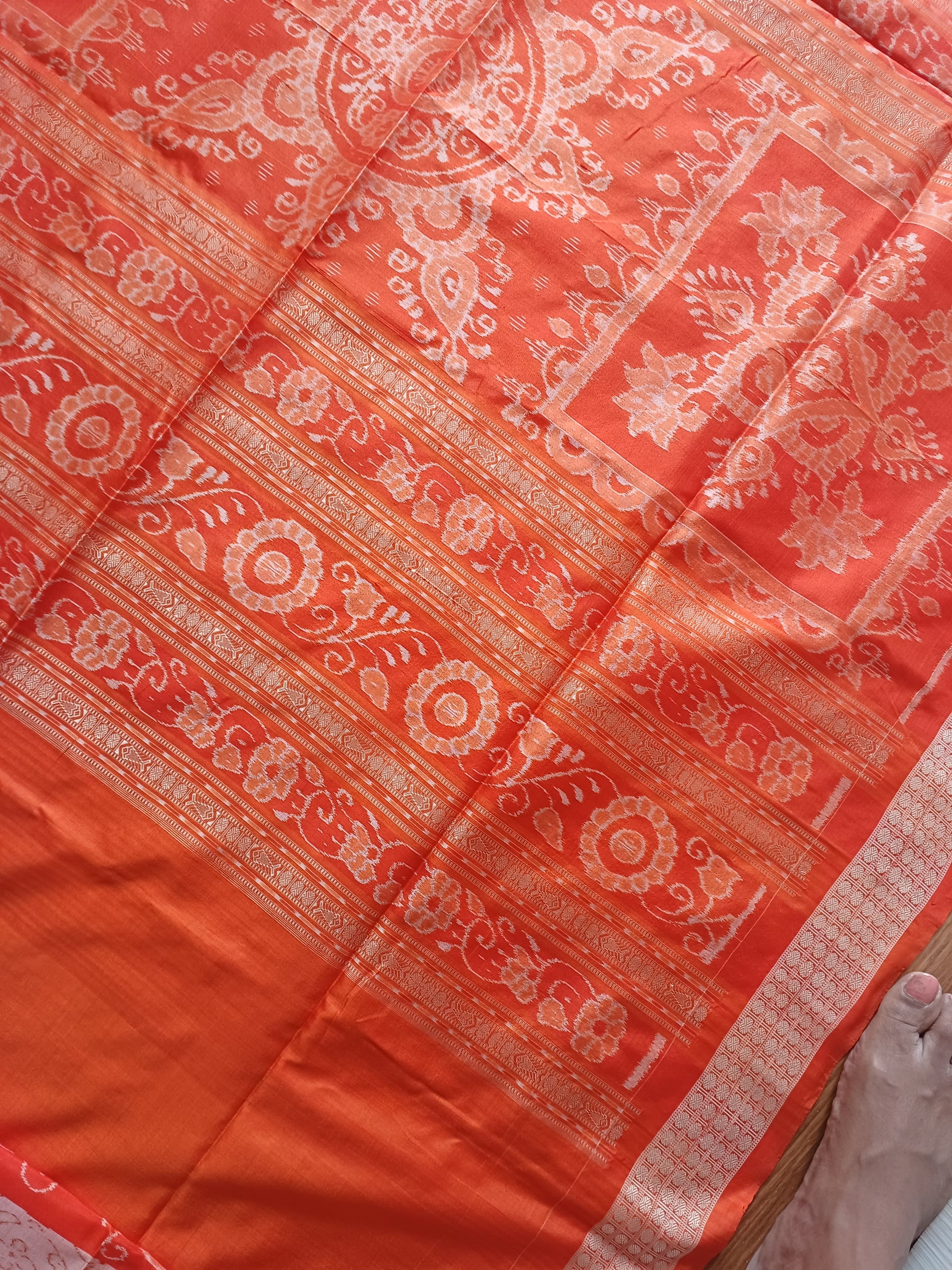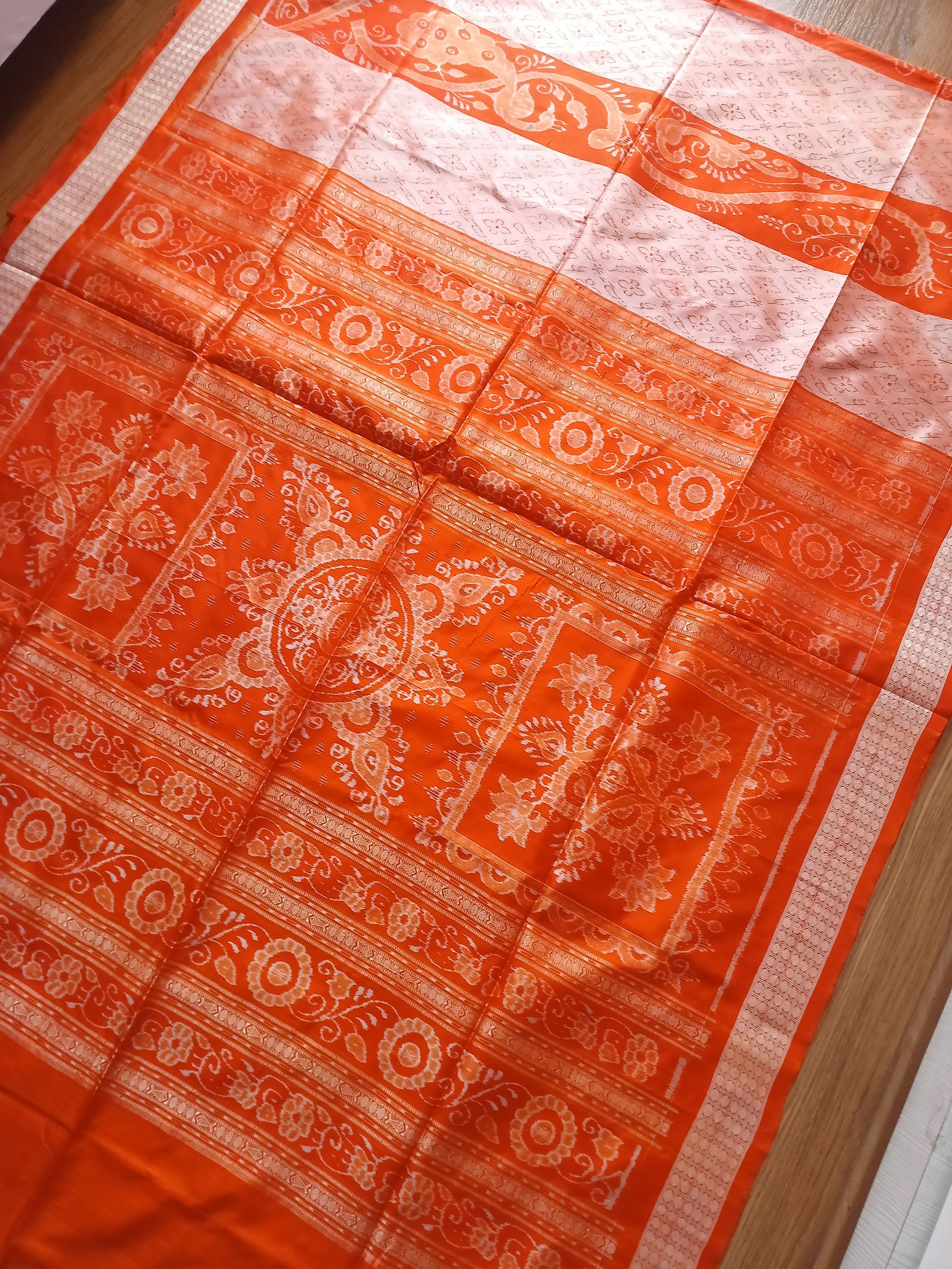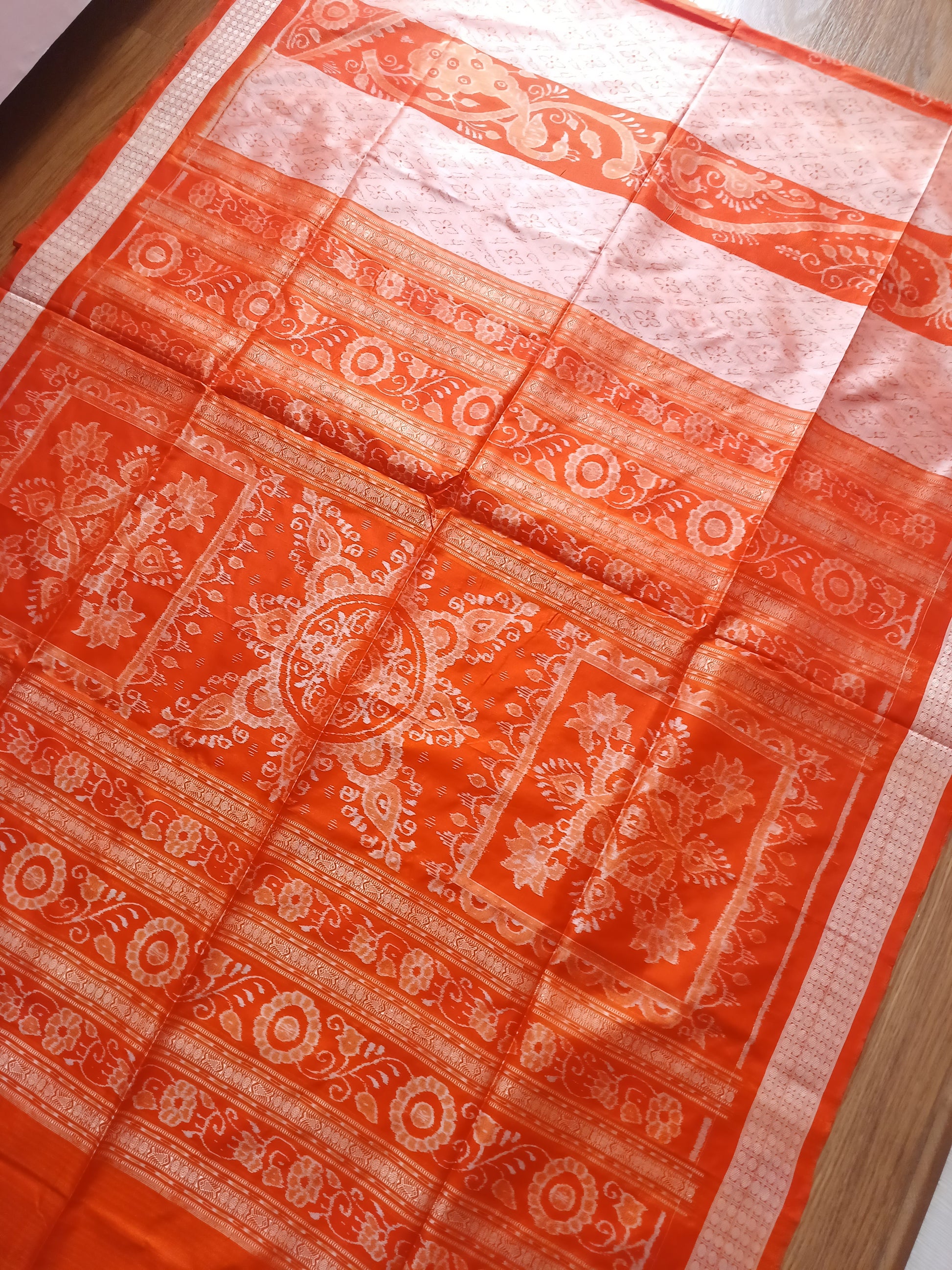 BARGARH MULBERRY IKKAT SILK SAREE - Orange and peach.