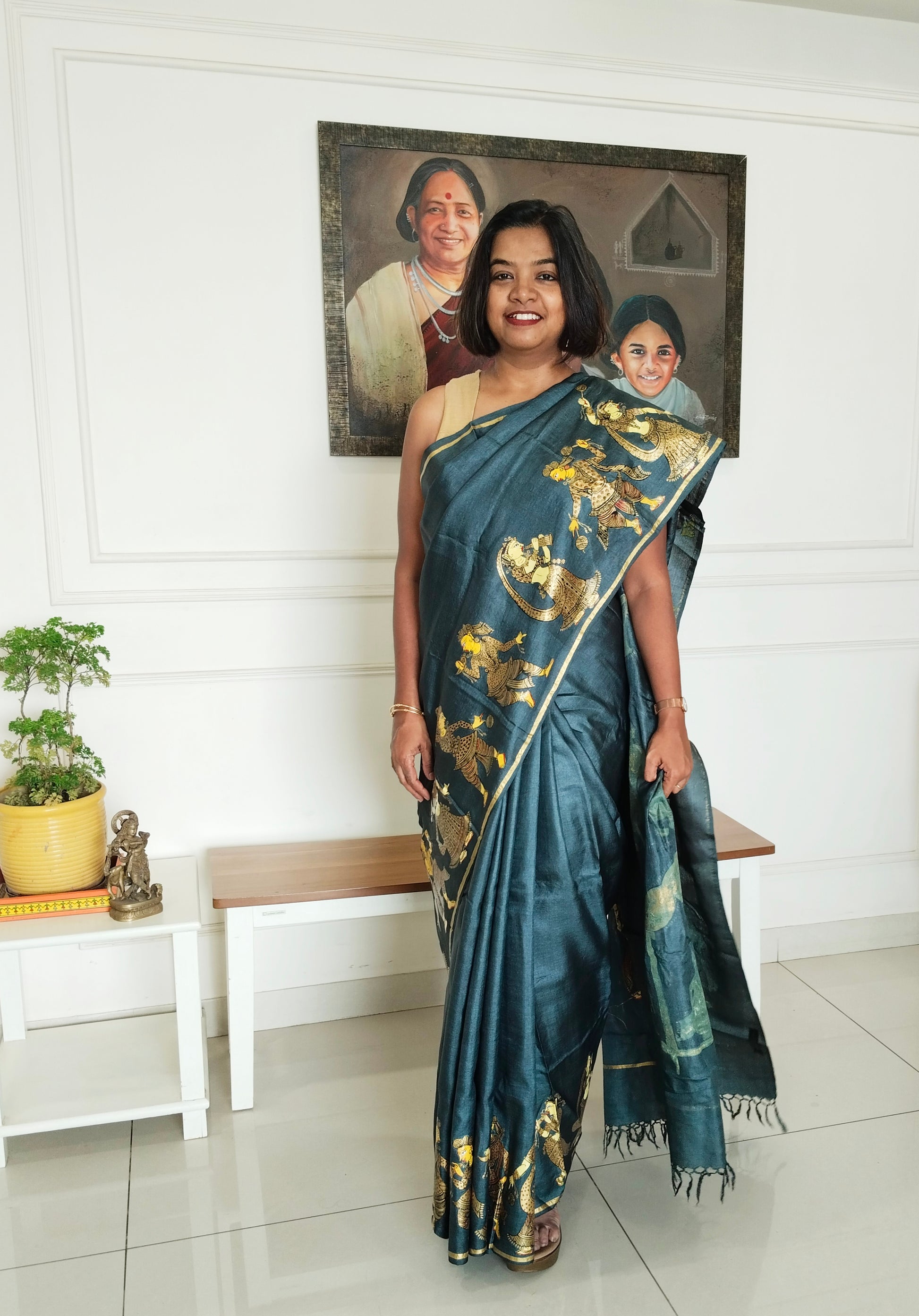 A lovely hand painted Black Gold " The Marriage Procession" Patachitra Saree by one of our women artists.