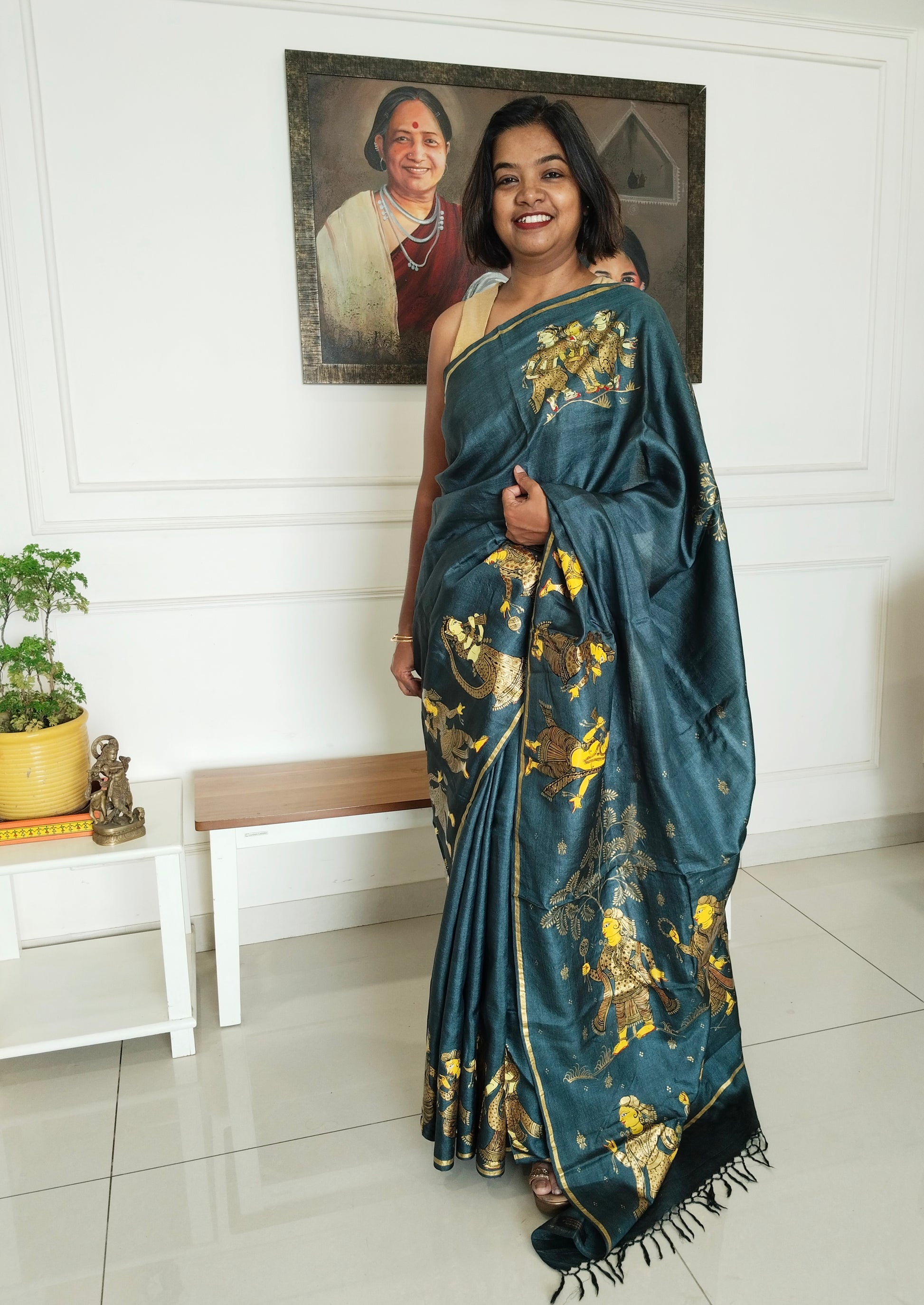 Black Gold Marriage Procession on slate grey Pure Tassar Silk Patachitra Saree.