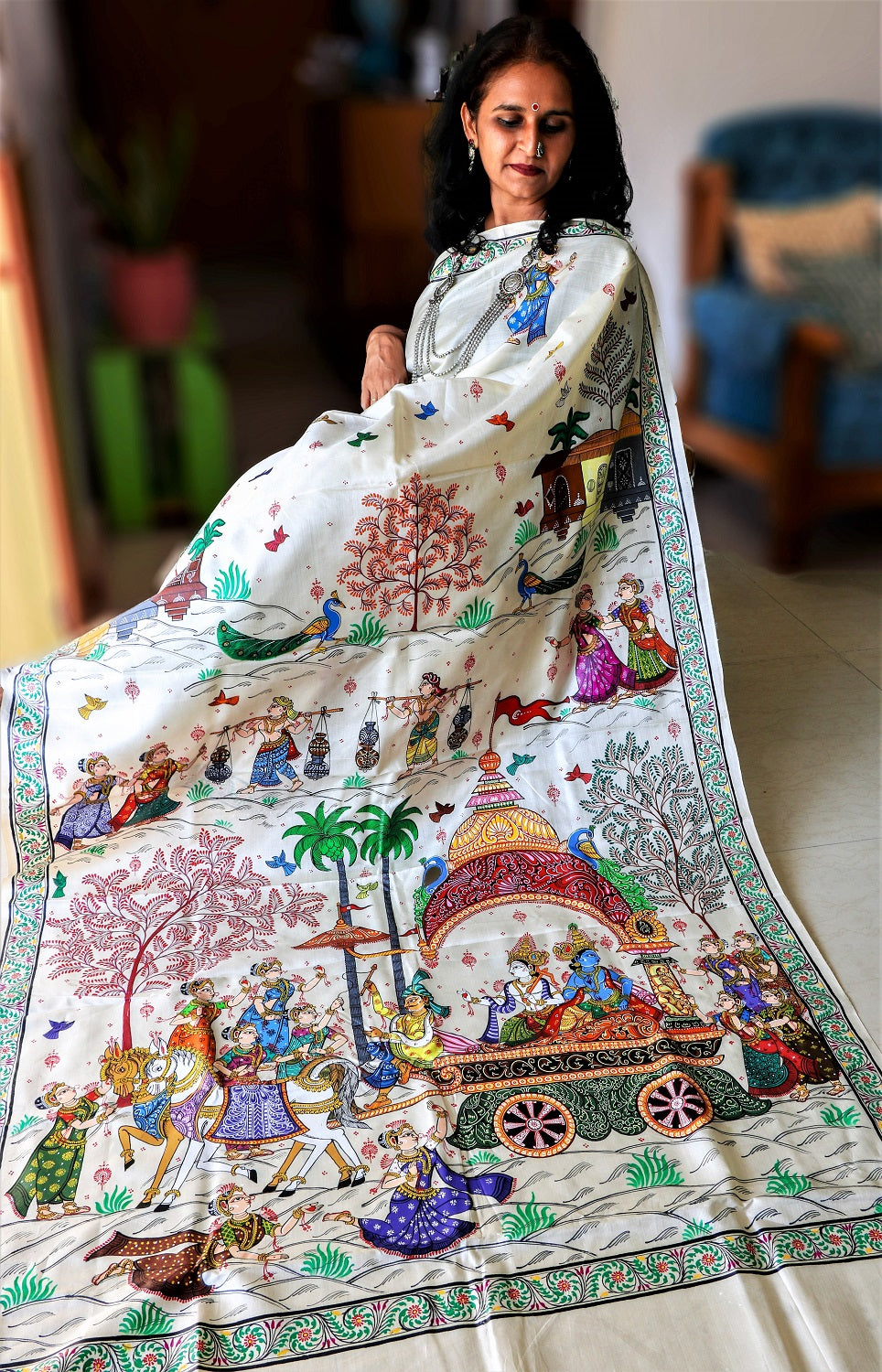 Pure Handwoven hand-painted tassar silk Patachitra Saree – Krishna Mathura Gaman