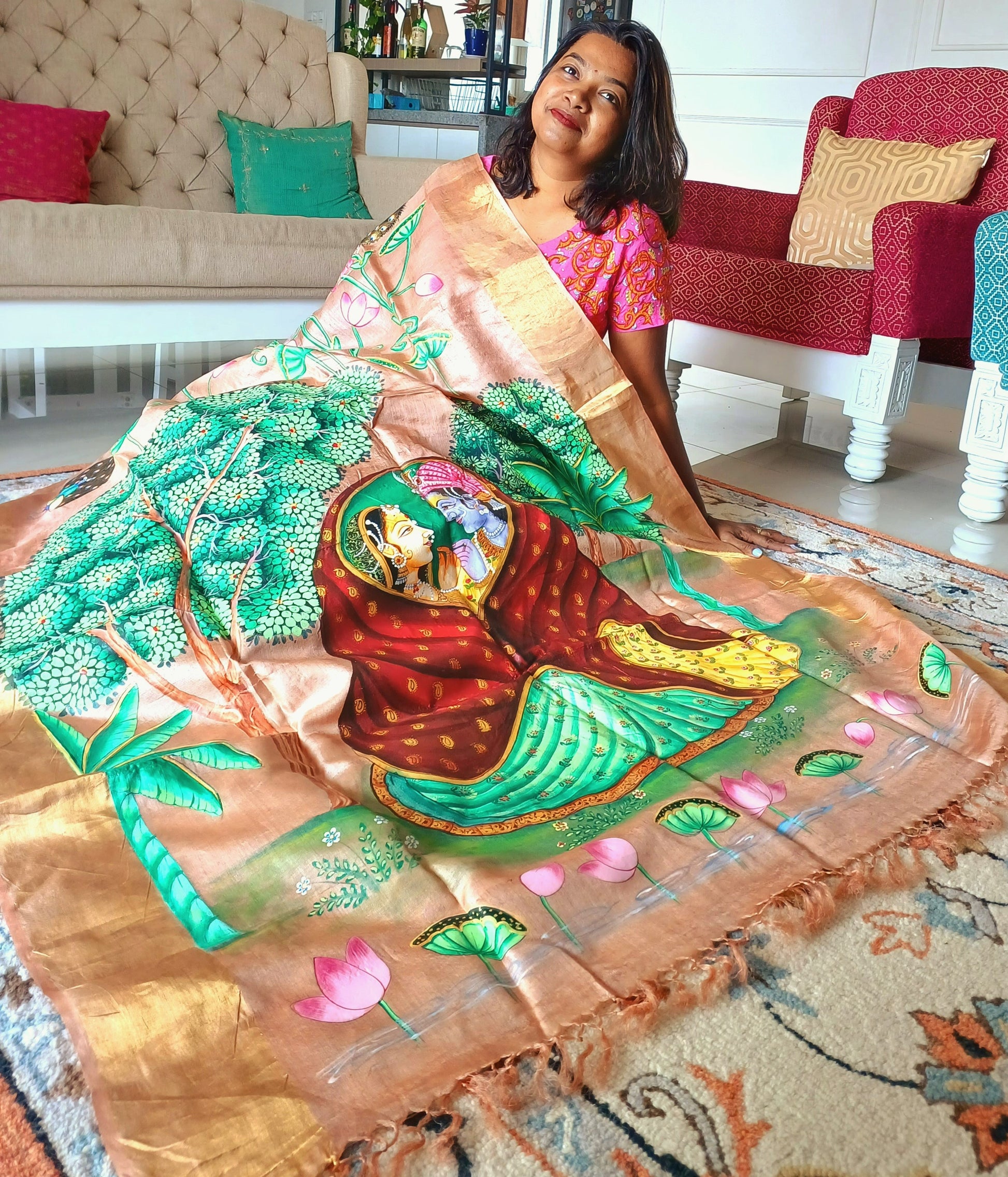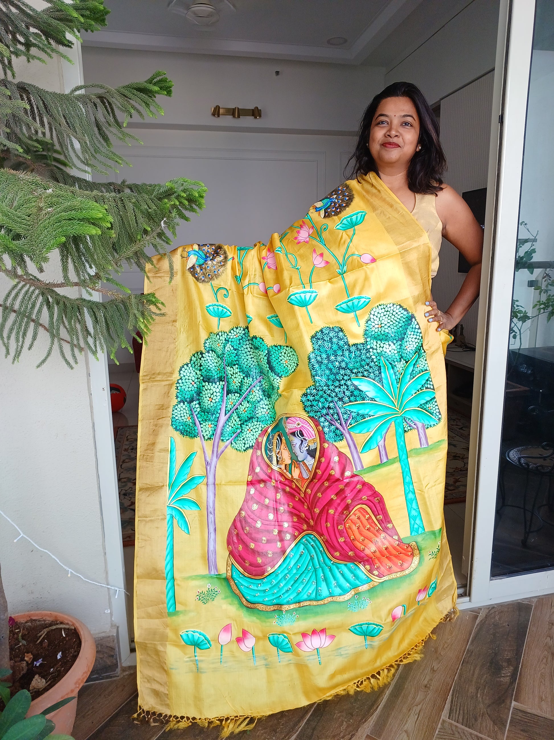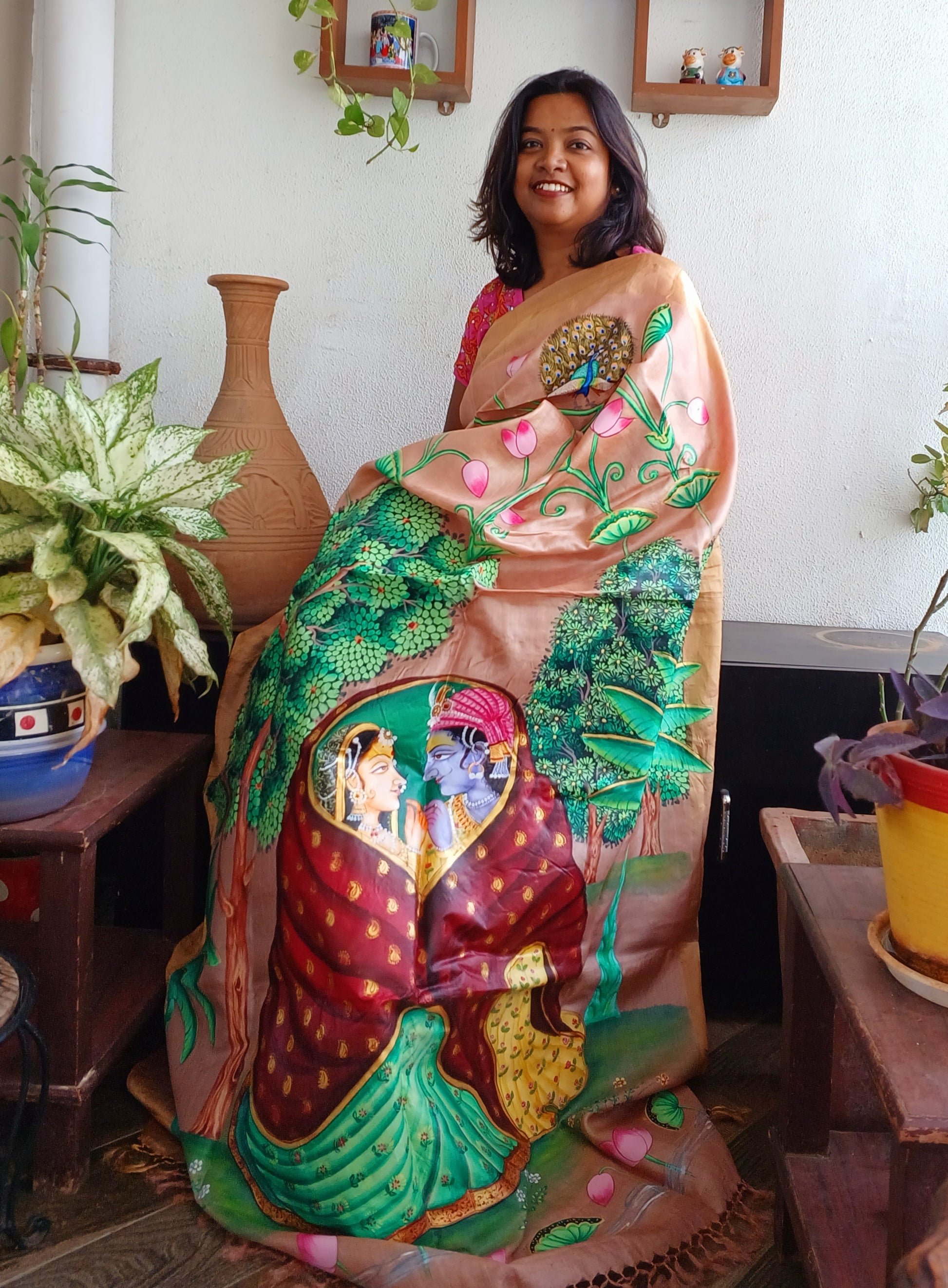 A lovingly Handspun Pure silk saree, hand painted in Pichwai style by one of our folk artist.