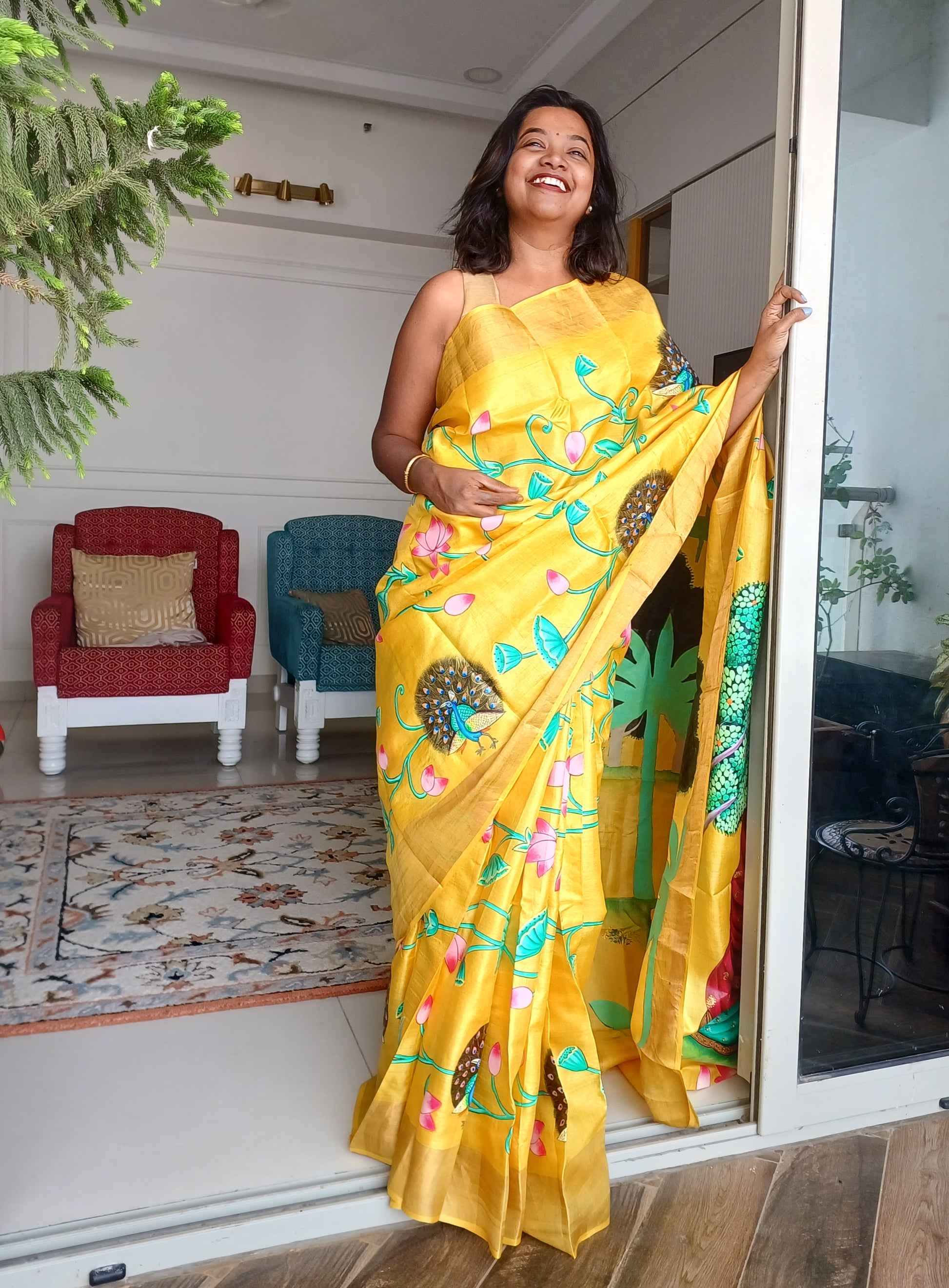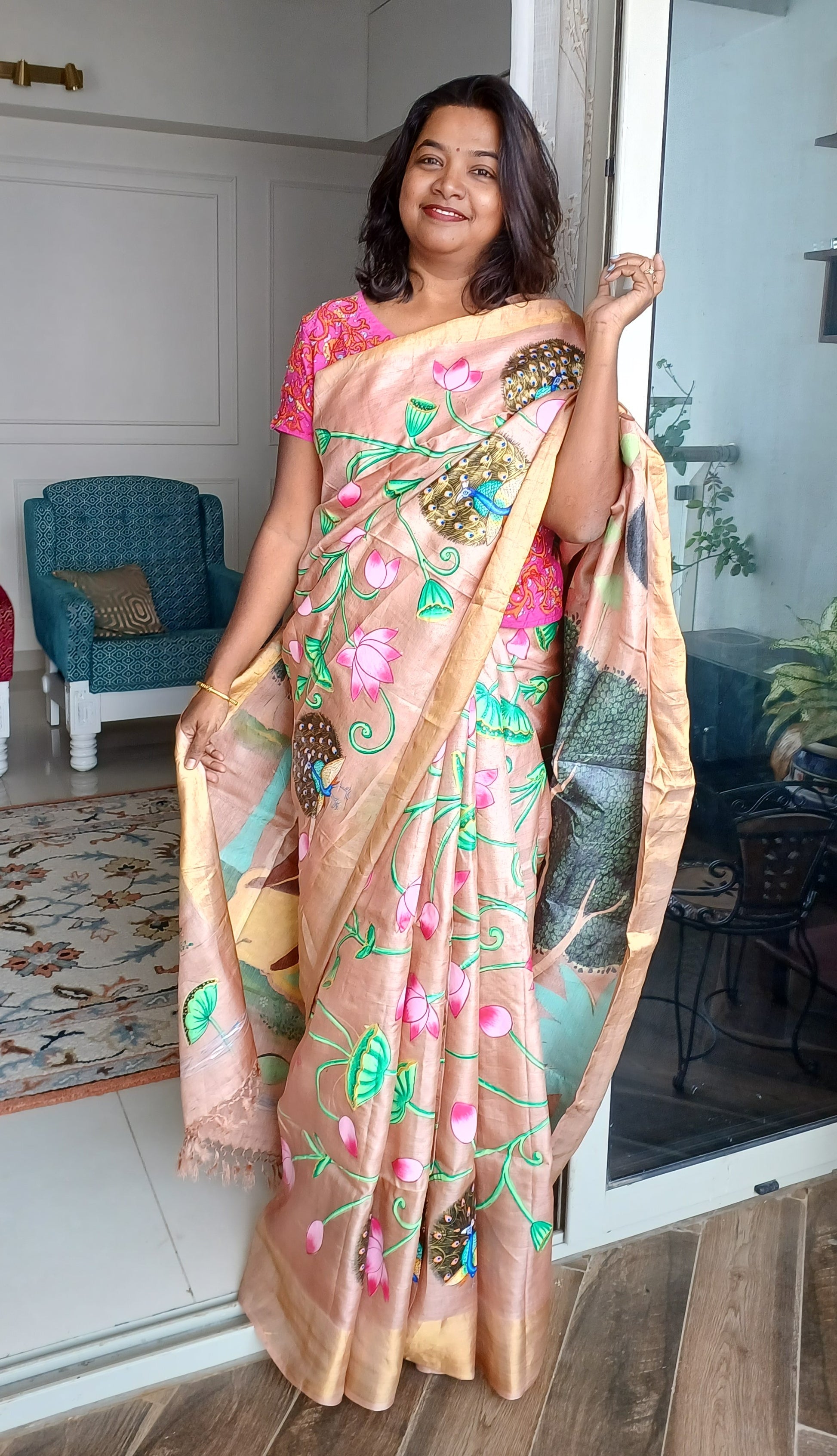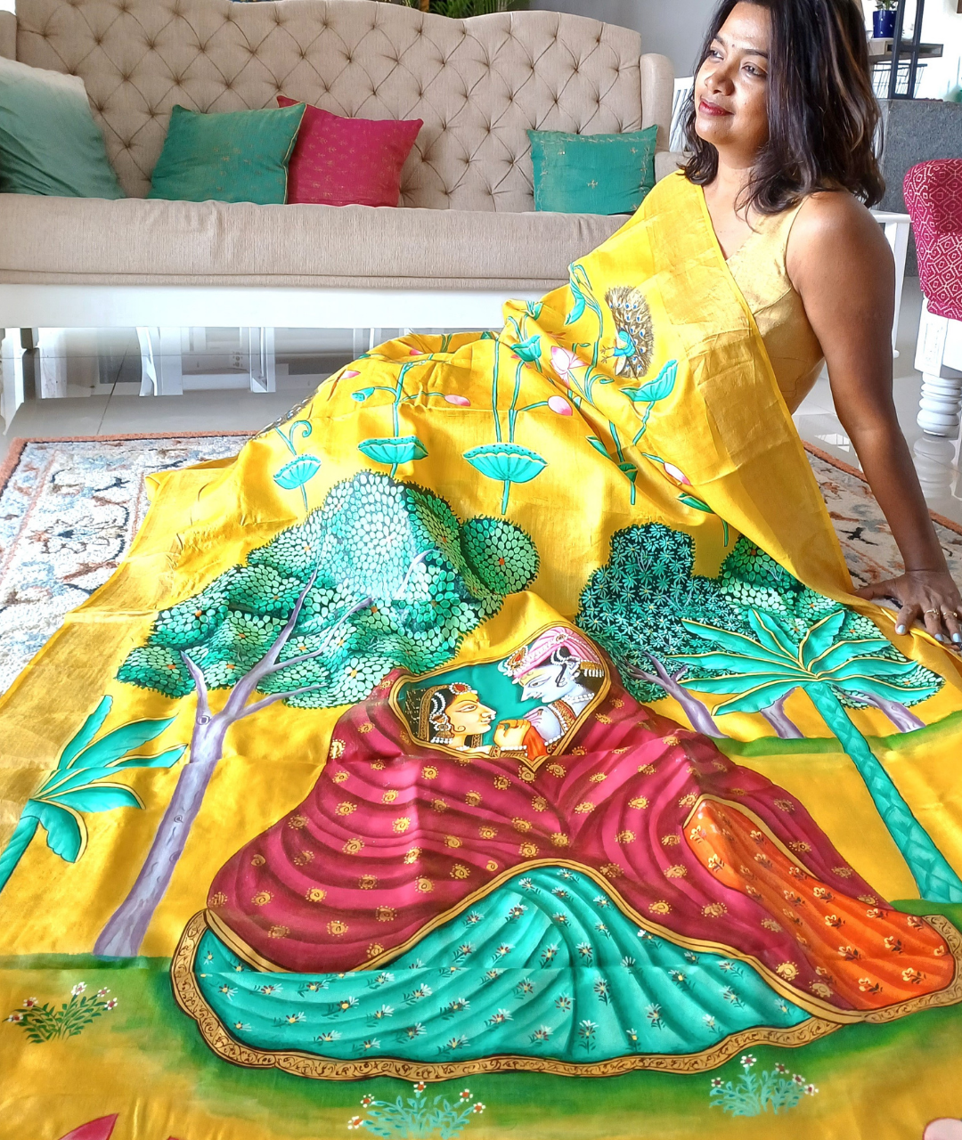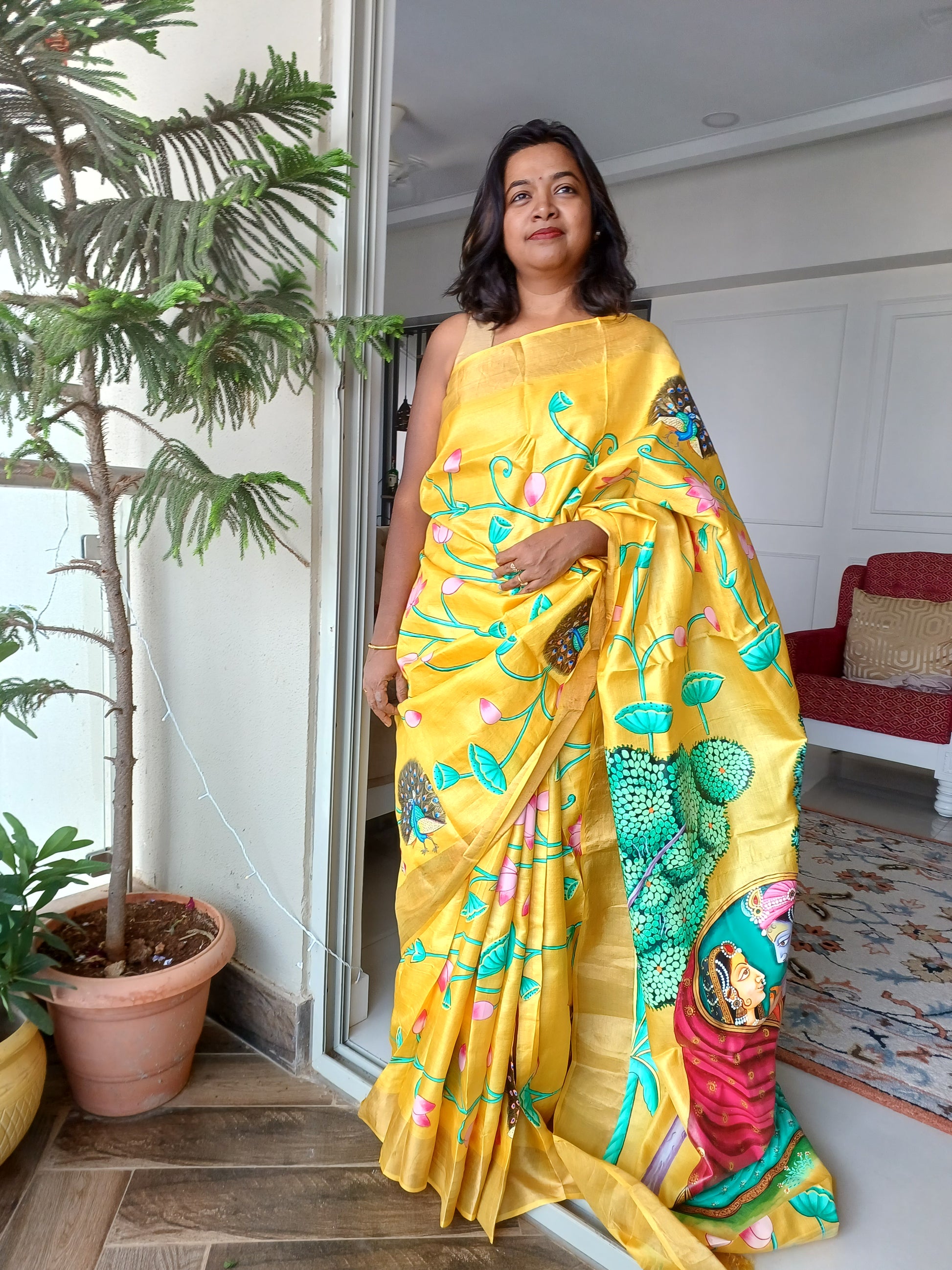A lovingly Handspun Pure silk saree, hand painted in Pichwai style by one of our folk artist.