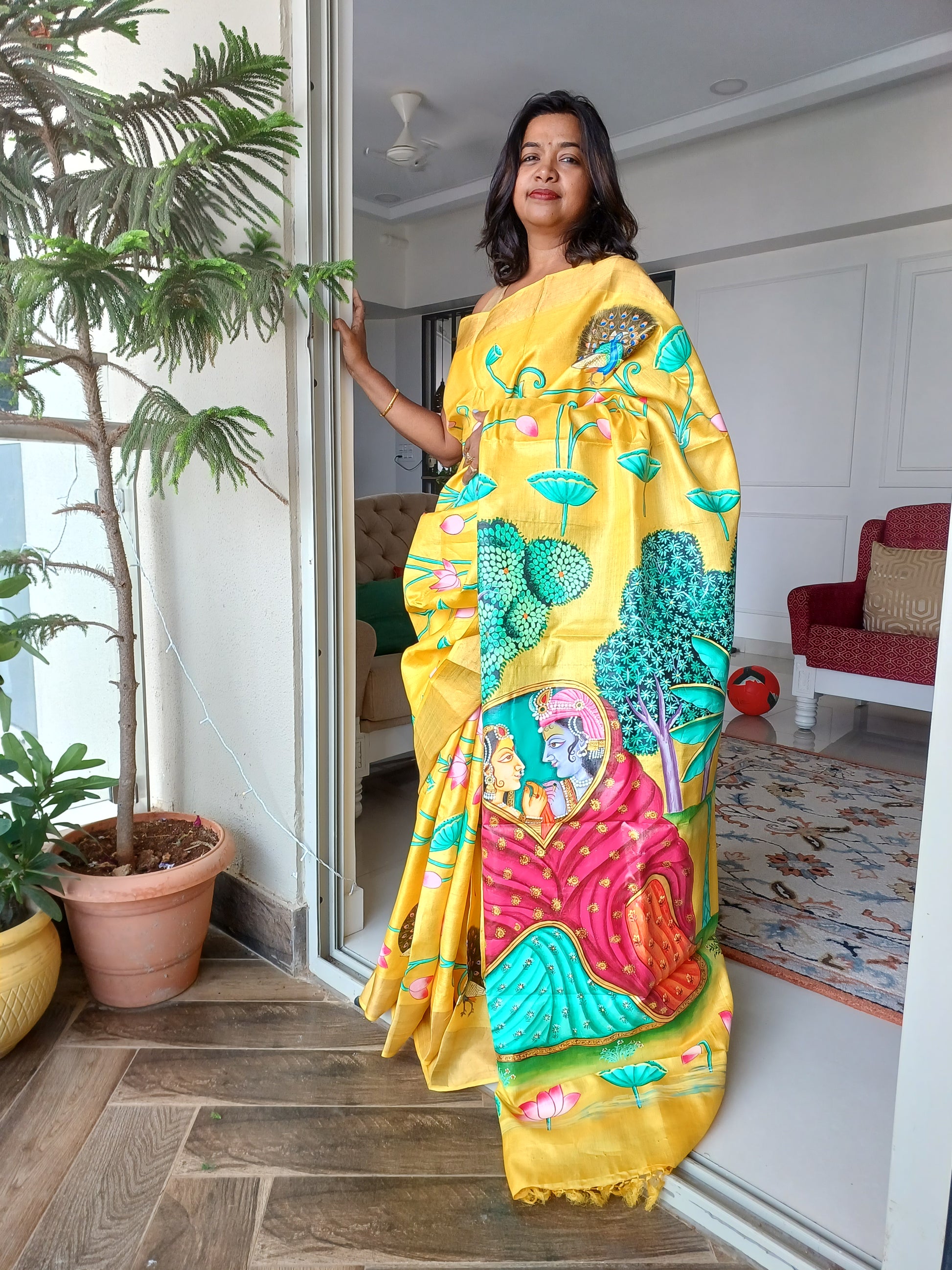Handpainted Sharad Ritu Radha Krishna Pichwai saree in pure tassar - Yellow/Peach