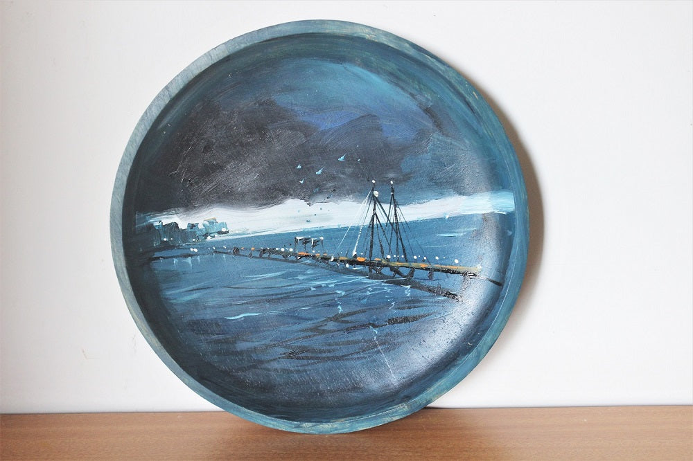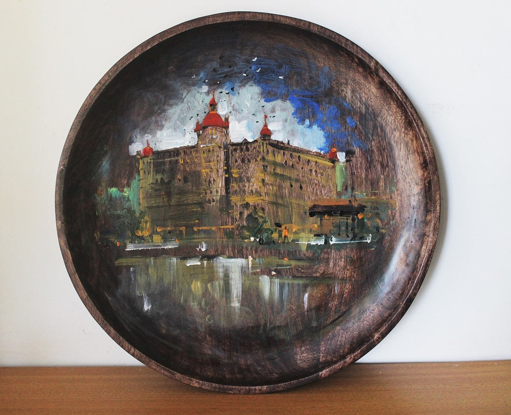 It is 10/12 inches in diameter and has been painted on a plate of mango wood.