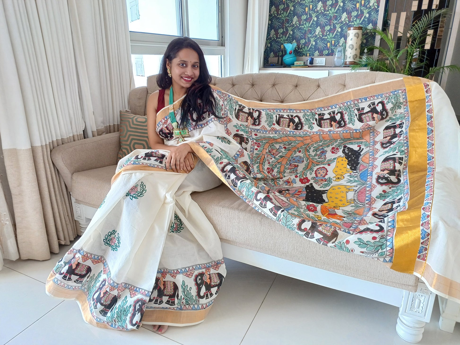 A beautiful hand-painted saree with fish theme and fish borders ,Madhubani on Kerala kasavu with vibrant colors to go on for every occasion.