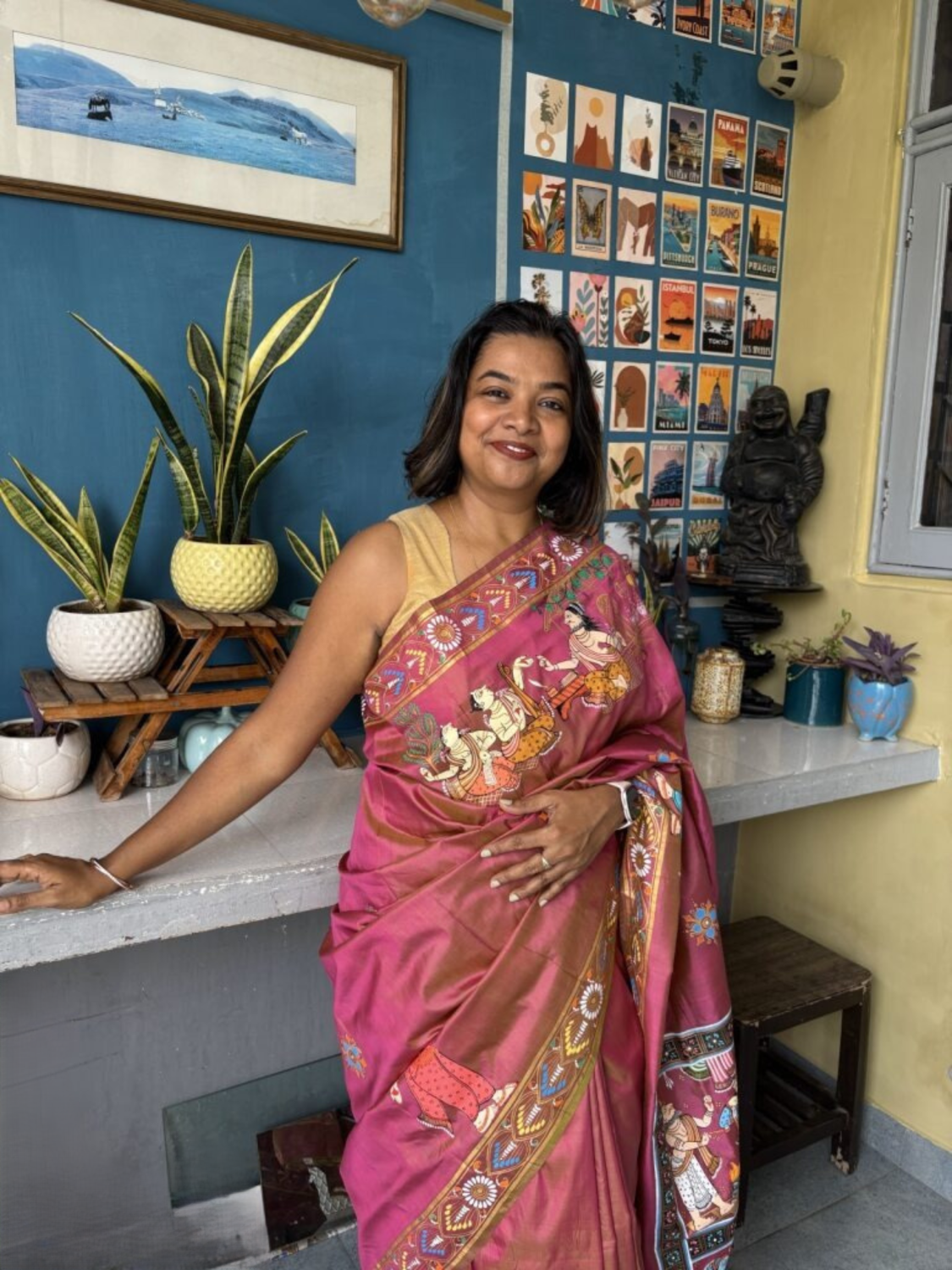Make heads turn and have sure conversation starters with this stunning saree that captures the epic of The Ramayana in the patachitra folk art style.