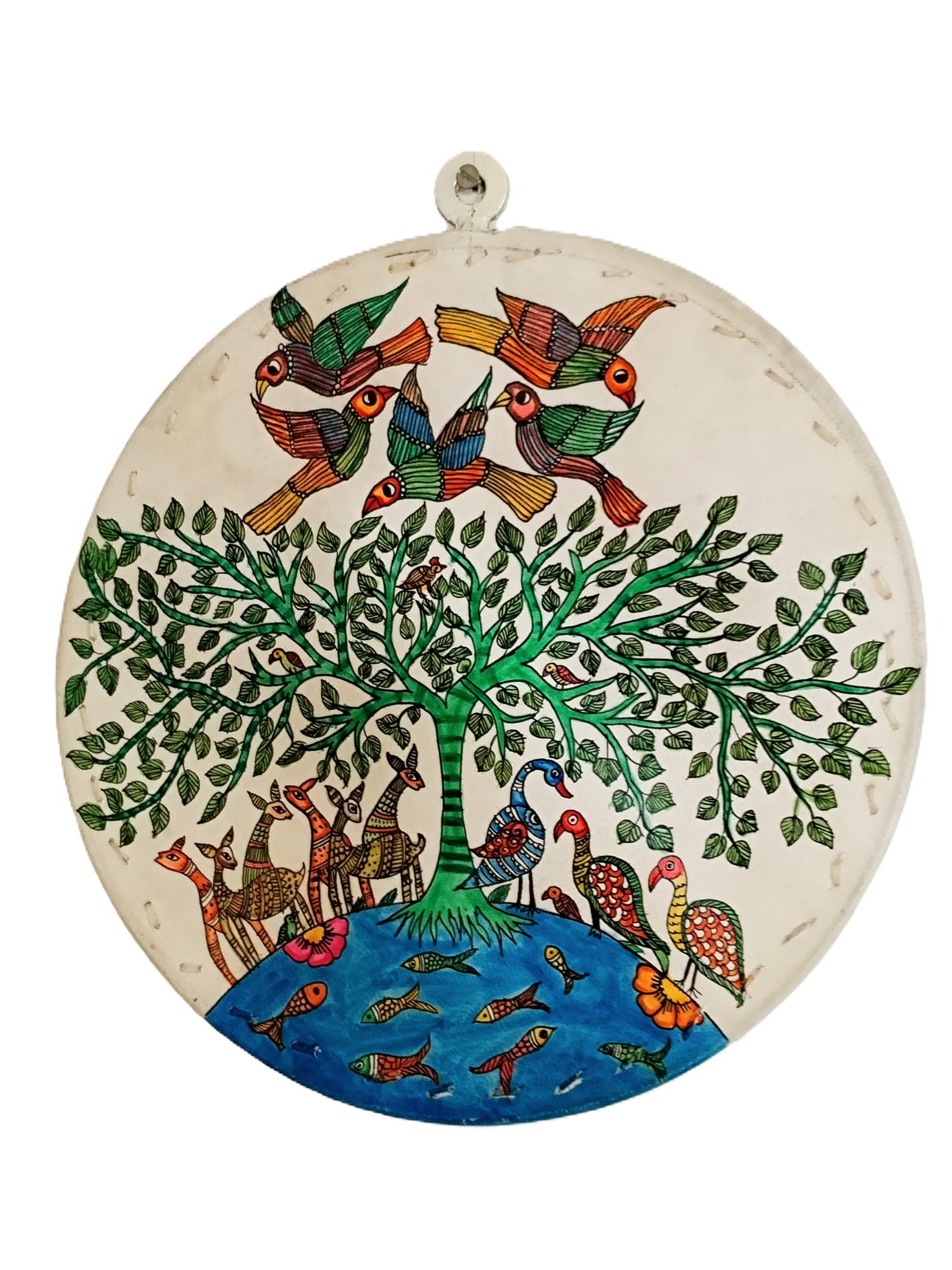 Gond Art Hand-Painted Leather Wall Plate - Tree birds