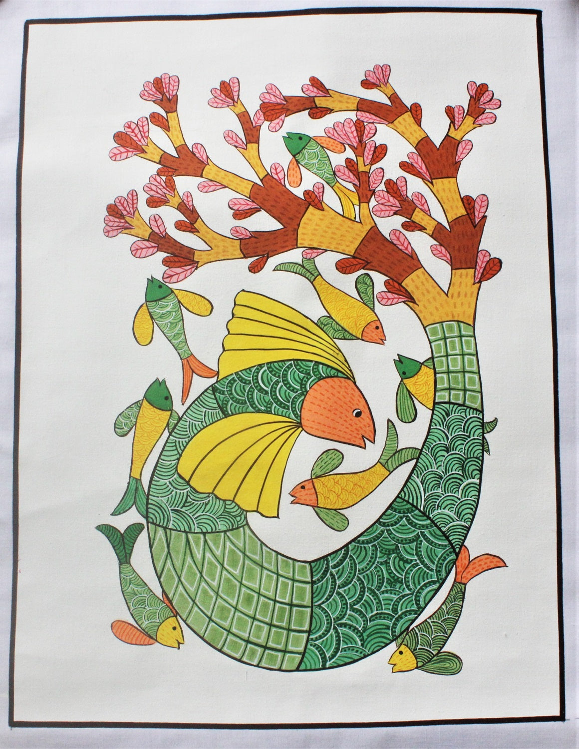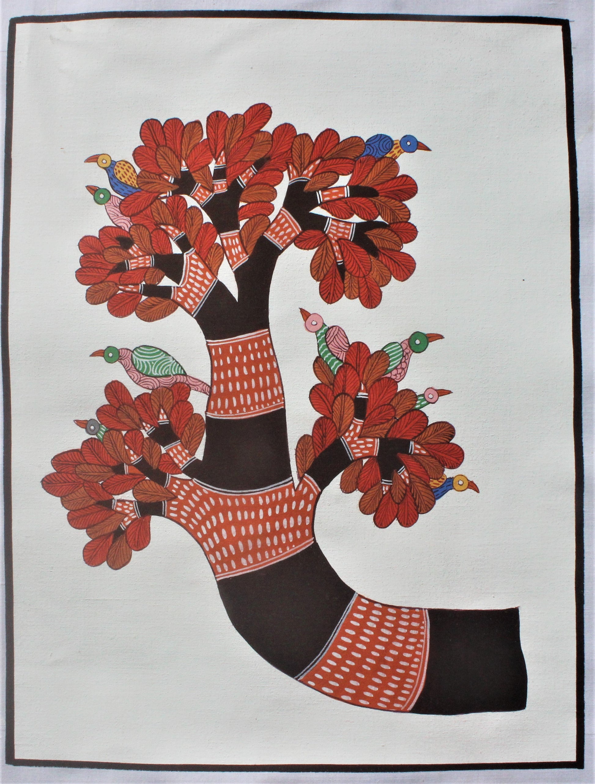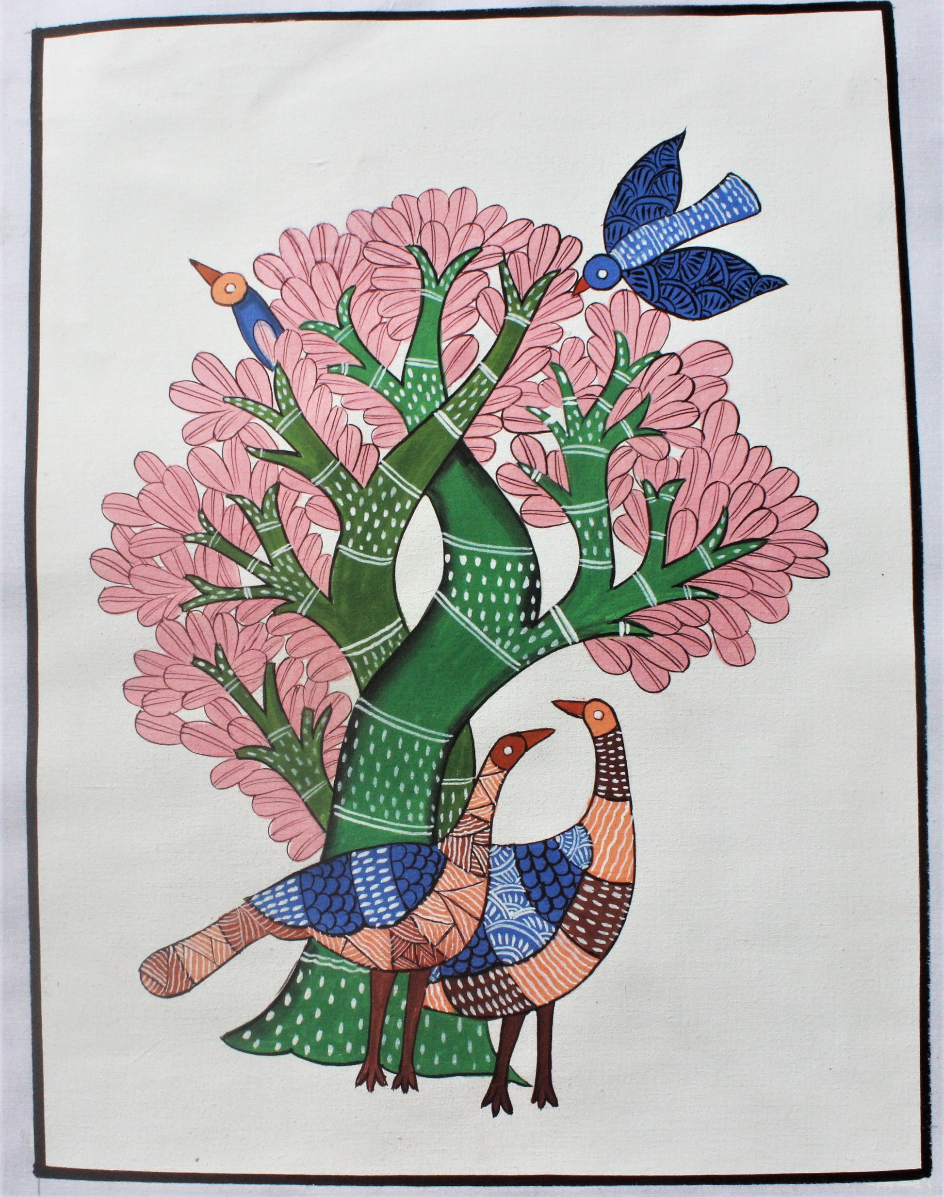 The Gond tribe has its origin in Madhya Pradesh, and derived its name from the word ‘Kond’, meaning “green mountain”. Although Gond art of this tribe is considered to be primarily from Madhya Pradesh, it is also practiced in Andhra Pradesh, Maharashtra, Chhattisgarh, and Odisha. It dates back to more than 1400 years ago to the Mesolithic Period. The Gond people believe that every element of nature, be it the hills, the sky or the trees, is inhabited by a spirit. These paintings are examples of the Gond tribe’s close connection to nature.