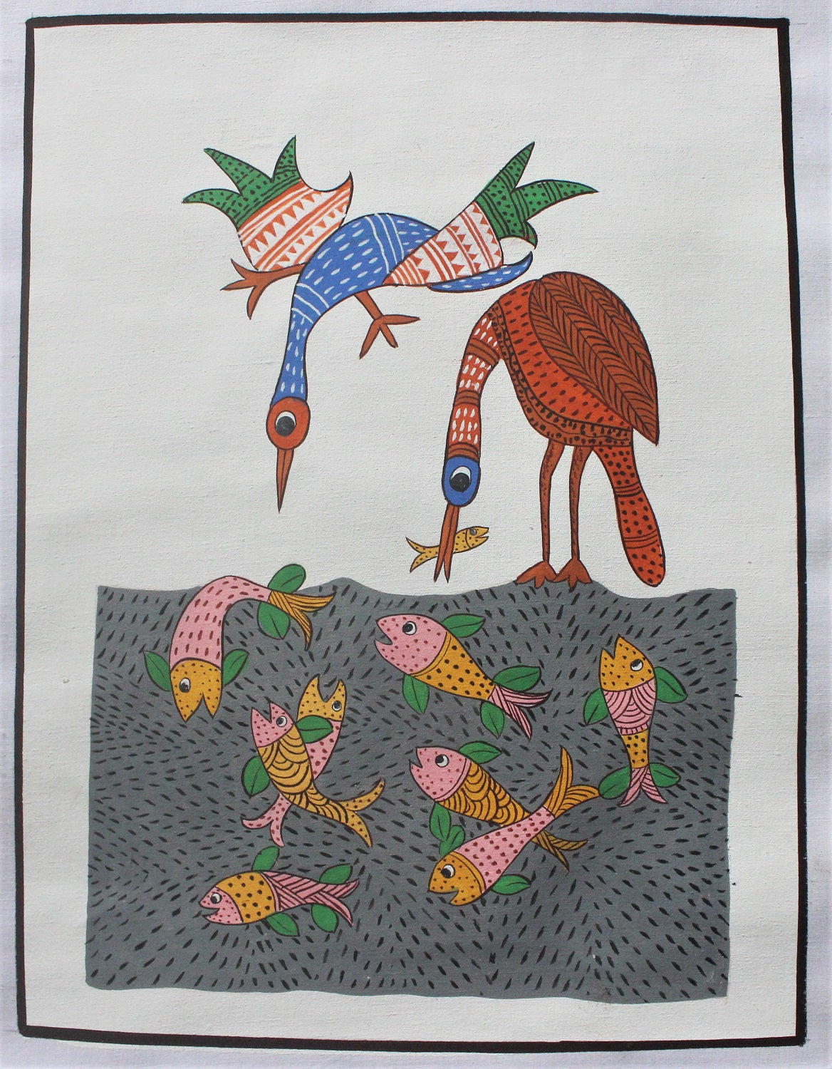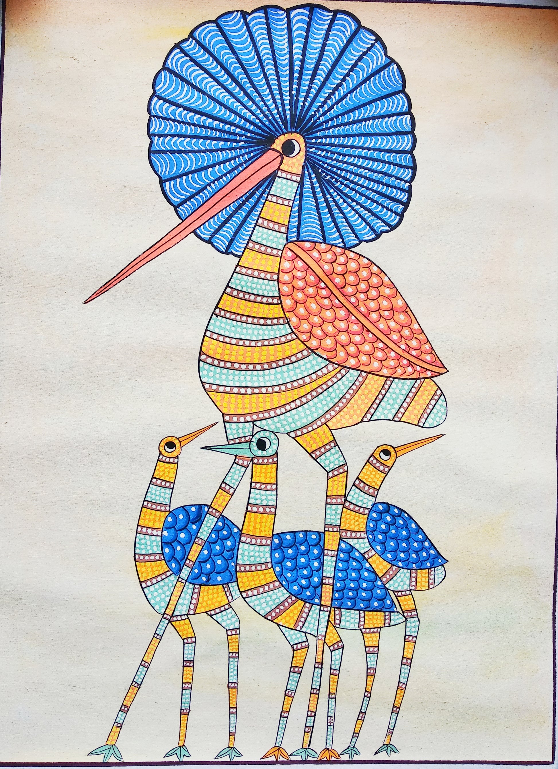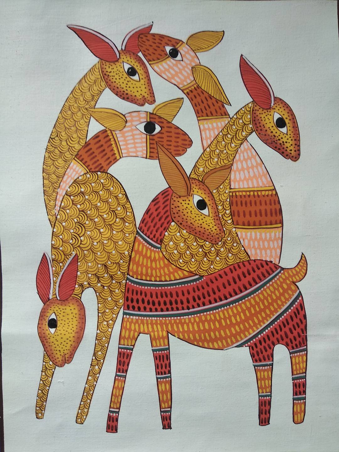 The Gond tribe has its origin in Madhya Pradesh, and derived its name from the word ‘Kond’, meaning “green mountain”. Although Gond art of this tribe is considered to be primarily from Madhya Pradesh, it is also practiced in Andhra Pradesh, Maharashtra, Chhattisgarh, and Odisha. It dates back to more than 1400 years ago to the Mesolithic Period. The Gond people believe that every element of nature, be it the hills, the sky or the trees, is inhabited by a spirit. These paintings are examples of the Gond tribe’s close connection to nature.