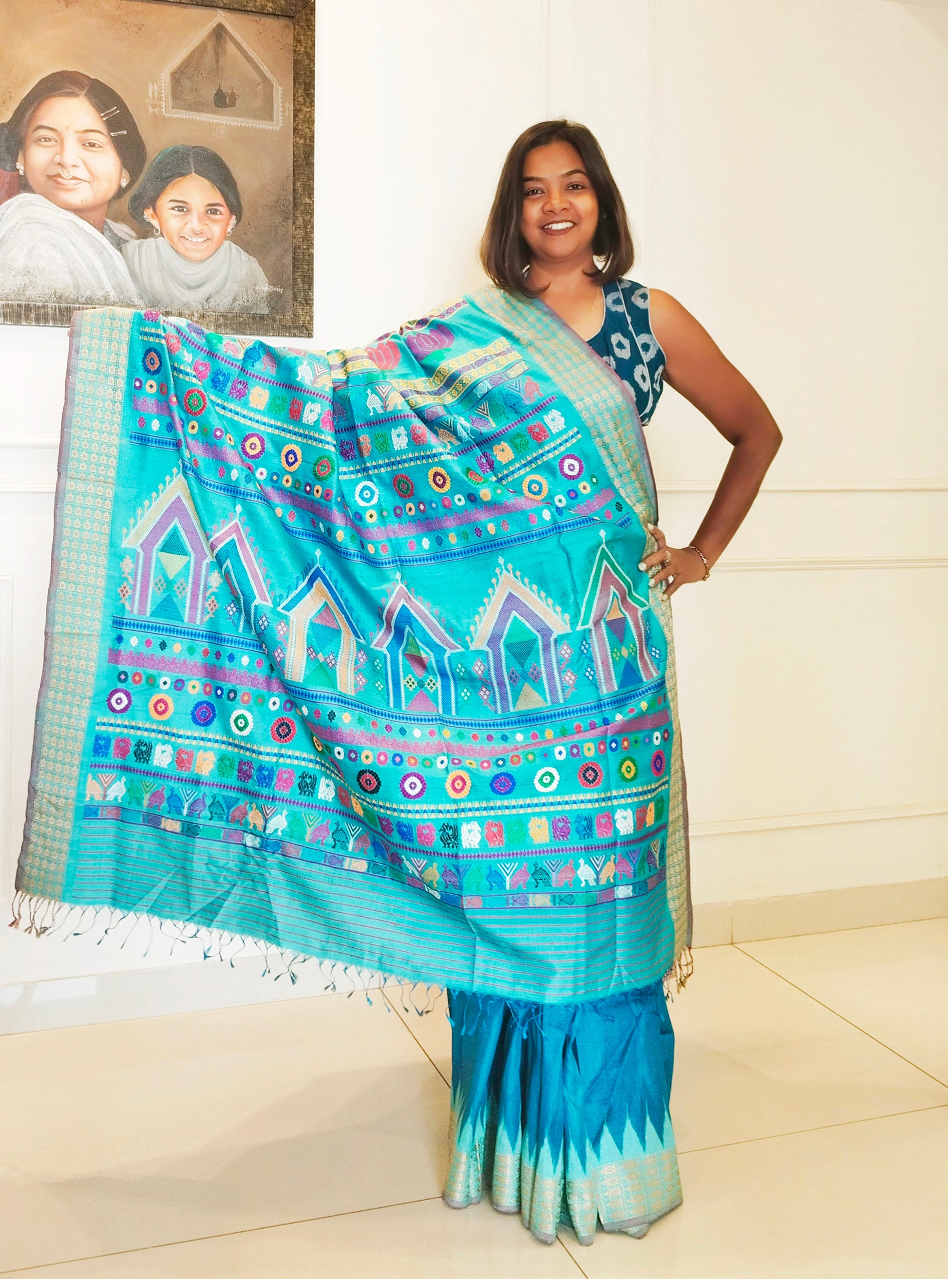 This is an exquisite dolabedi tassar silk saree in electric blue with a stunning dolby tortoise border in muted gold.