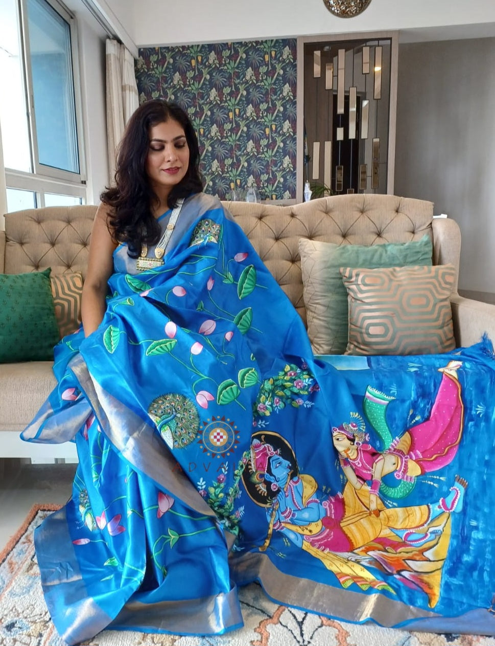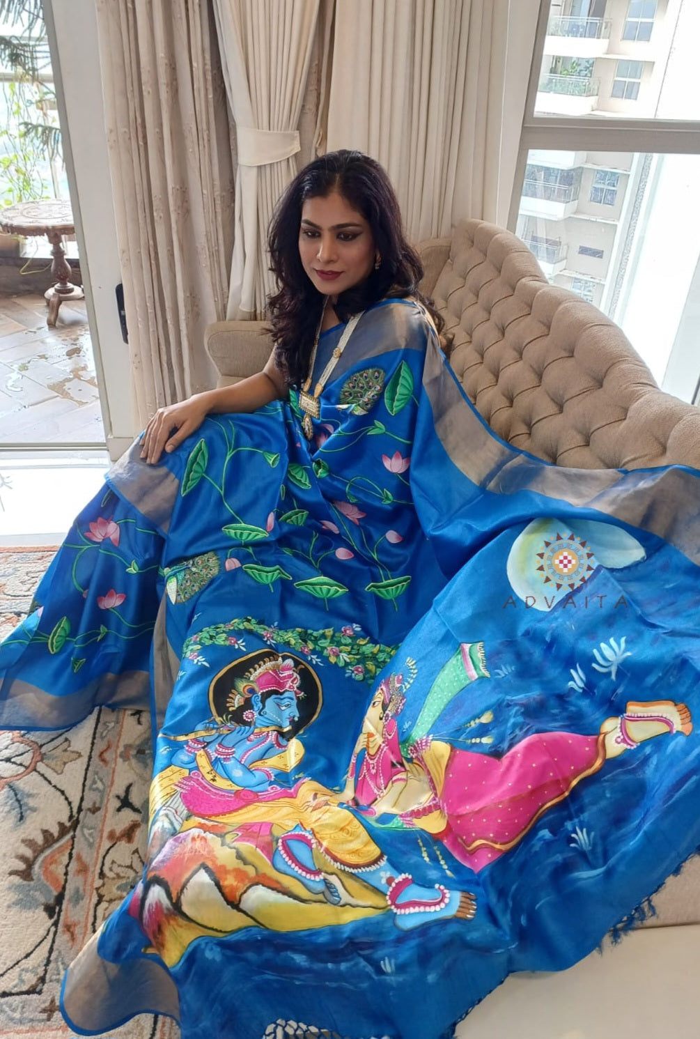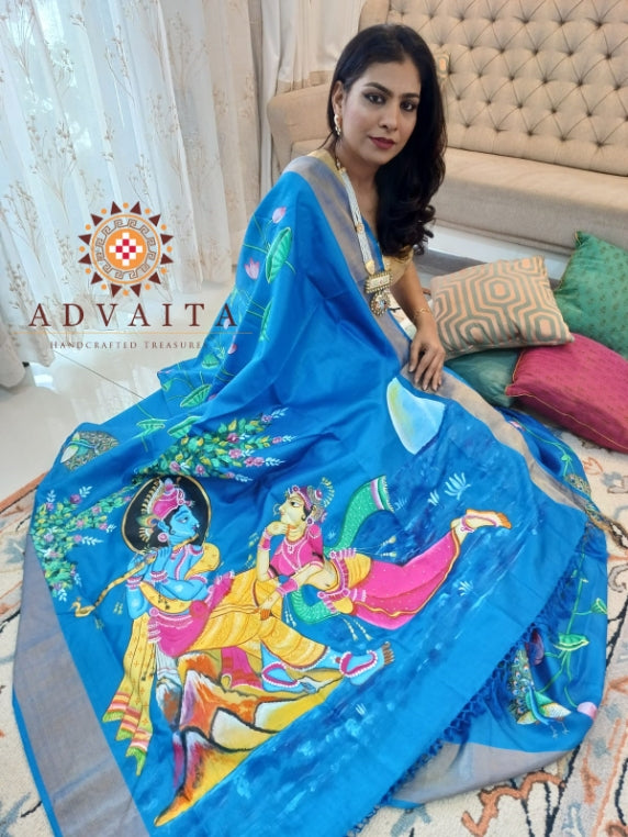 Hand-painted Radha Krishna Saree in pure tassar - Blue