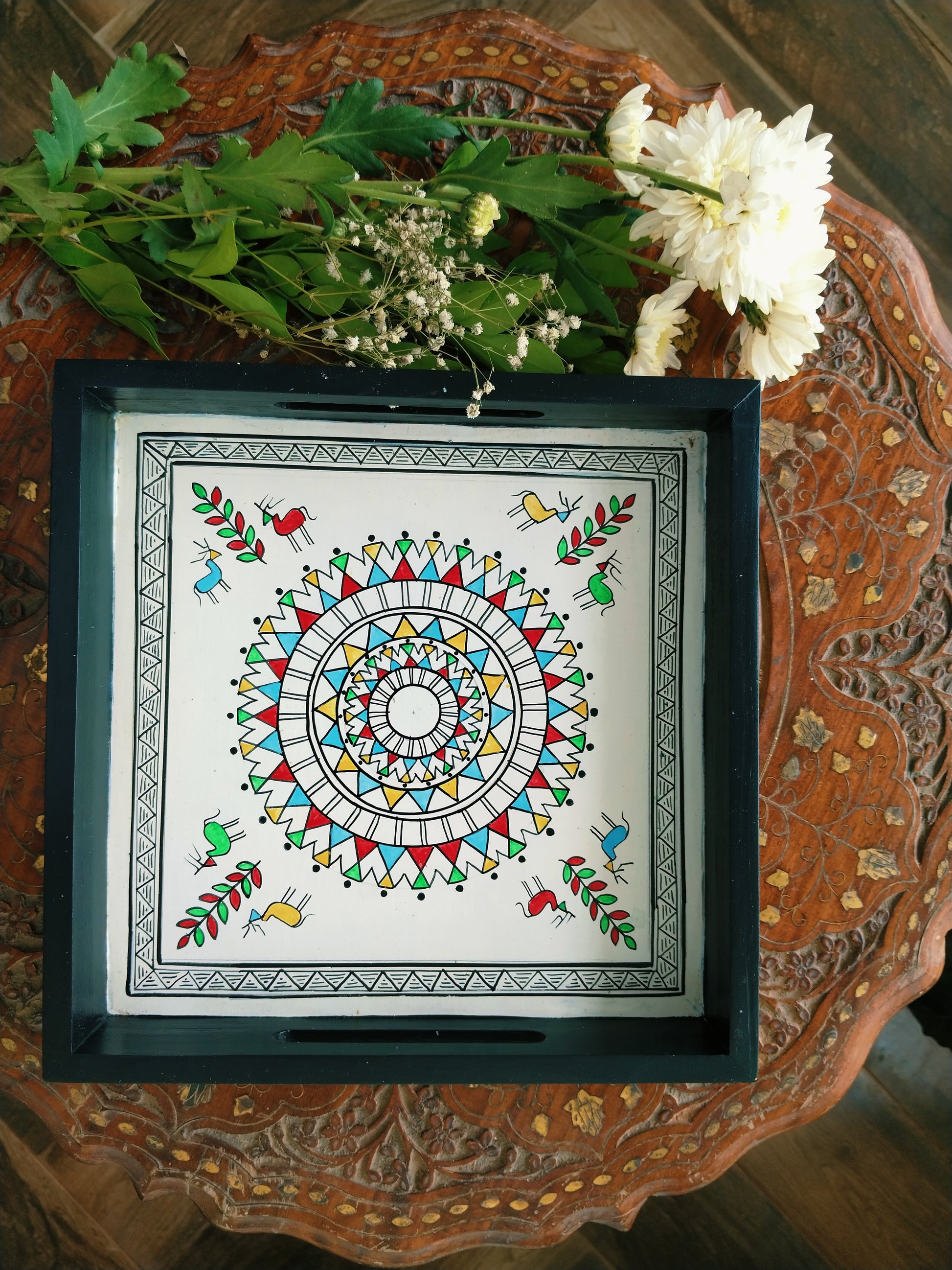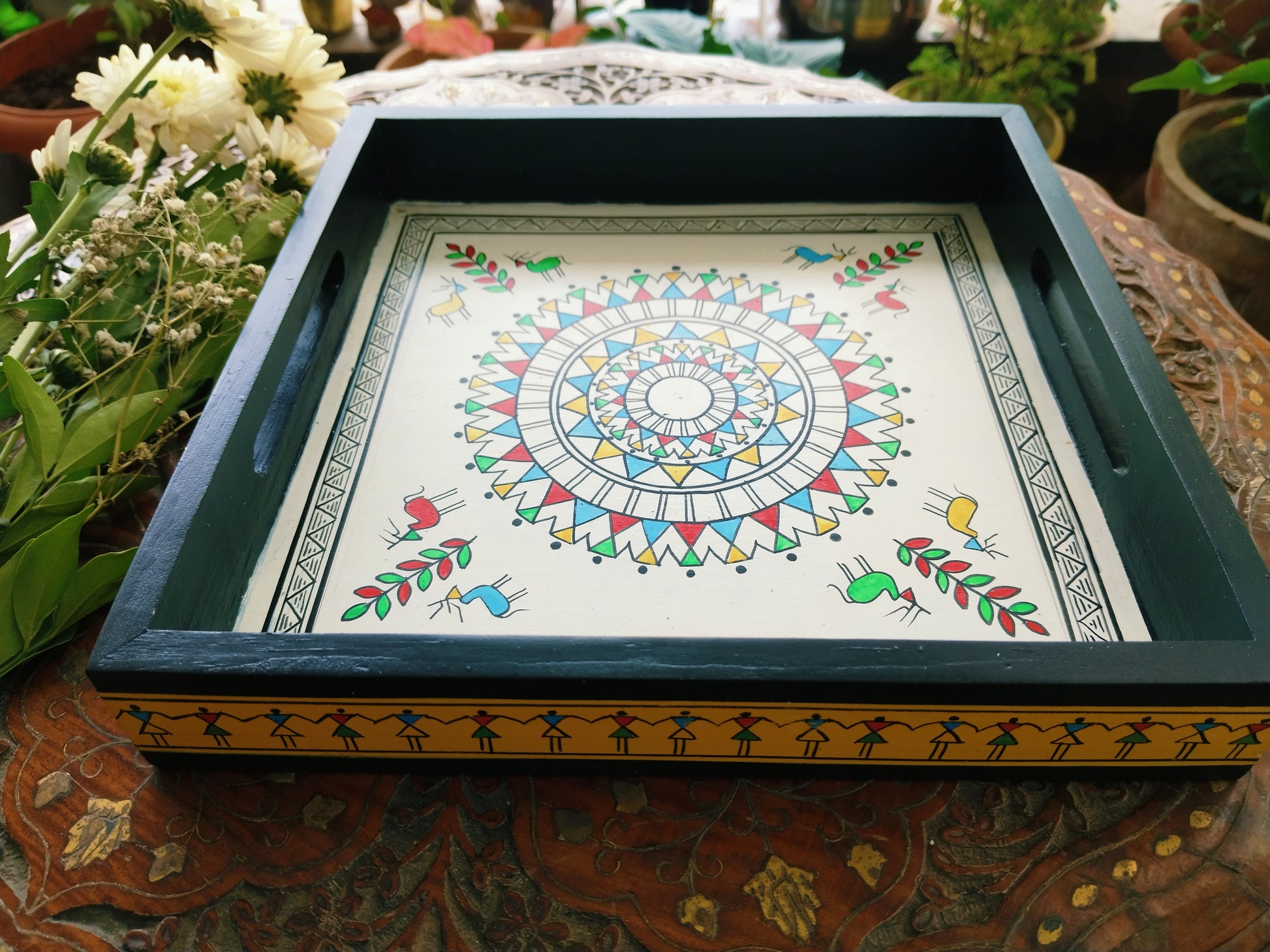 Here's another bright hand painted tribal Black serving tray in the tribal saura art theme.
