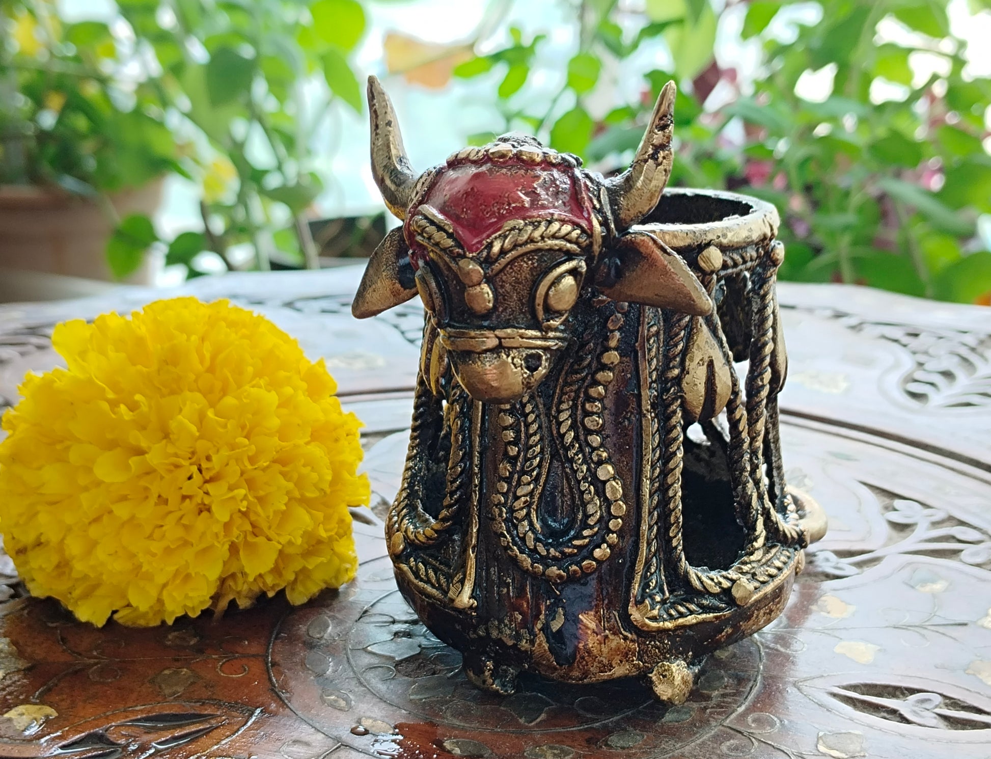 Handcrafted Dhokra Art Brass - Colored Bull Head Pen Holder