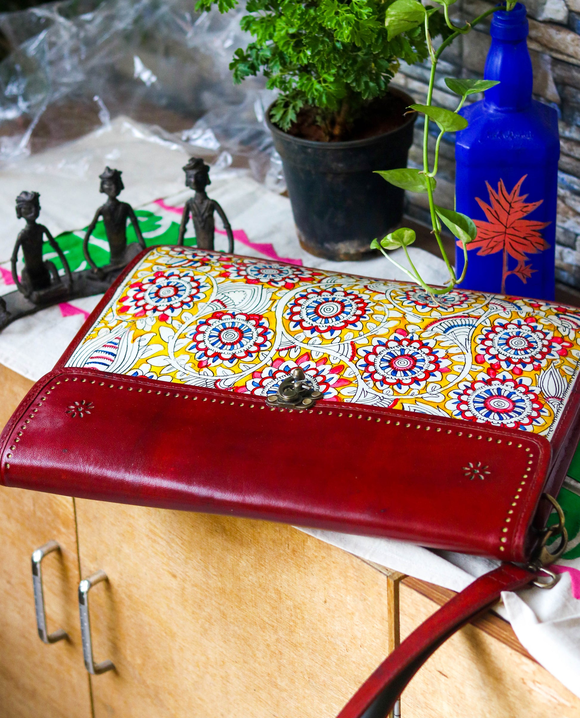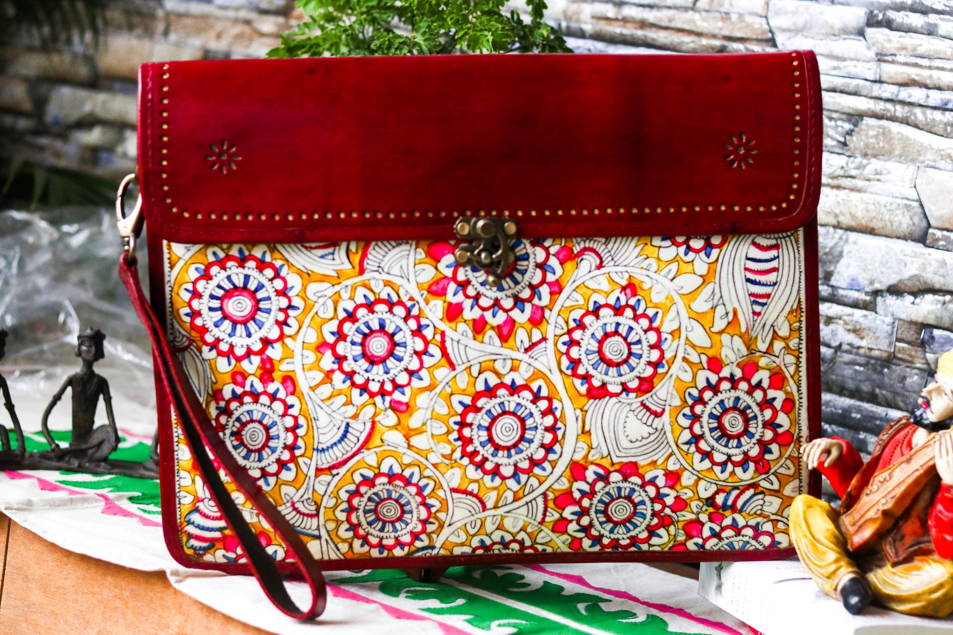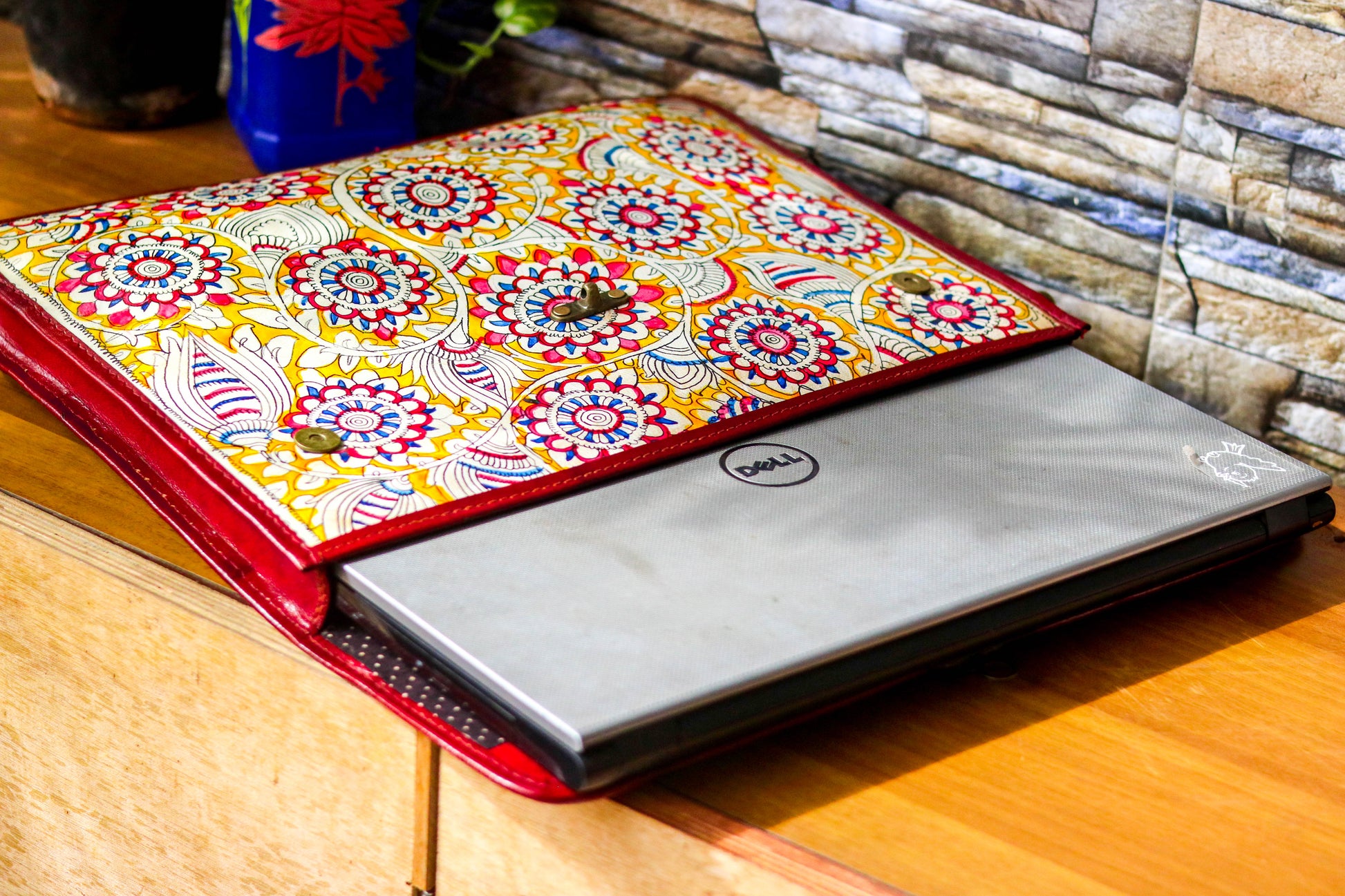 A handcrafted laptop sleeve that is elegant and chic in design. Genuine leather embellished with a patch of hand-painted leather in tholu folk art on the side gives it a color pop as design twist.