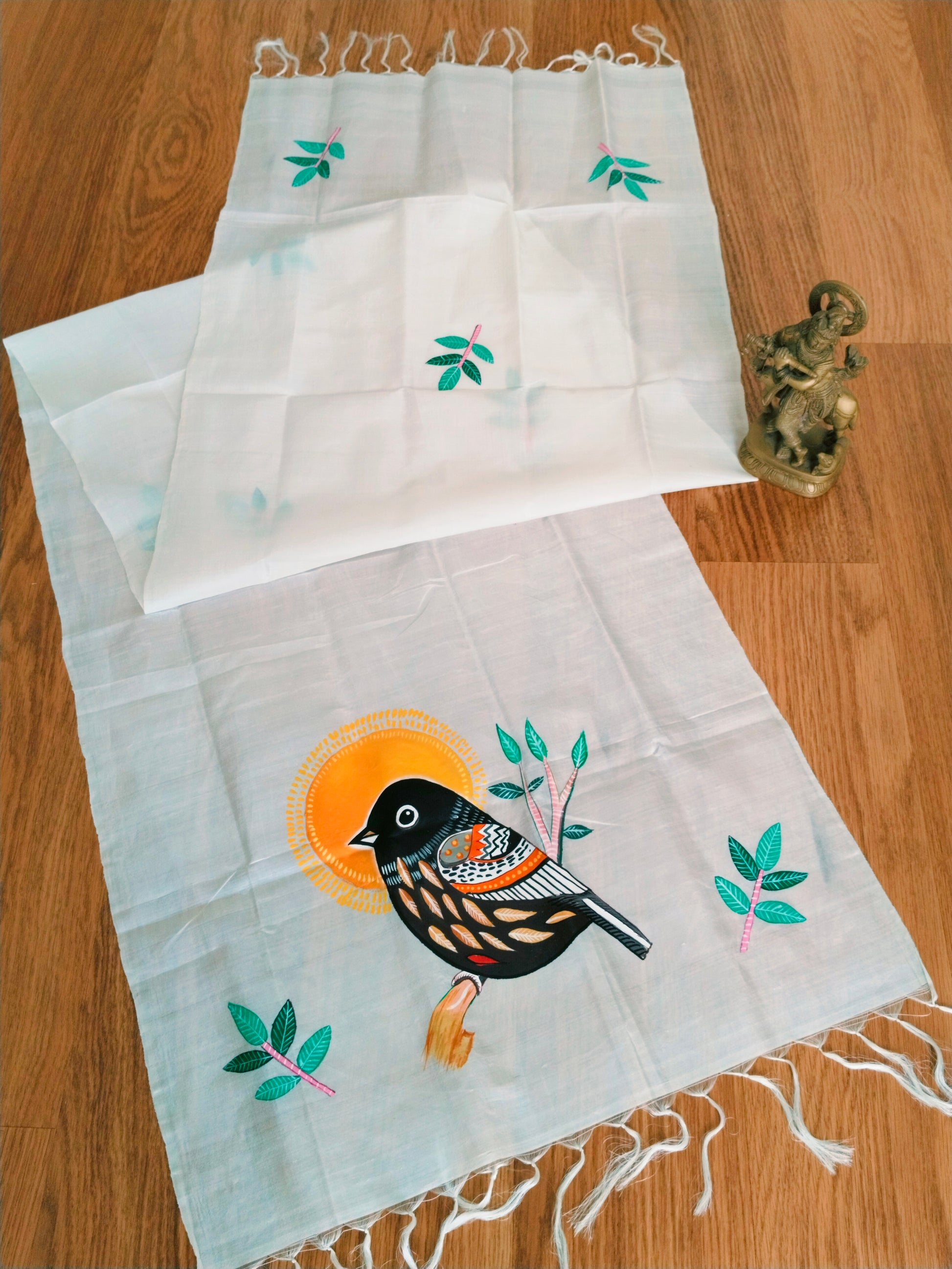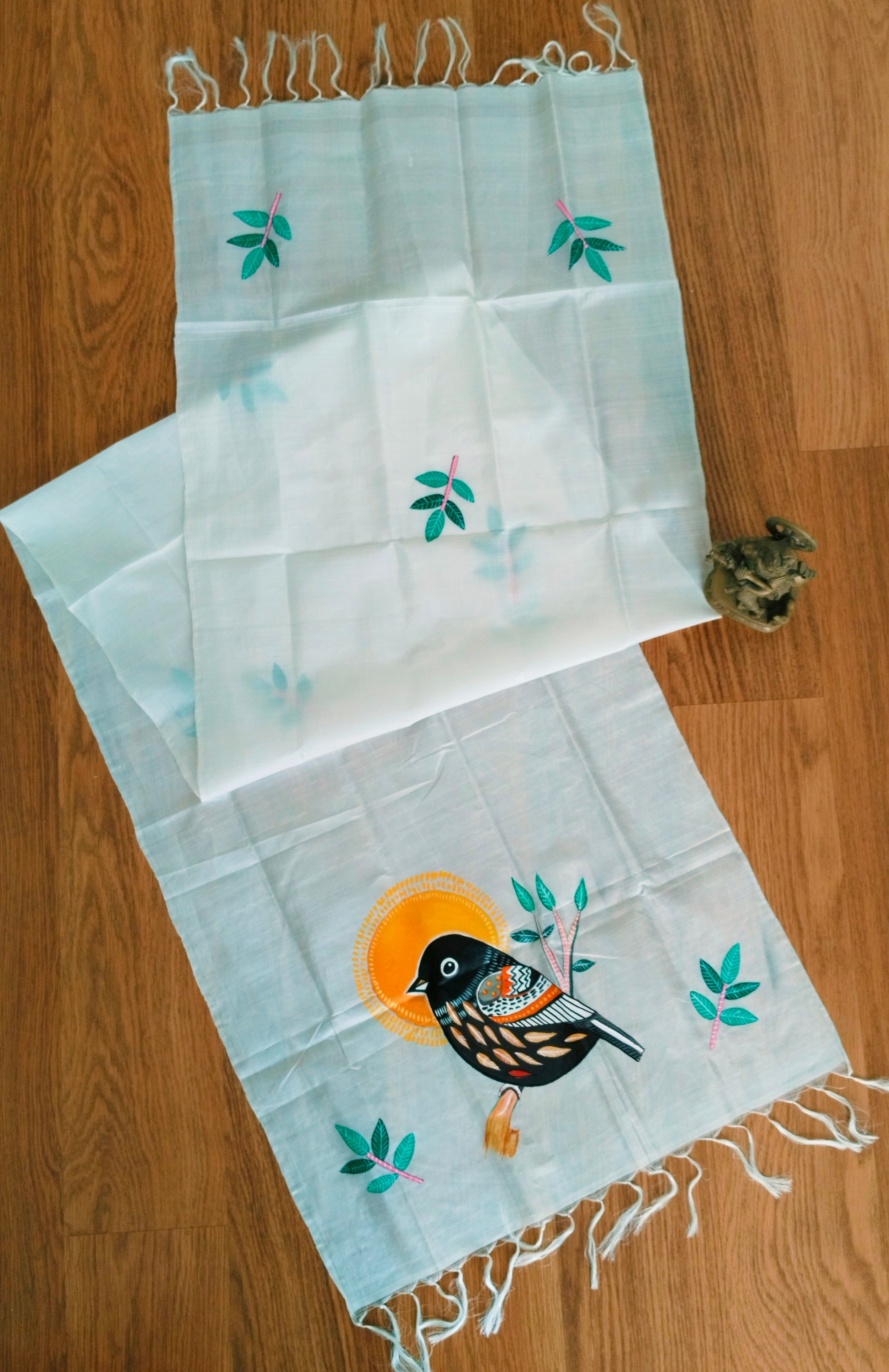 A beautiful hand-painted off-White dupatta with Black Bird Sitting on the branch facing sun on the body. This artwork captures the essence of nature.