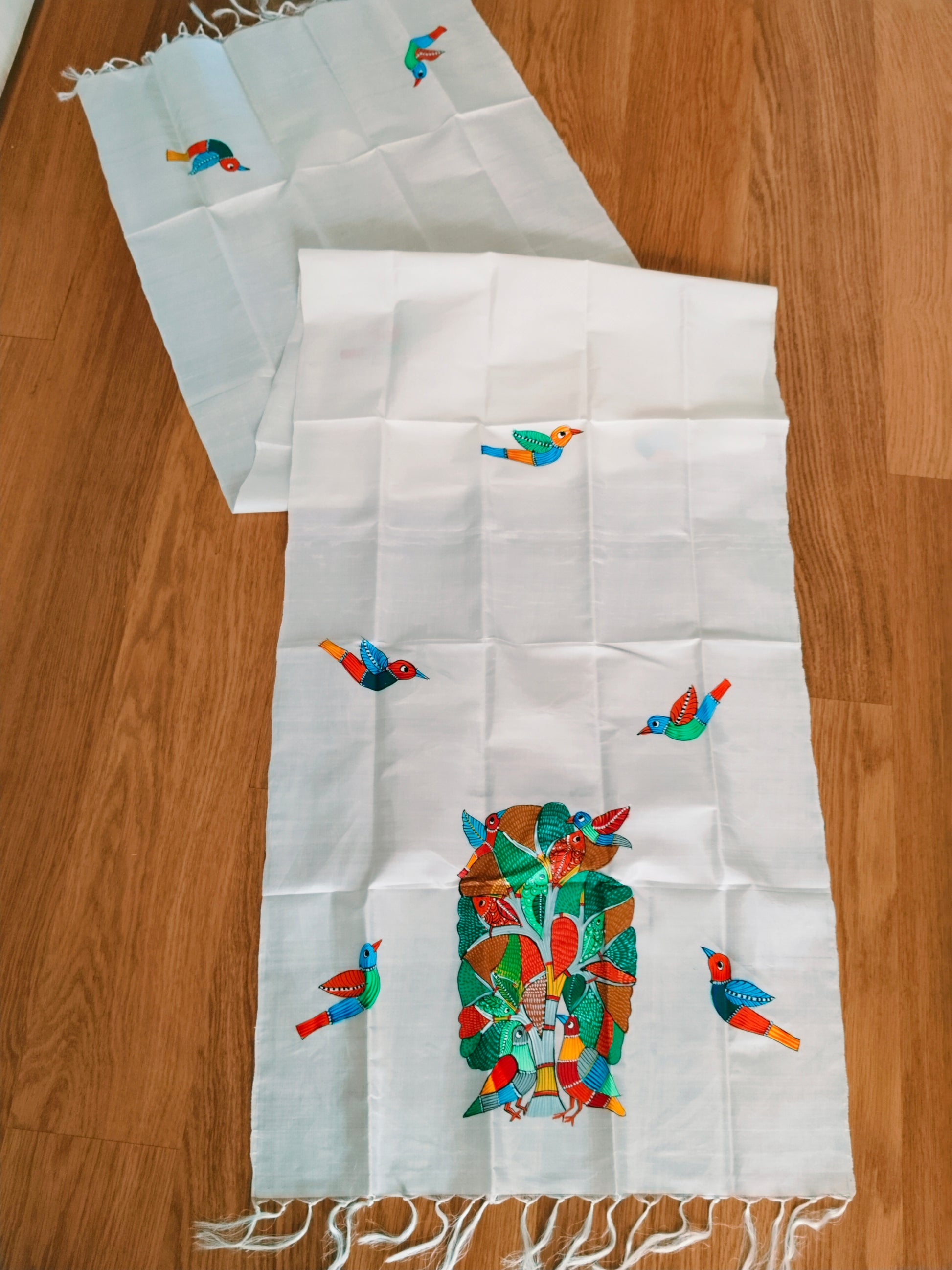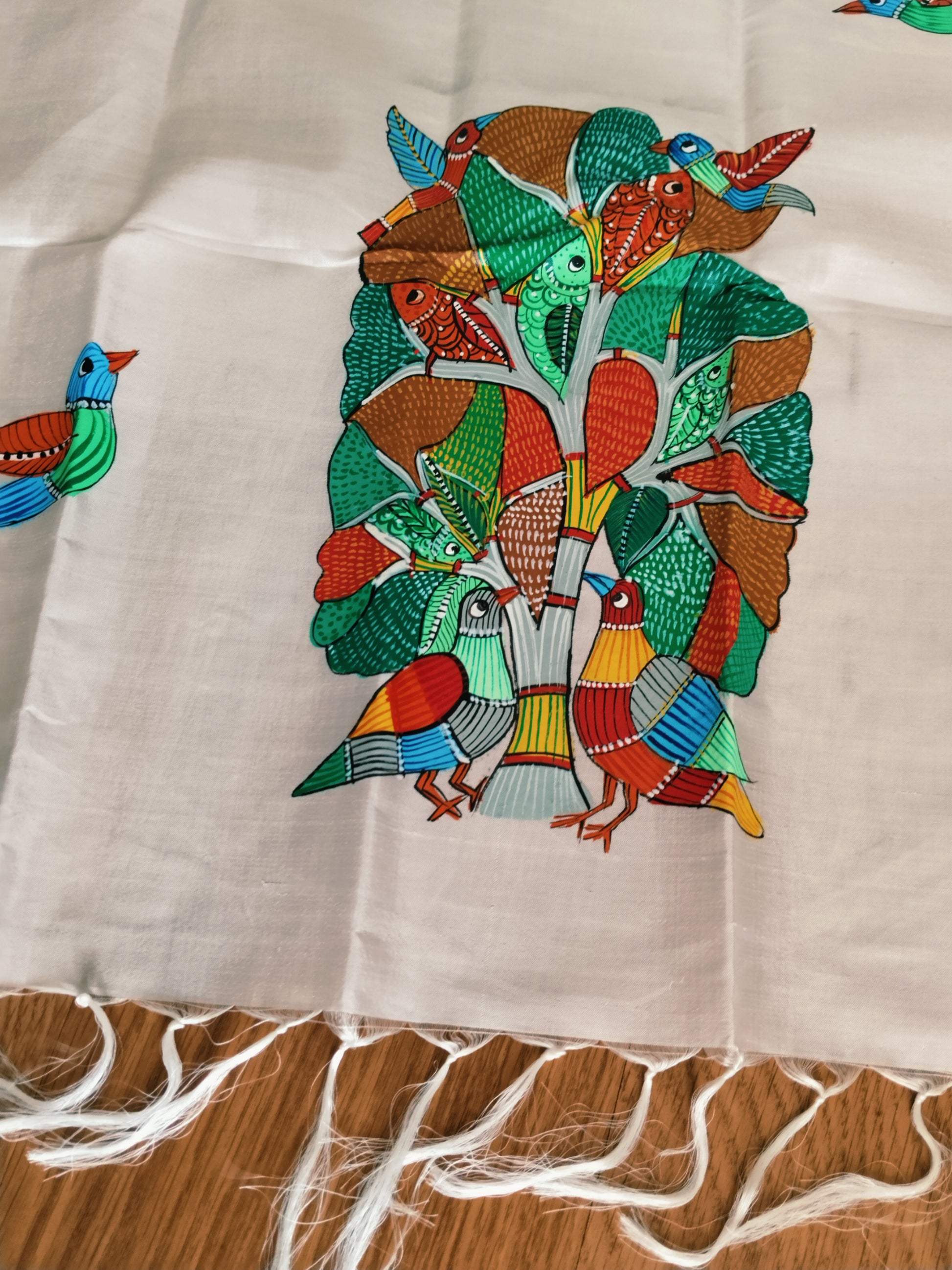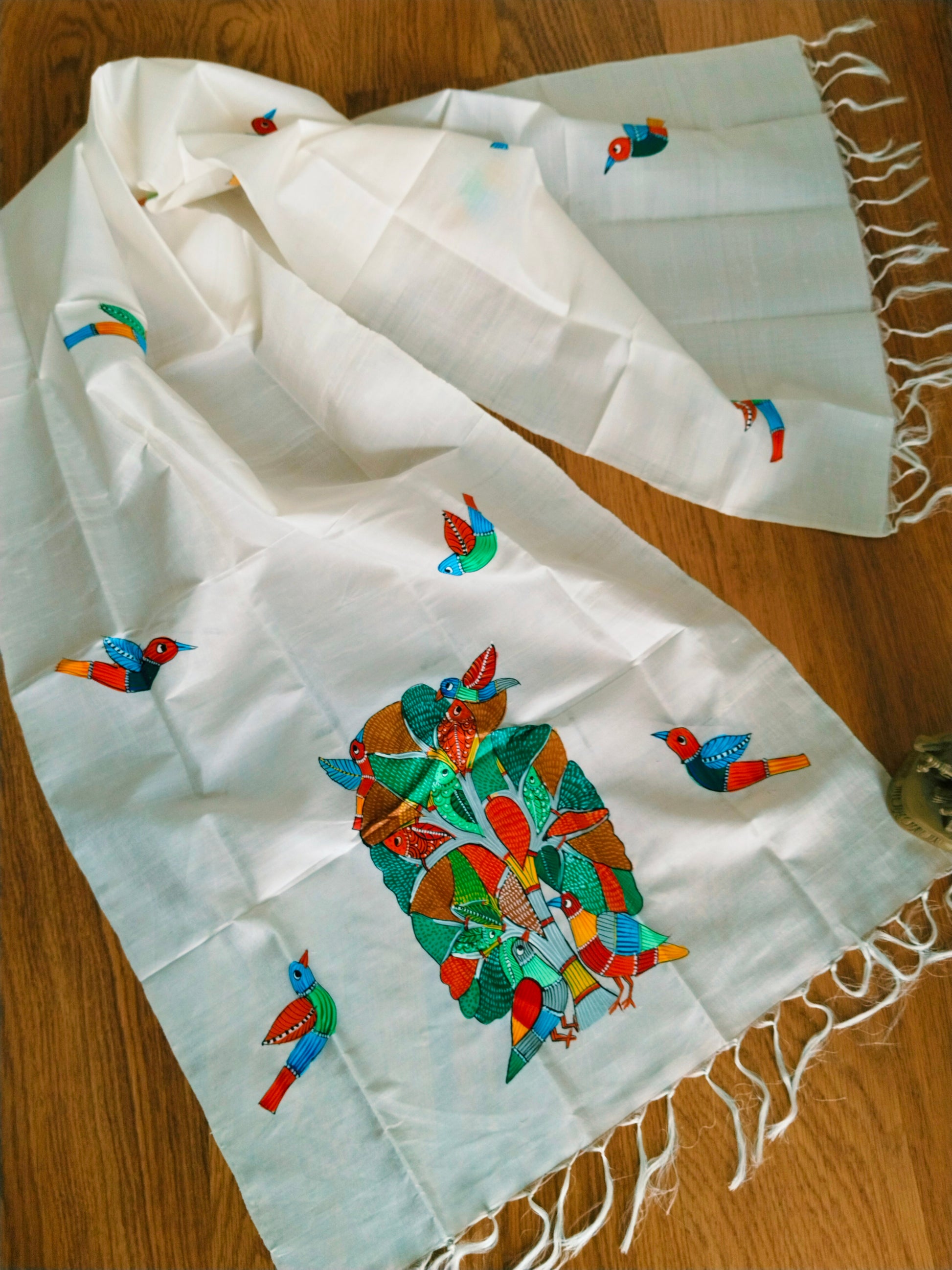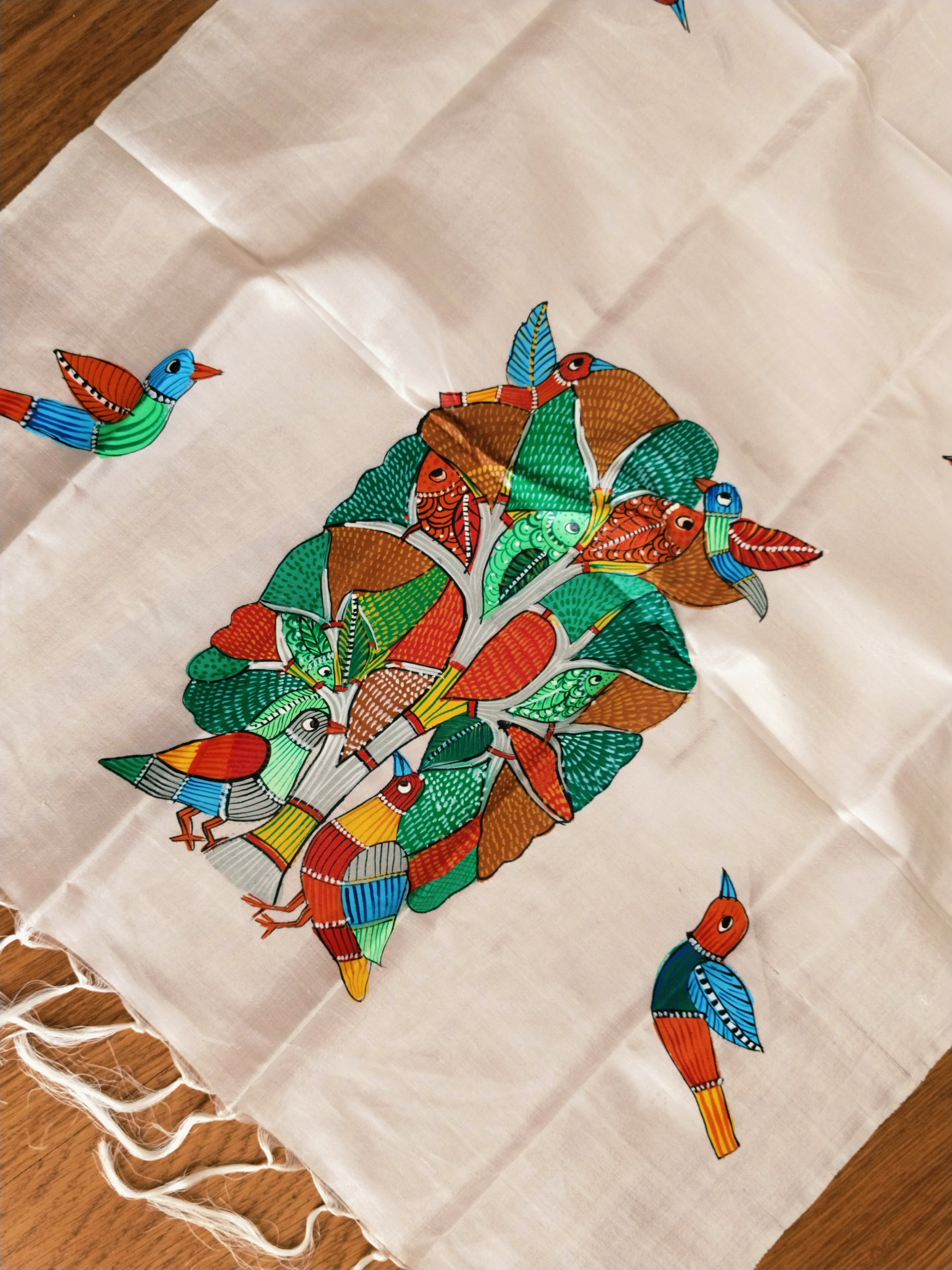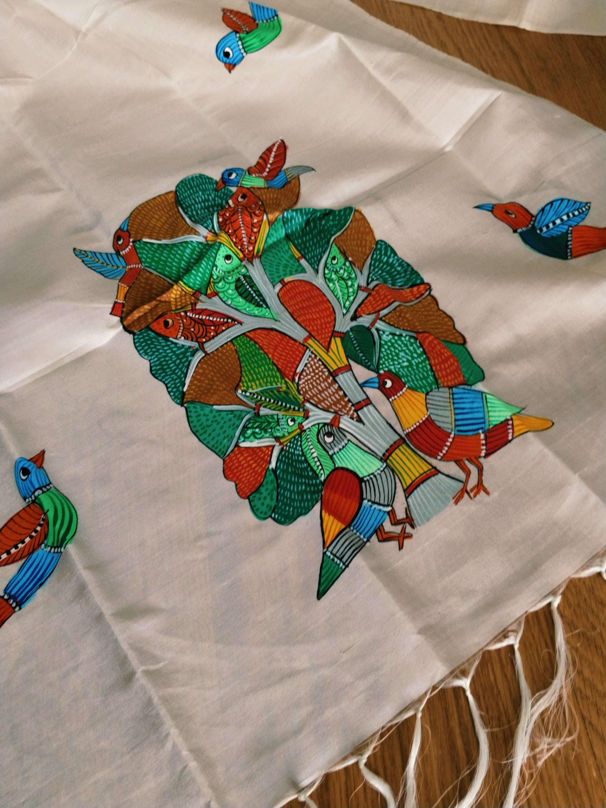 A beautiful hand-painted dupatta with Gond painting on the body.