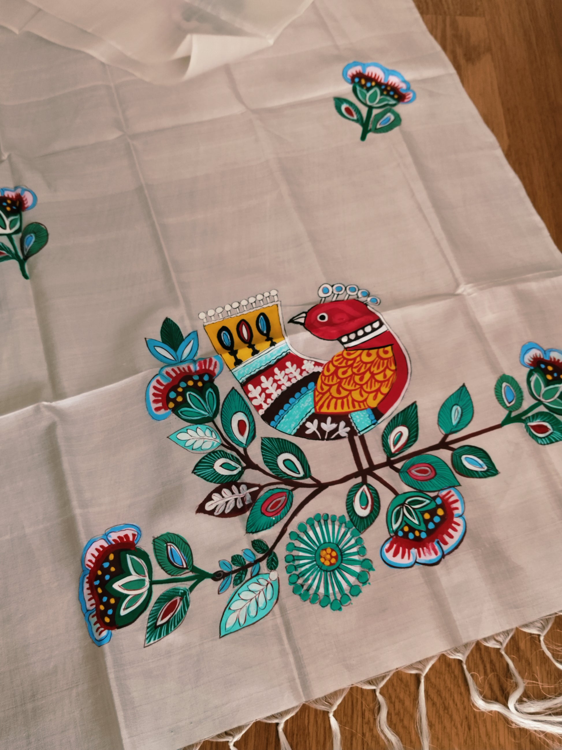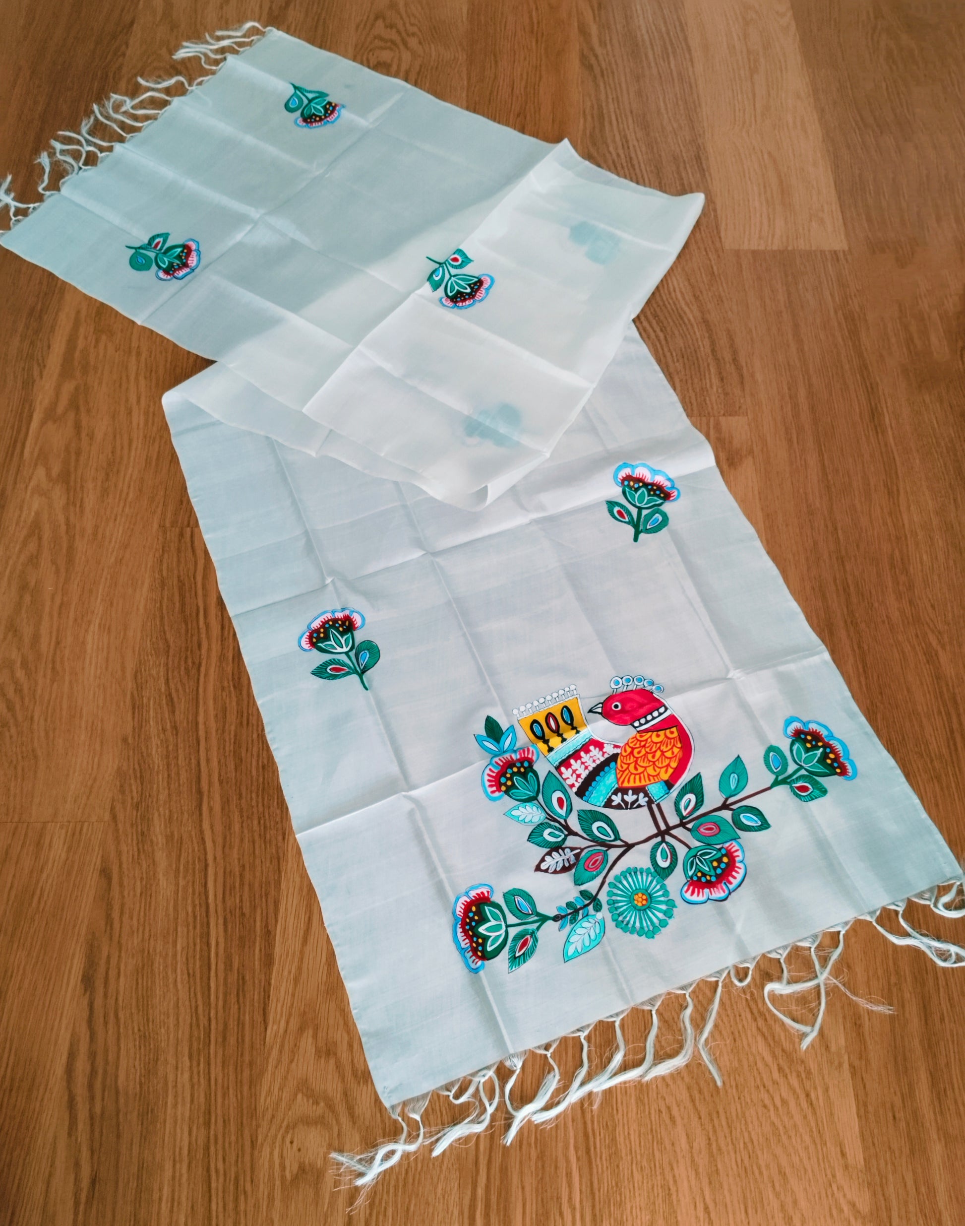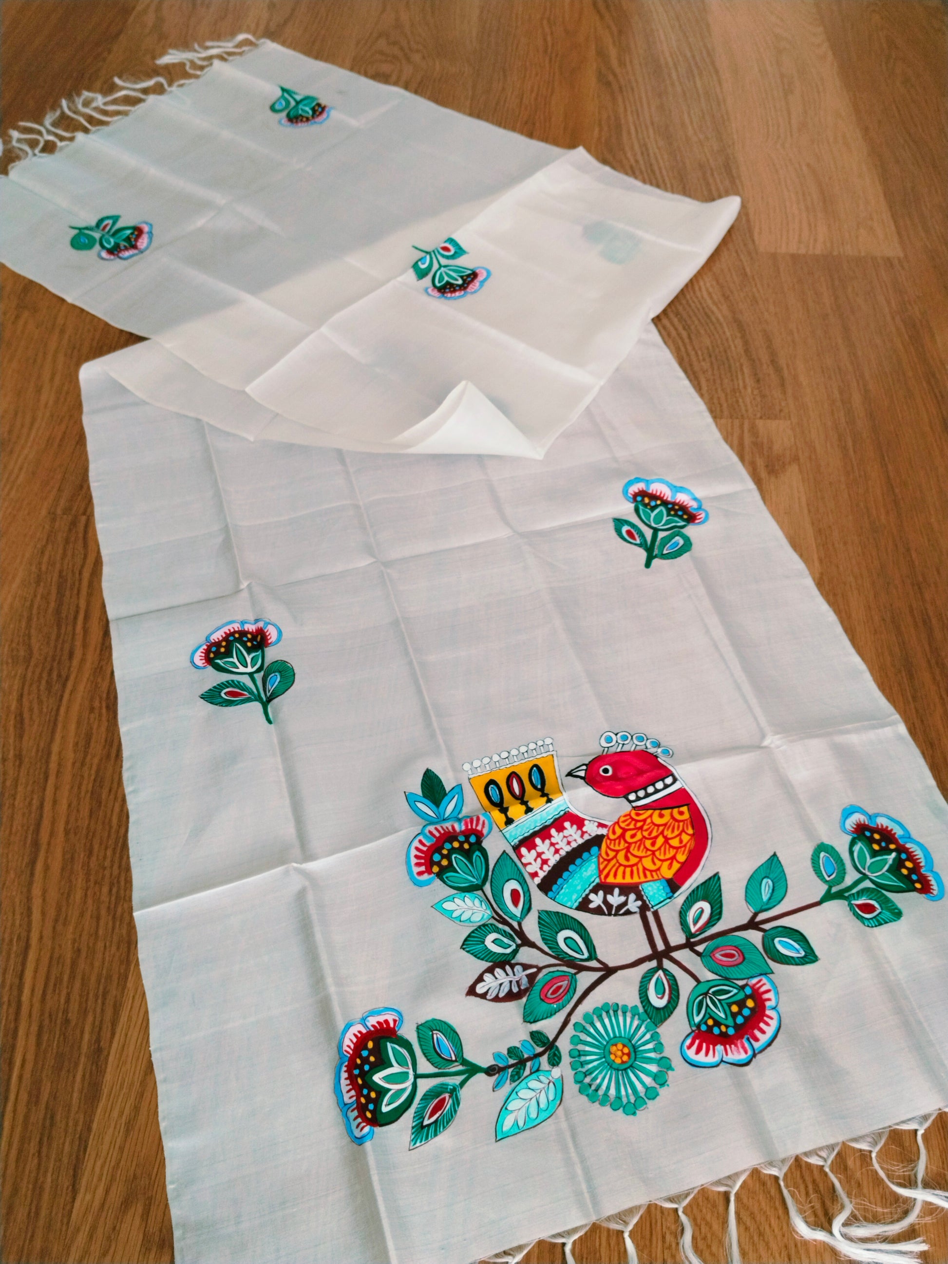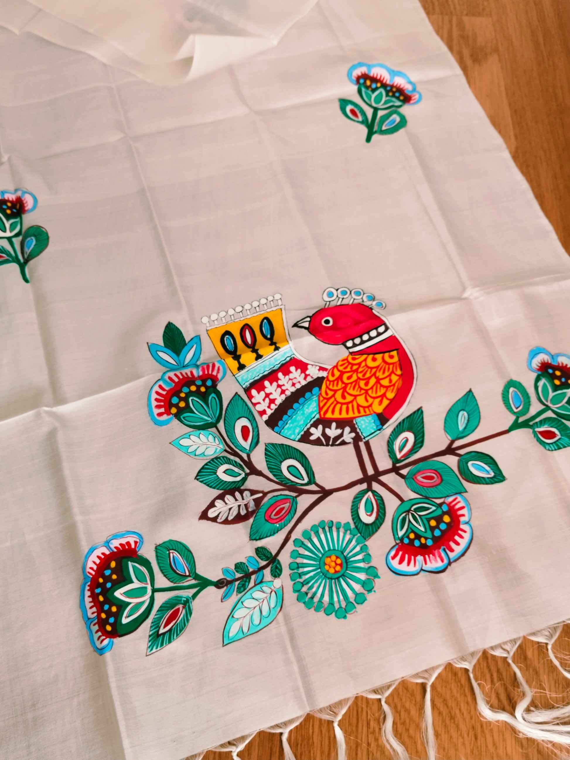 A beautiful hand-painted white silk stole with a cute little multi coloured Bird of paradise sitting on a branch (one side). This artwork captures the essence of nature.