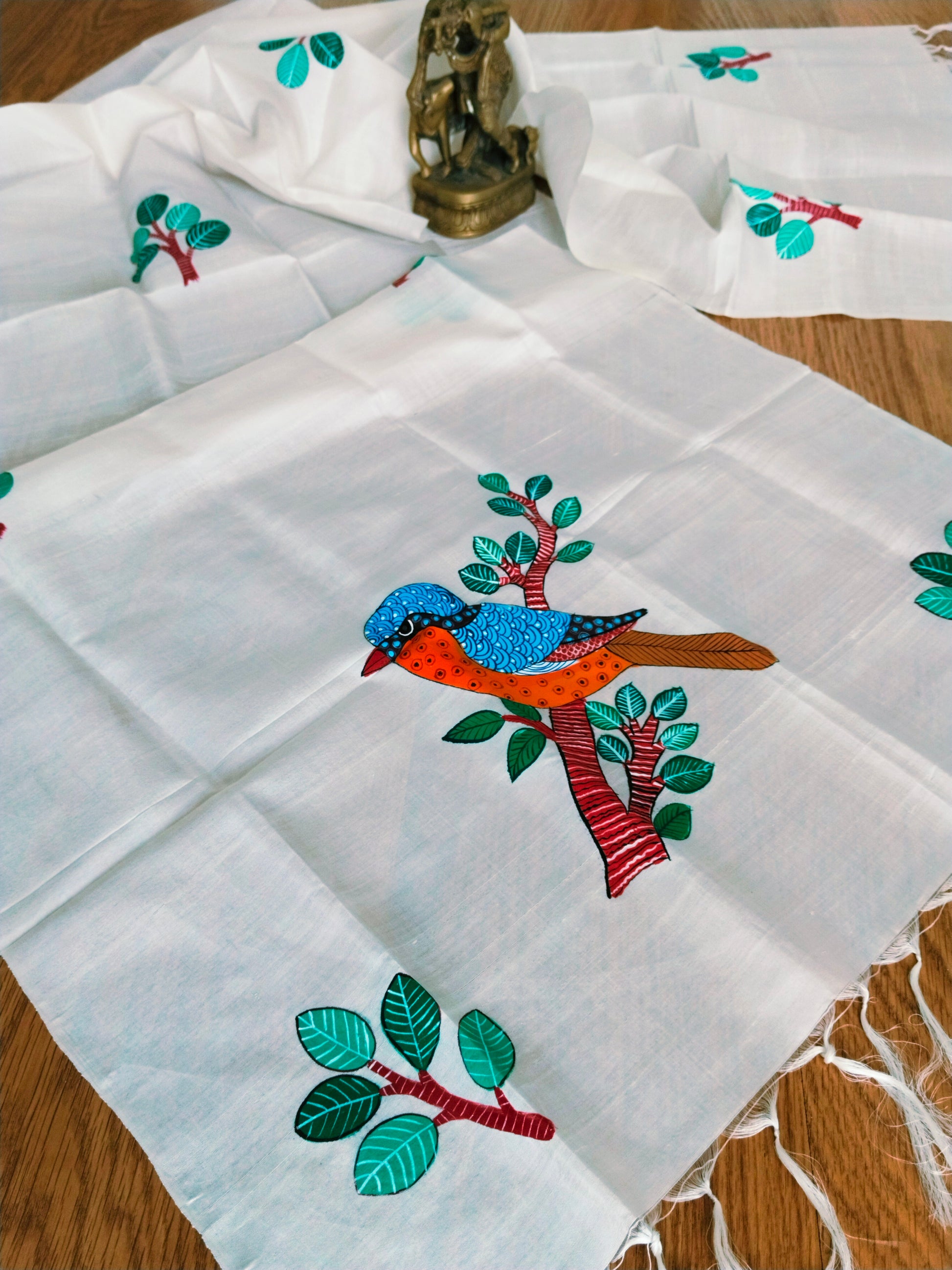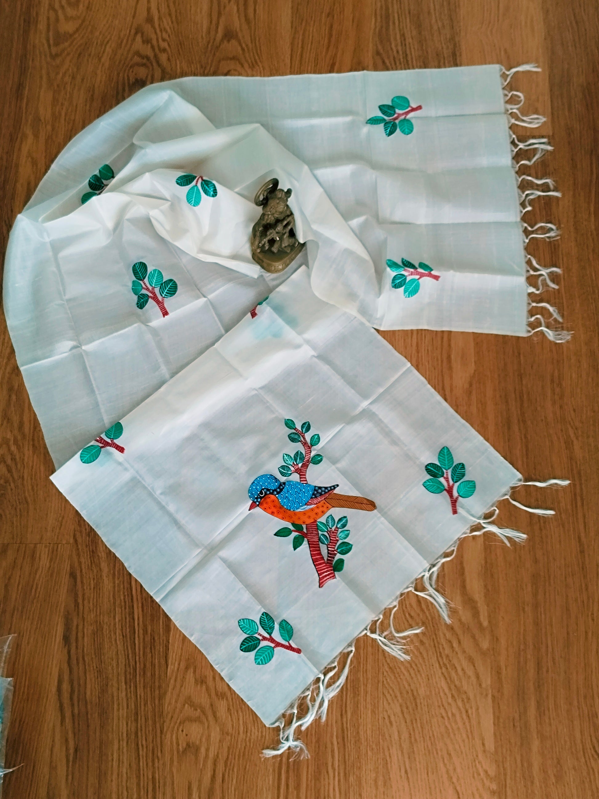 A beautiful hand-painted white silk stole with a cute little multi coloured Bird of paradise sitting on a branch (one side). This artwork captures the essence of nature.