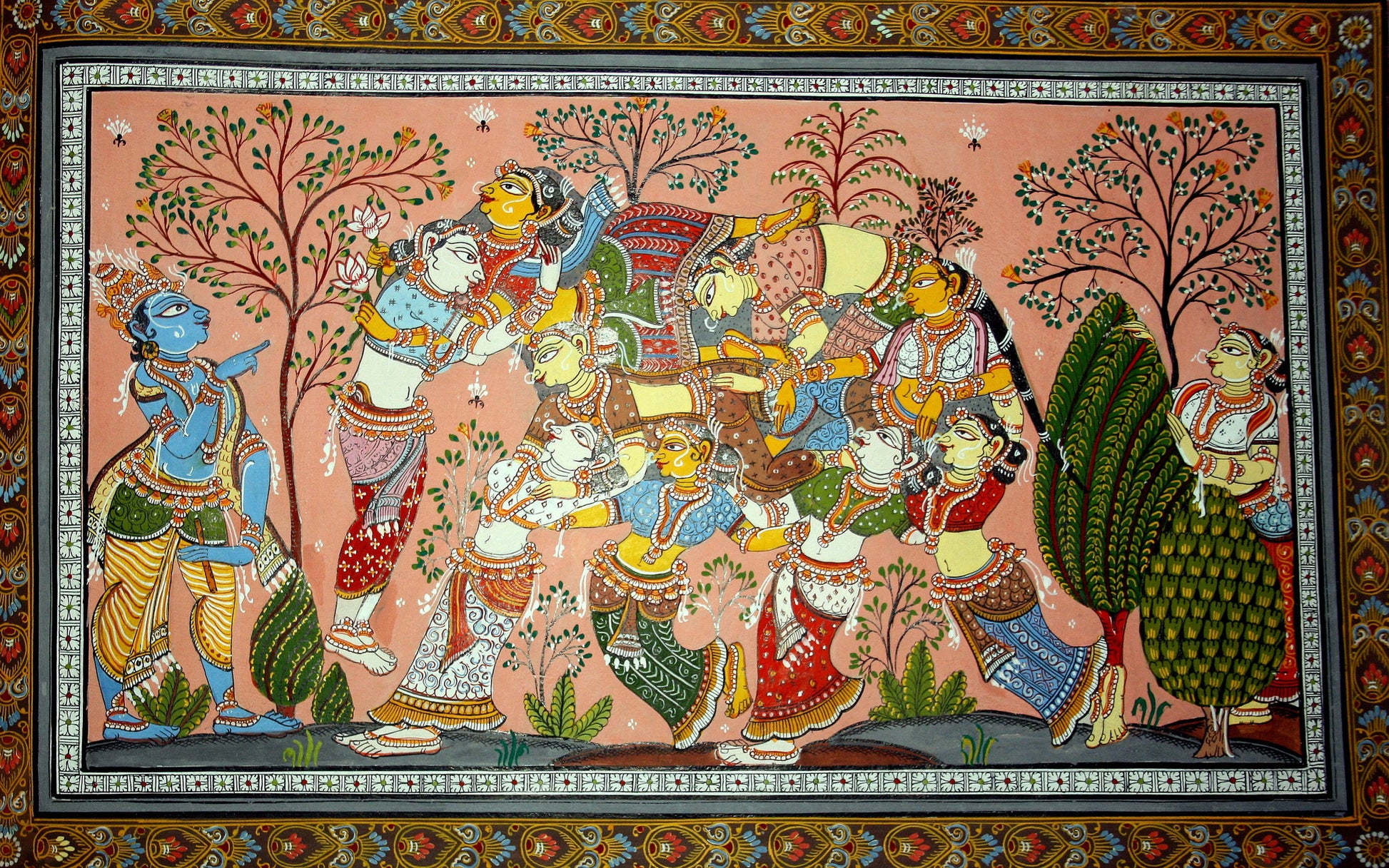 This vibrant patachitra depicts the "Kandarpa Hathi' - the gopis making a vehicle of love (the elephant) and inviting their Lord Krishna to ride on it.