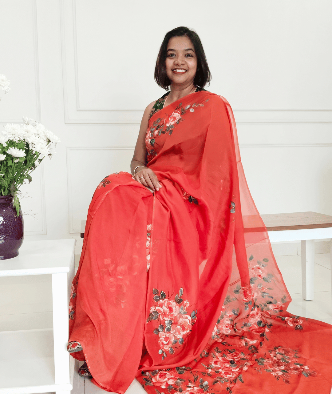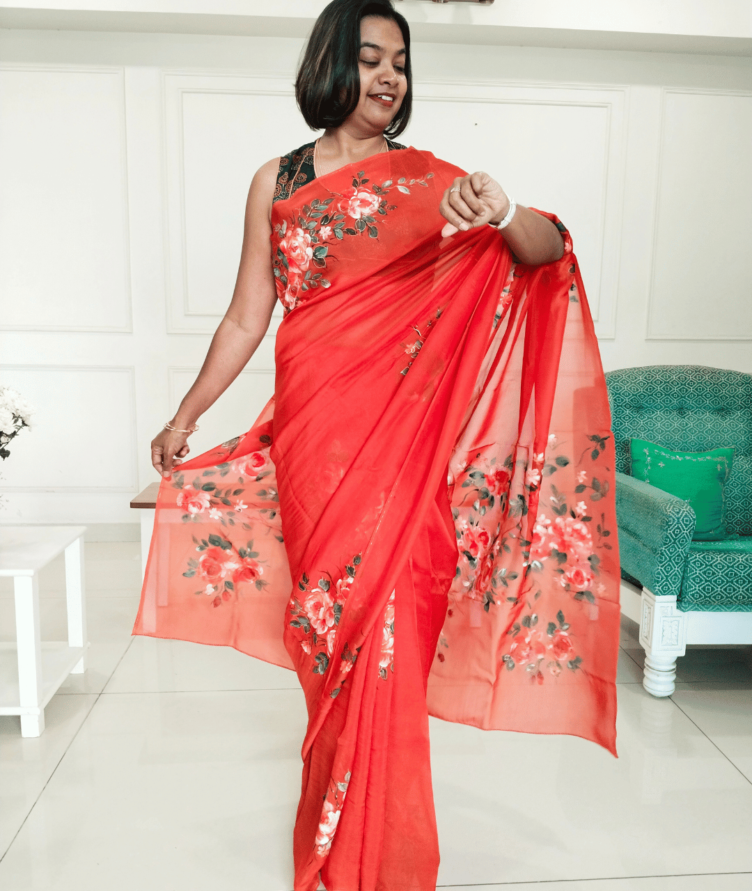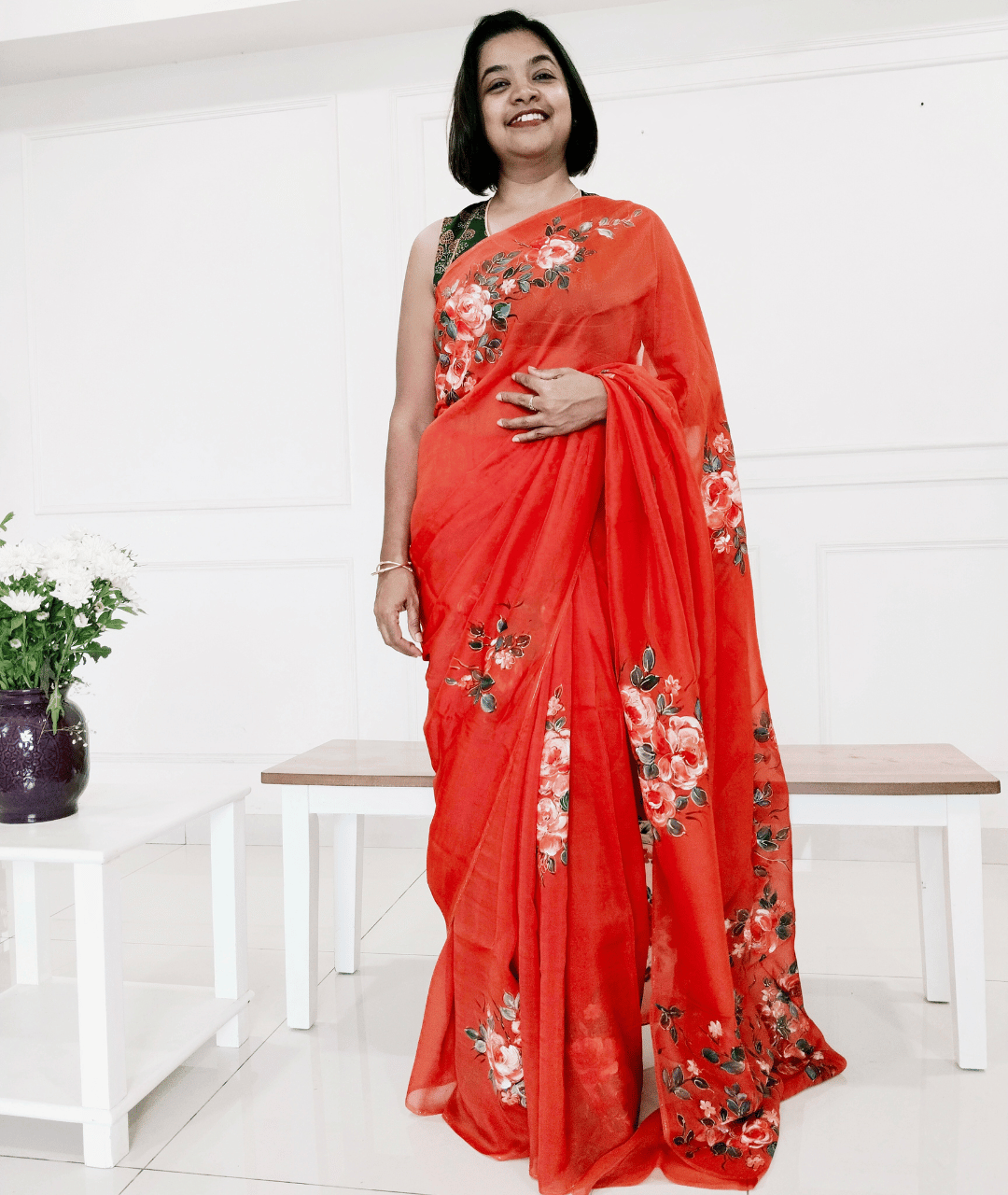 A beautifully hand-painted rust synthetic organza saree with white roses in full bloom.