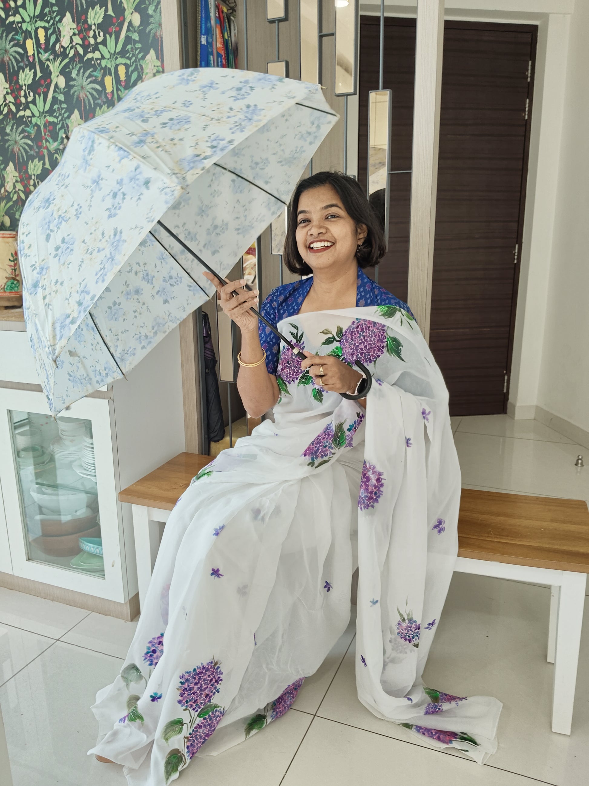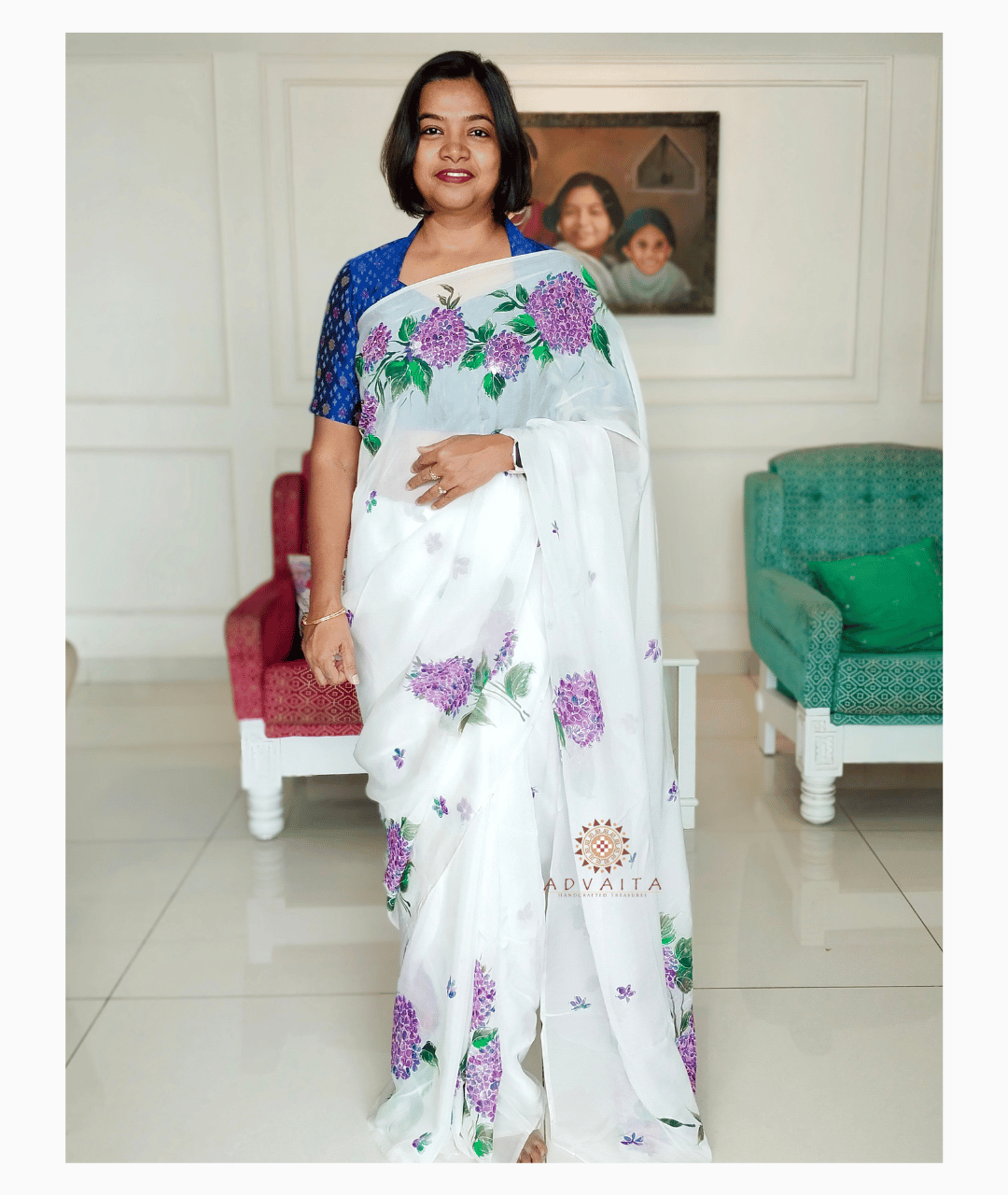 Saree made to order but worth waiting for. A beautifully hand-painted white synthetic organza saree with purple blue lilacs in full bloom.