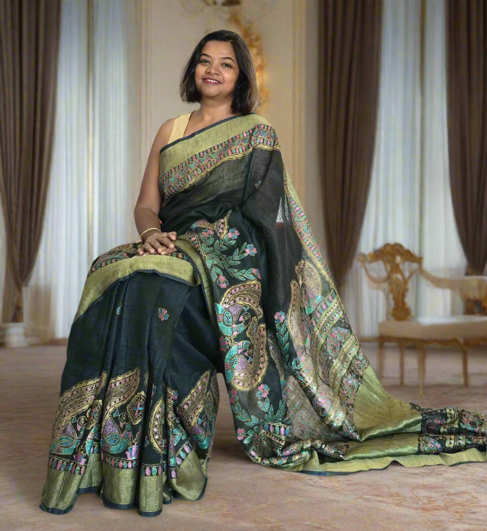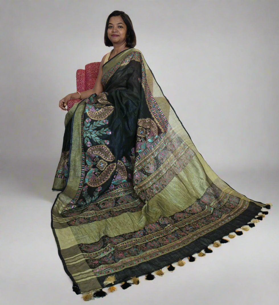 Madhubani Peacock on Linen Cotton Saree in Black