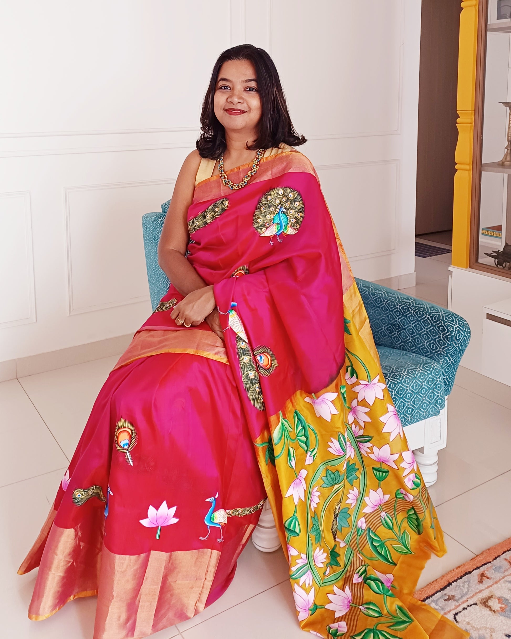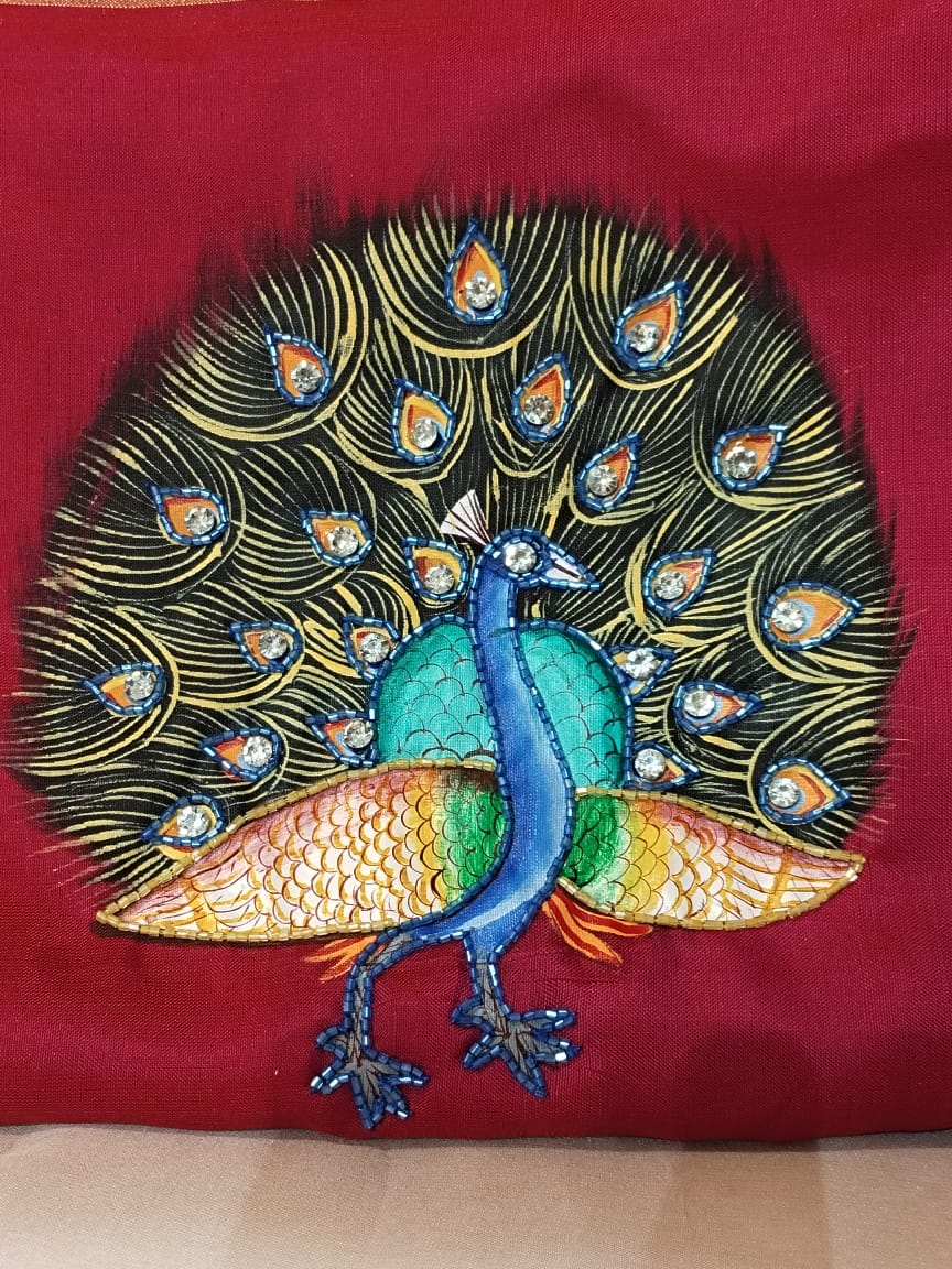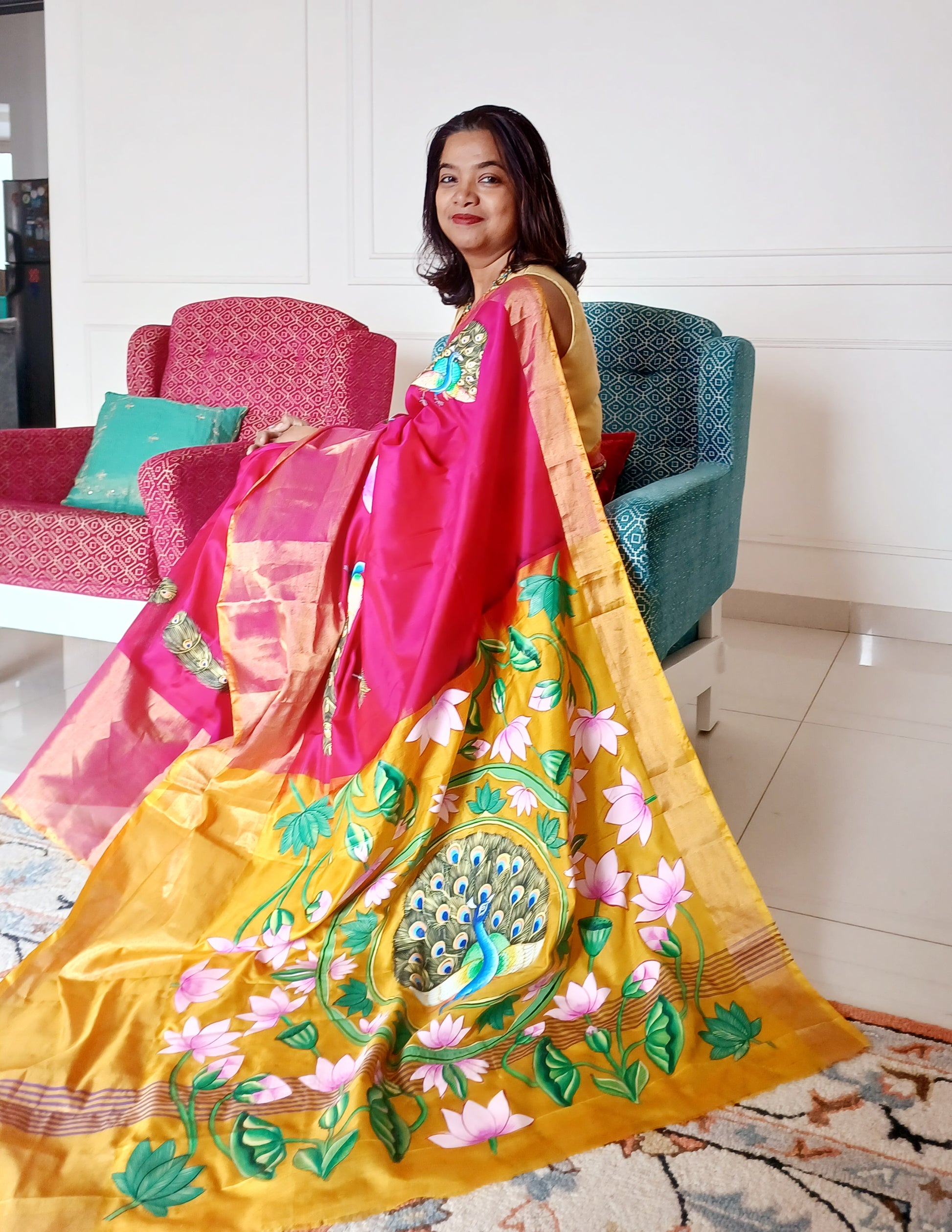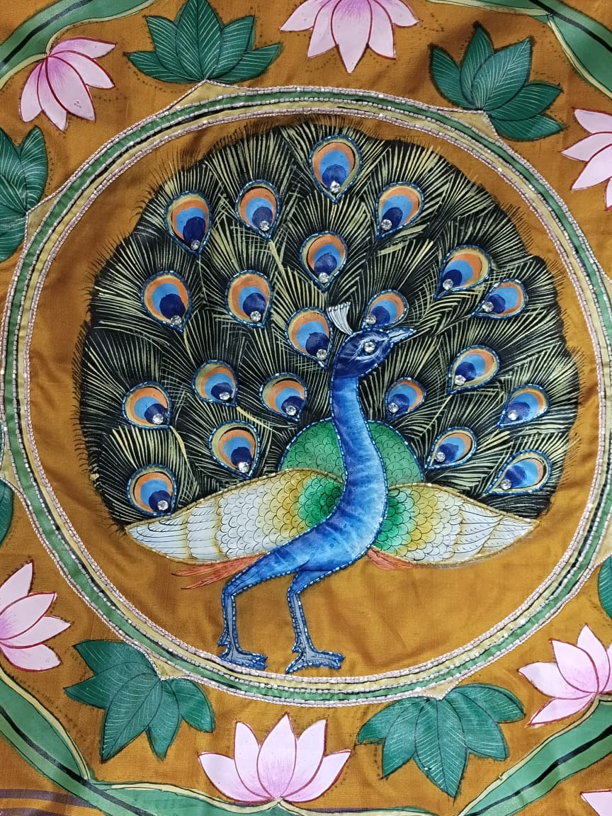The beautiful pink silk peacock saree is a upada silk saree with elegant Pichwai and Rajasthani hand painting depicting the famous Rajasthani peacock with its wings in full spread dancing at the sight of heavy monsoon clouds. The Peacock motif on the chest portion of the saree - top border has also been hand-embroidered and embellished to make it striking and eye-catching. The pallu of the saree with the peacock in a field of lotus flowers has also been hand-embroidered. Please take a closer look at the photographs.
