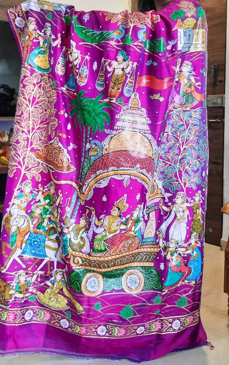 Pure Handspun Silk – Hand Painted Patachitra Saree – Raja Rani theme