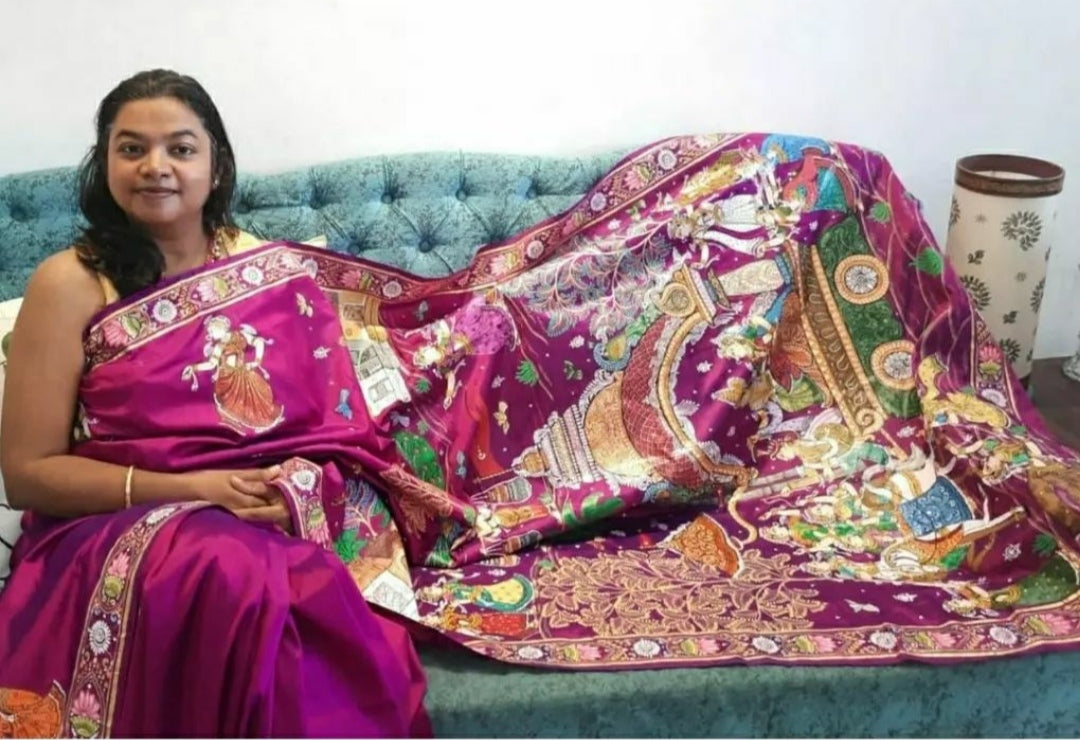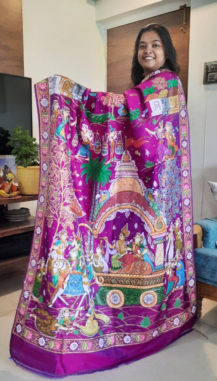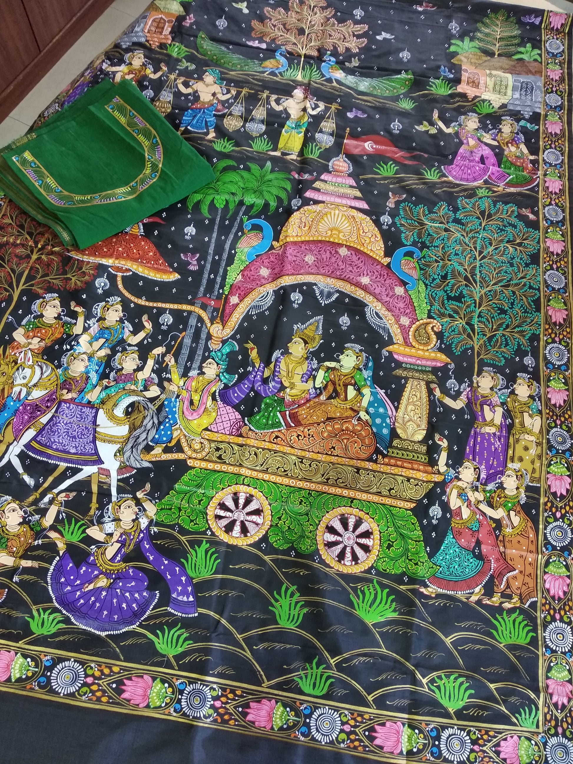 lovingly Handspun Pure silk saree, hand painted patachitra folk art by one of our women artist.
