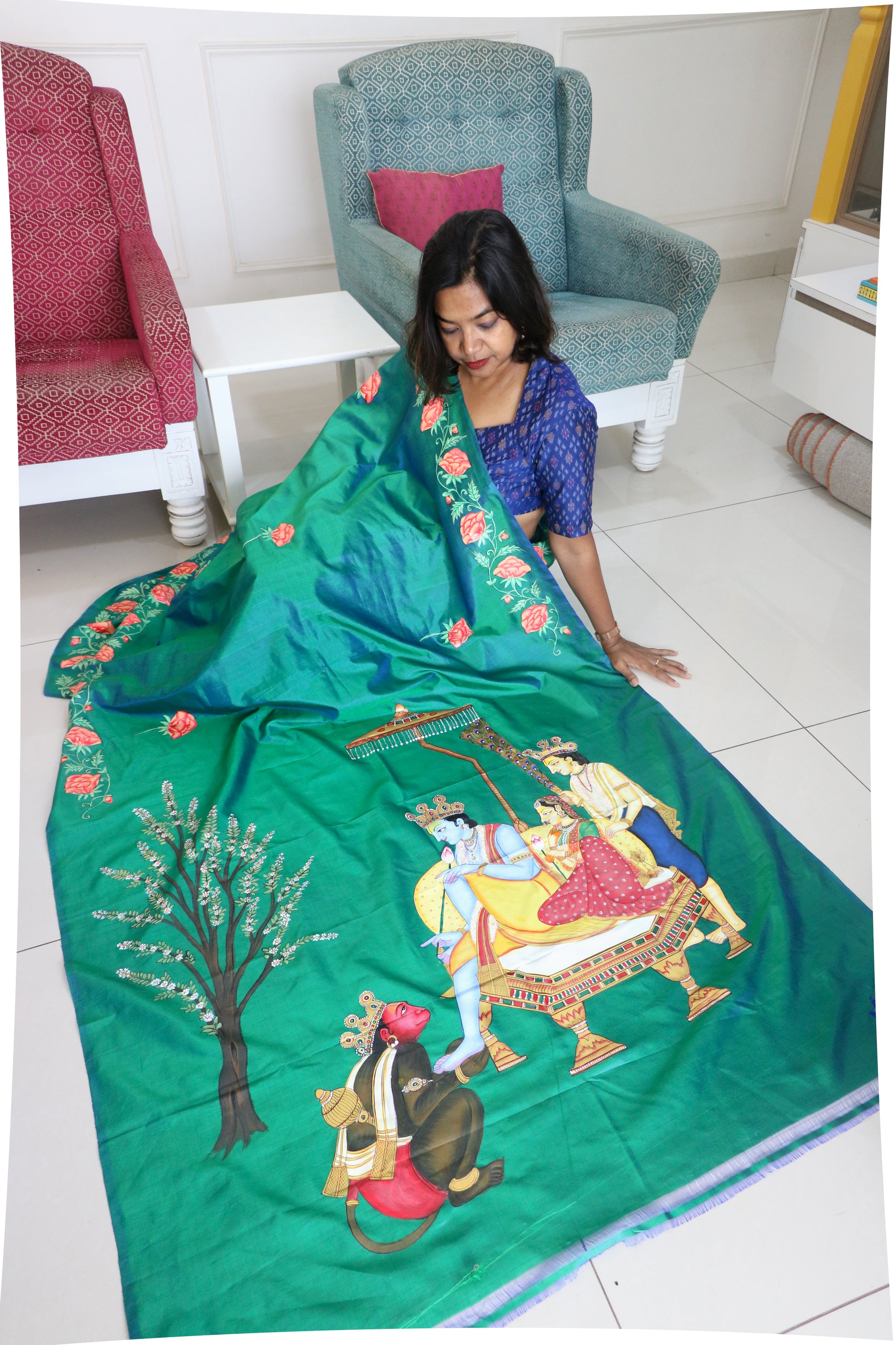A beautifully hand-painted pichwai saree depicting Lord Ram with Sita ji, Lakshman Ji and Hanuman ji. Beautifully hand-painted by artisans from Rajasthan this saree has exquisite work and superior workmanship.