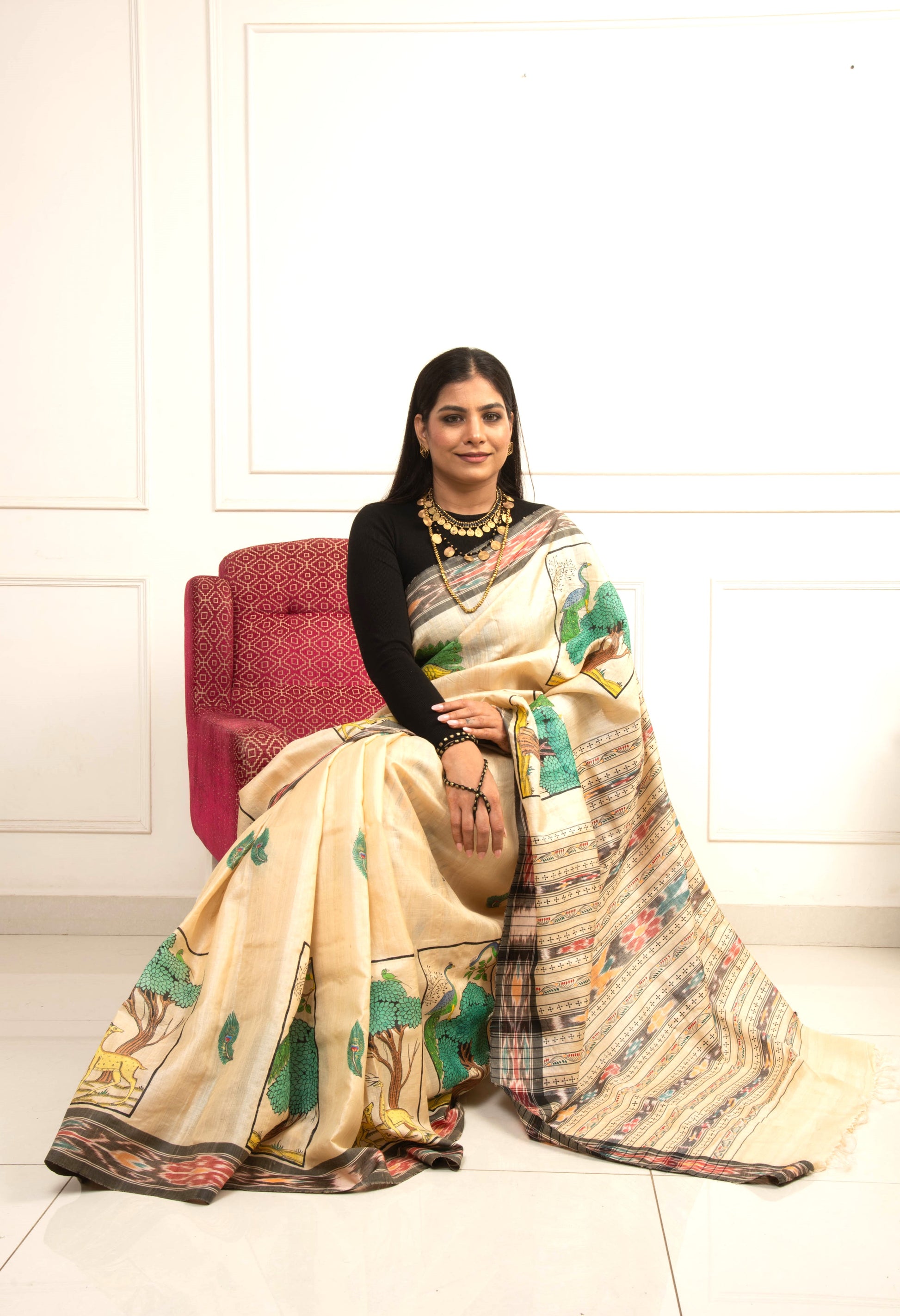 Pure tassar silk Patachitra Jungle theme Saree - Beige and Black