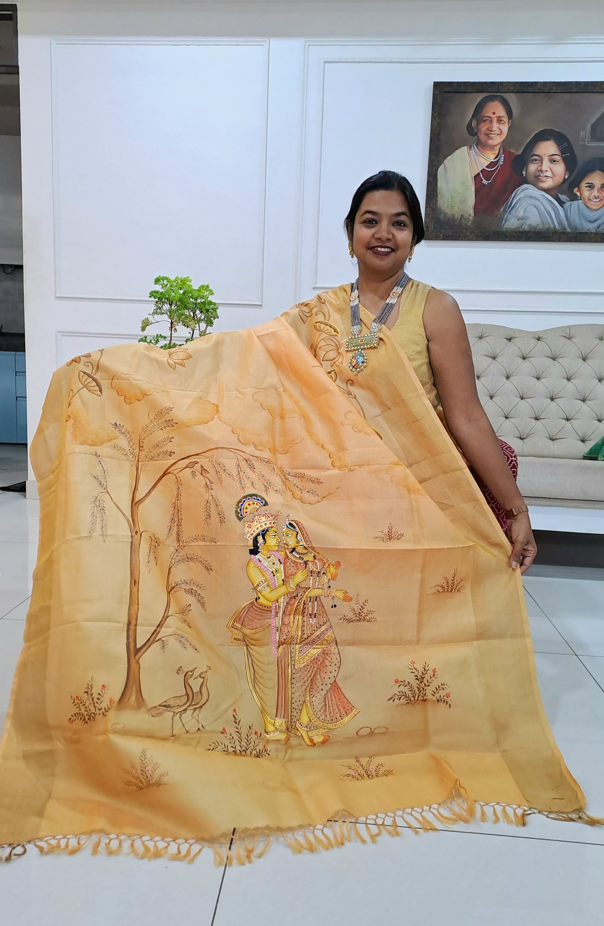 A beautifully hand-painted pichwai saree depicting Lord Krishna & Radha in spring time. Done with a limited color palette this saree is elegant and perfect for official functions as well as family events