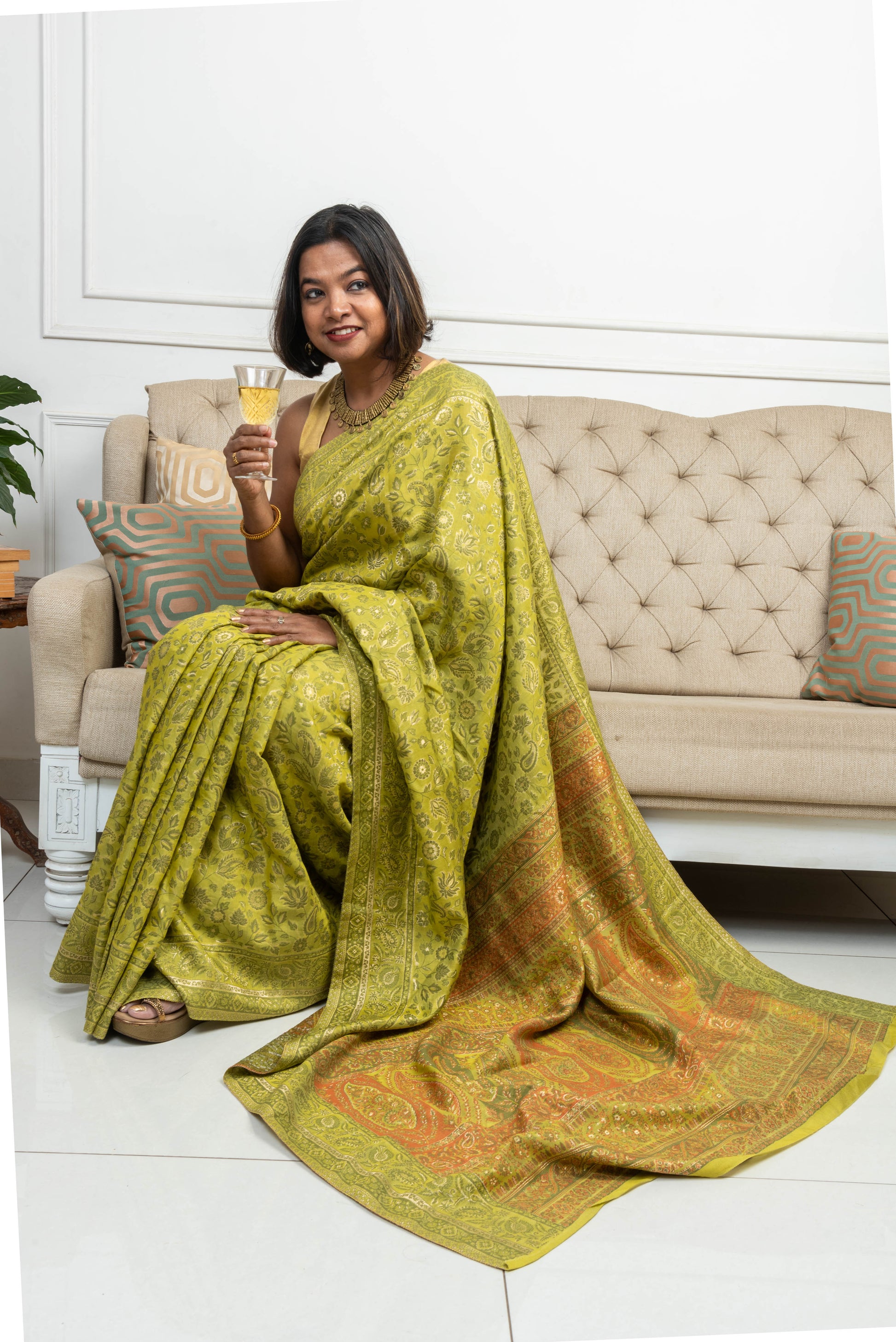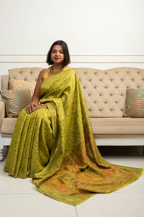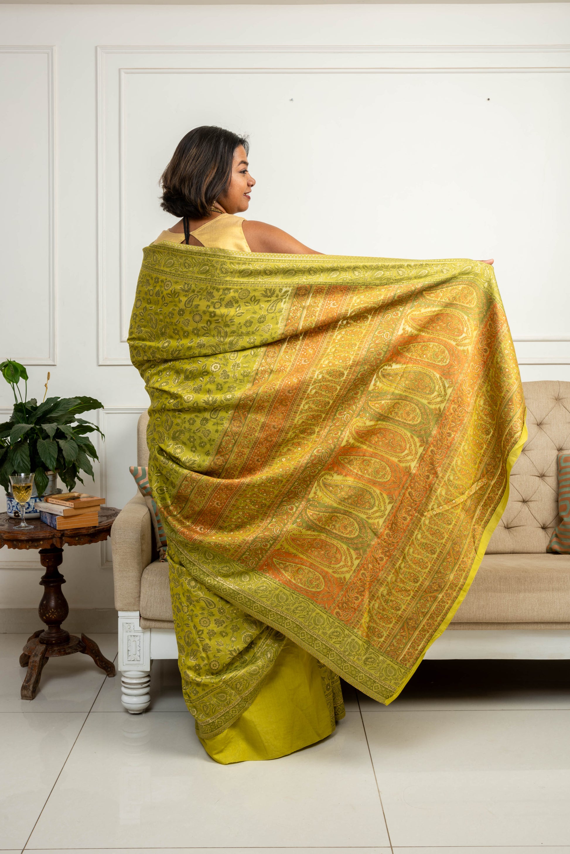 Handwoven Kani weave silk cotton saree - Mehendi Green