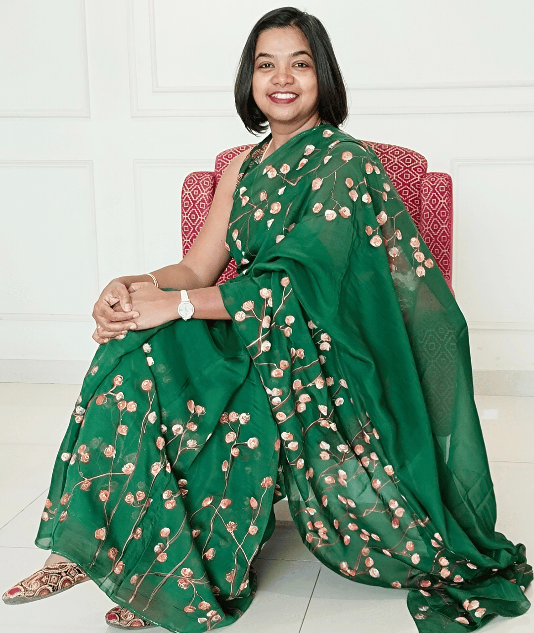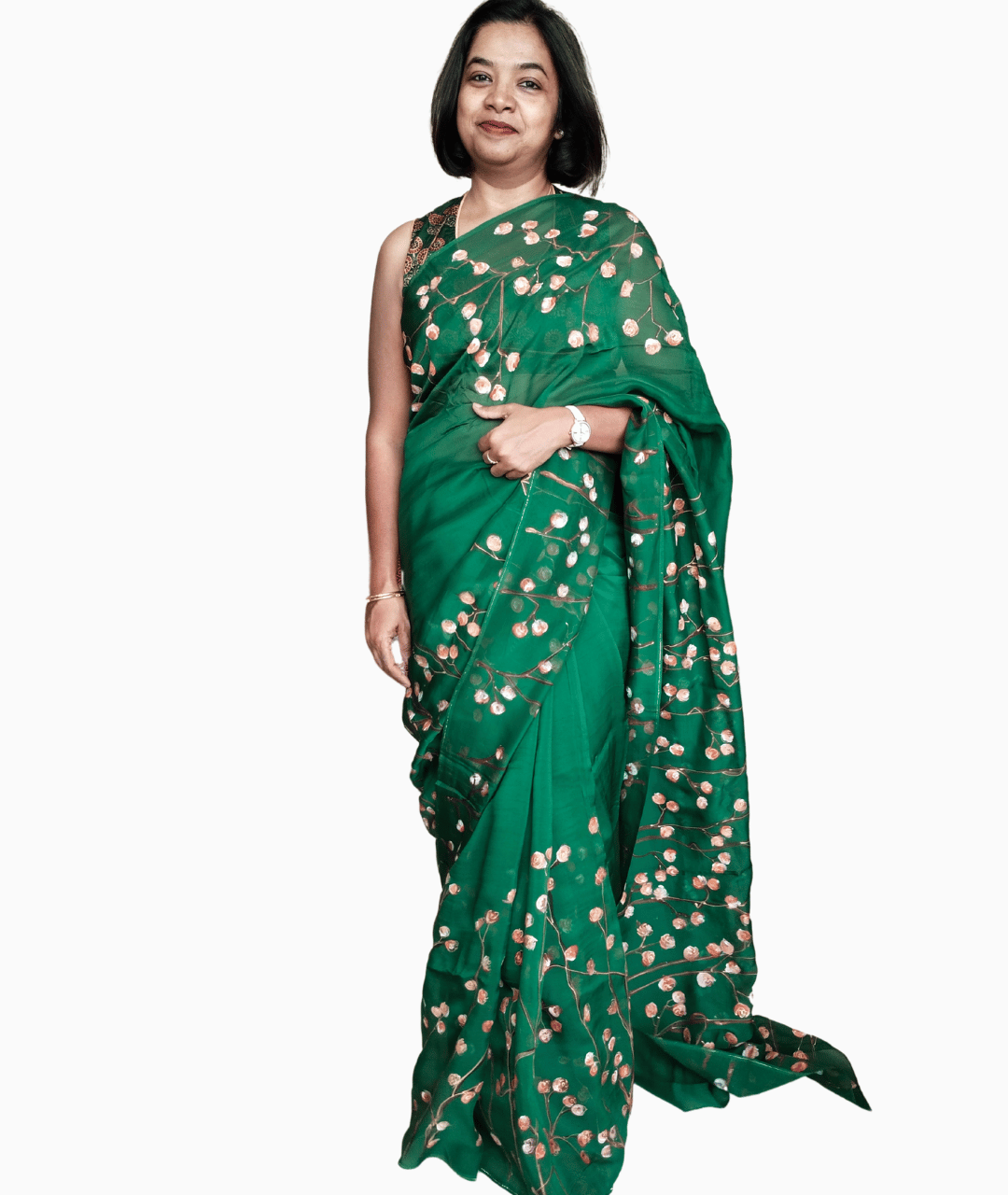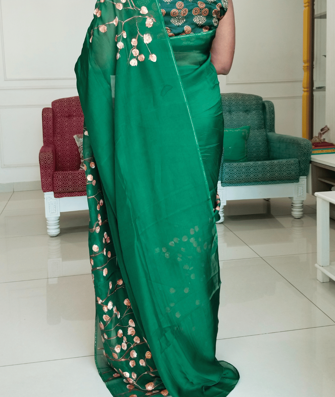 ROSE BUD- Handpainted Floral Organza Saree - Green