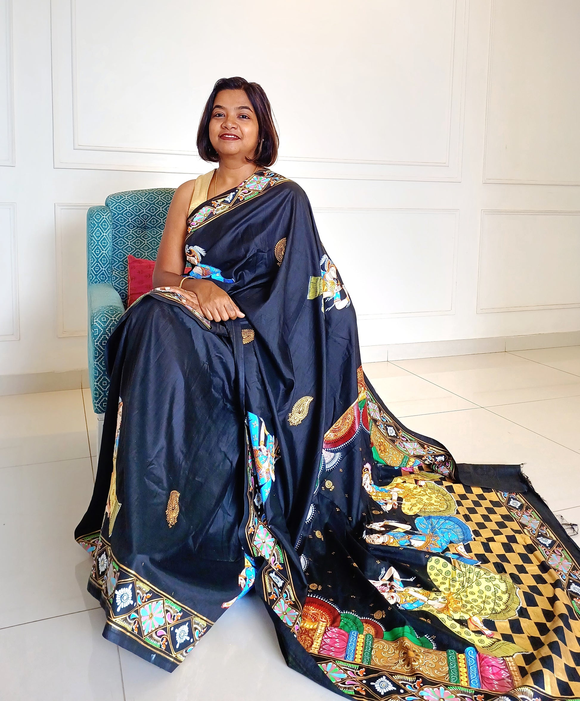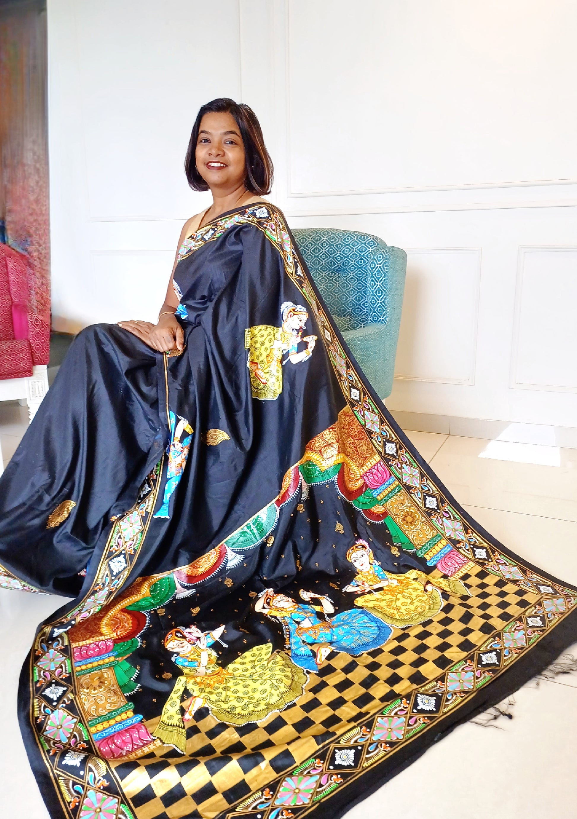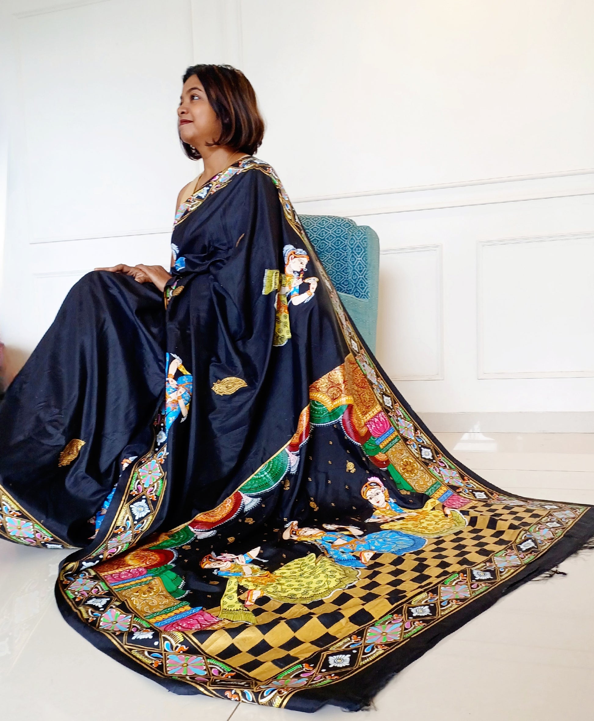 Discover the exquisite beauty of the Shringar Raas Patachitra artwork on a luxurious black silk cotton saree.