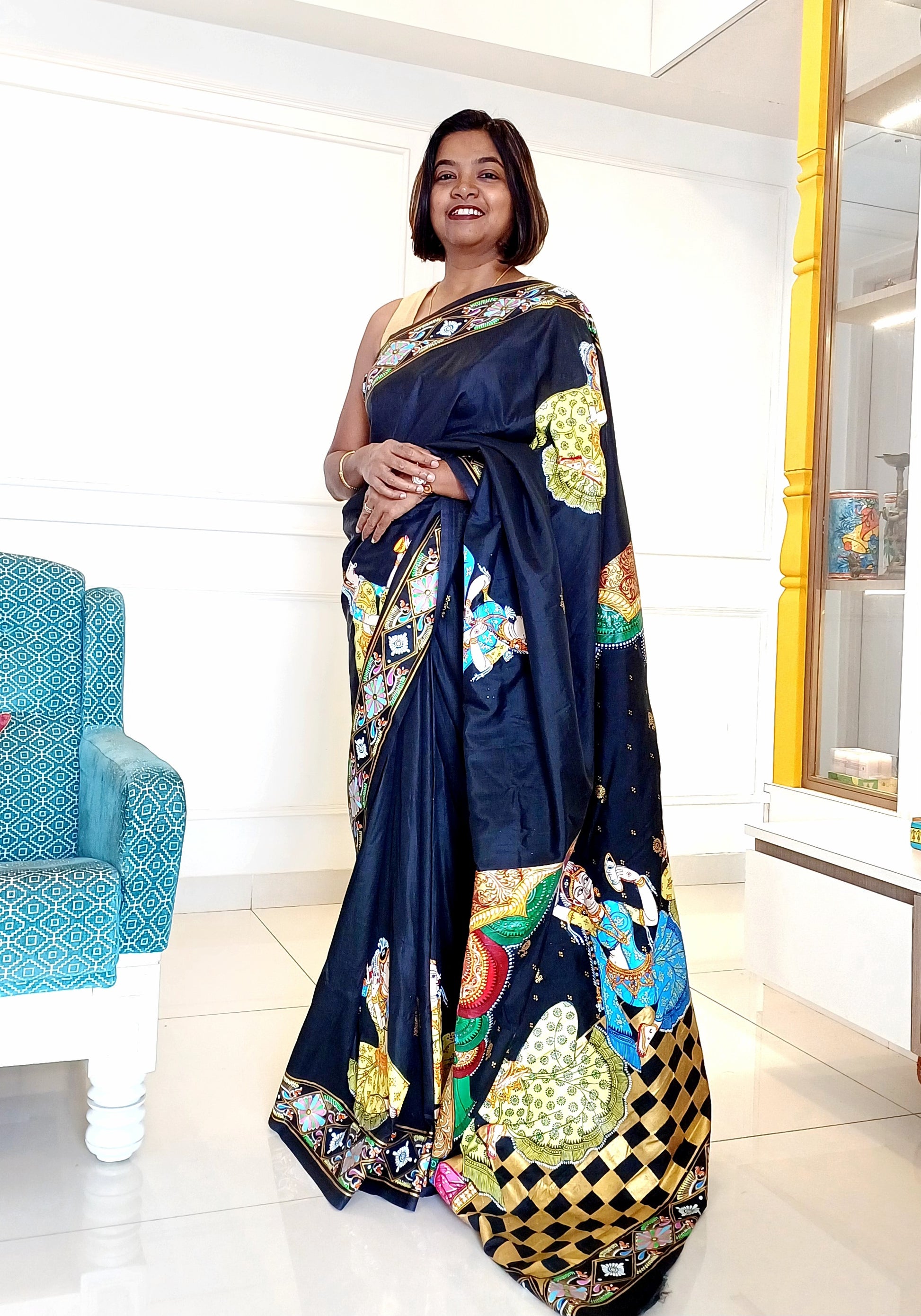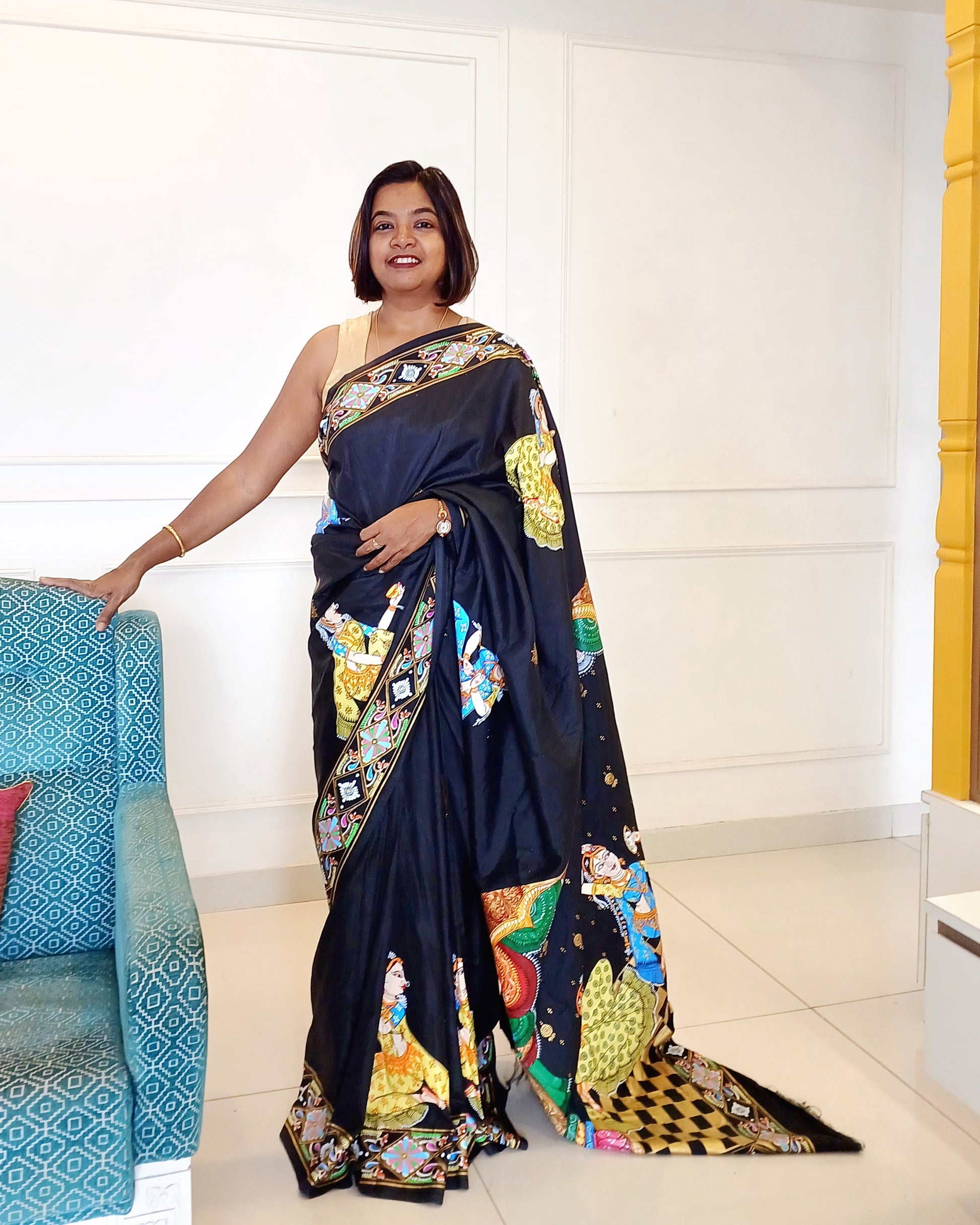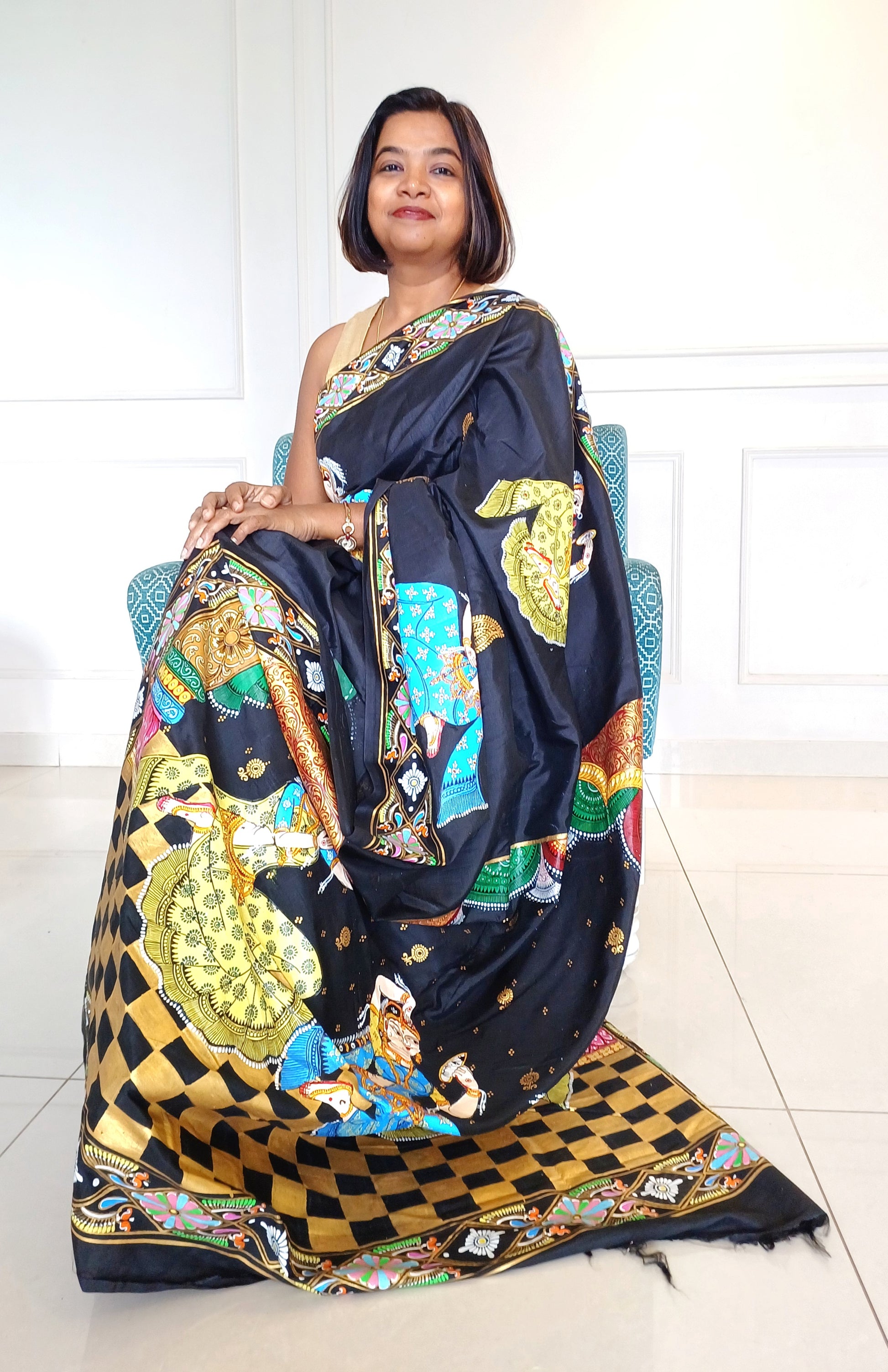 Discover the exquisite beauty of the Shringar Raas Patachitra artwork on a luxurious black silk cotton saree.
