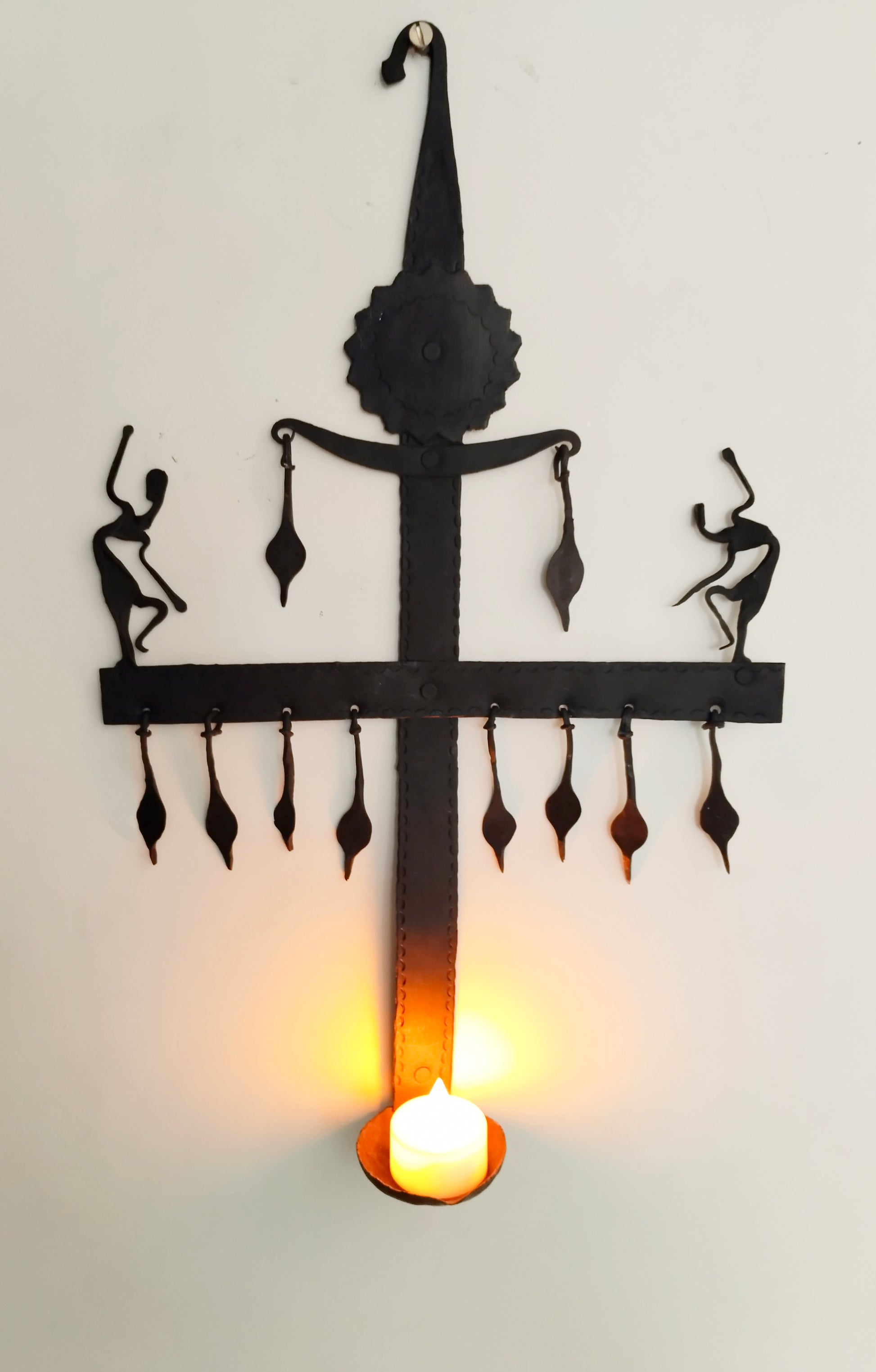This is a Beautiful tribal craft form beating up wrought iron to give them human and animal shapes that are then welded onto a frame to which diyas (tea-light) holders are added.