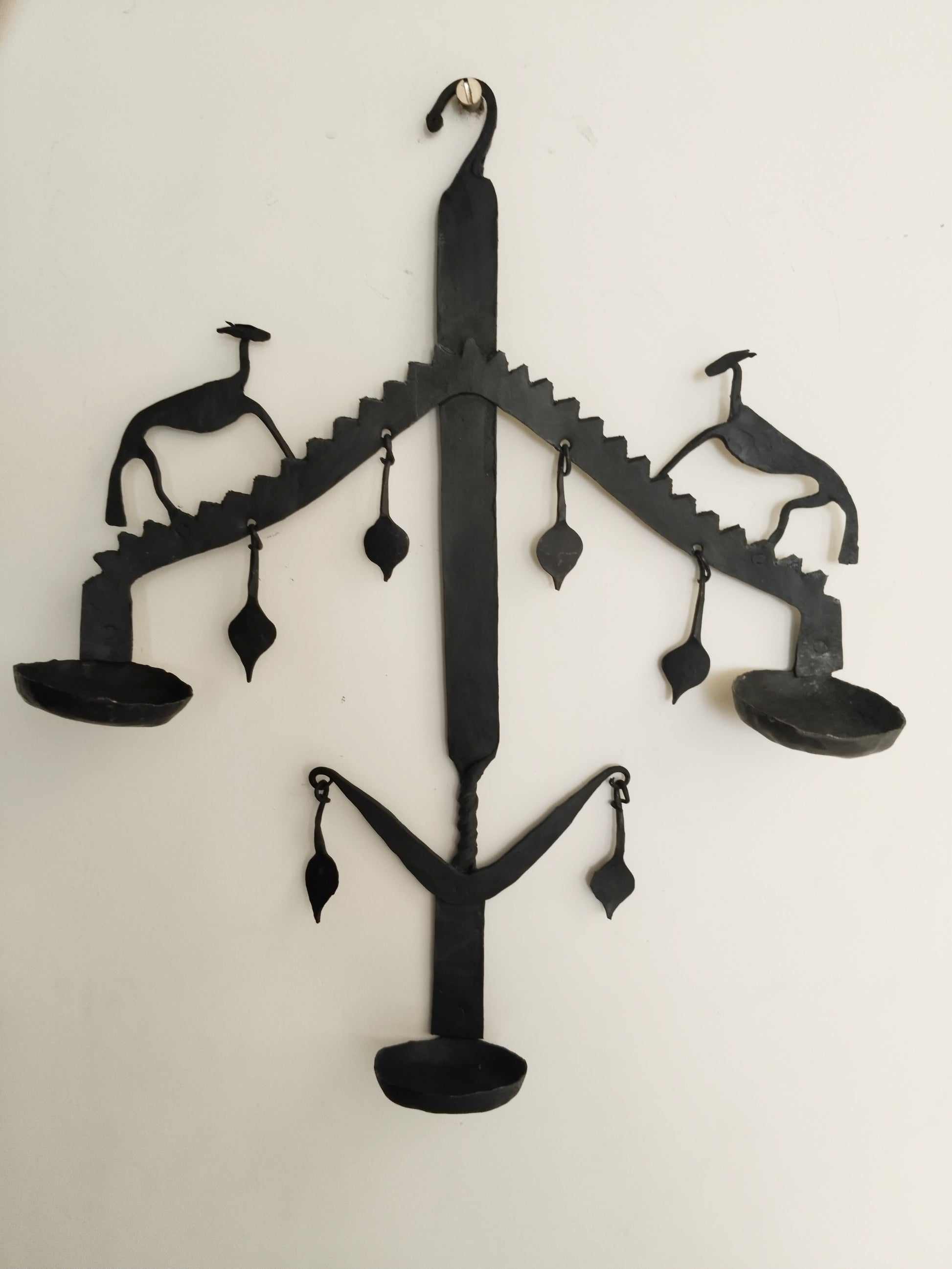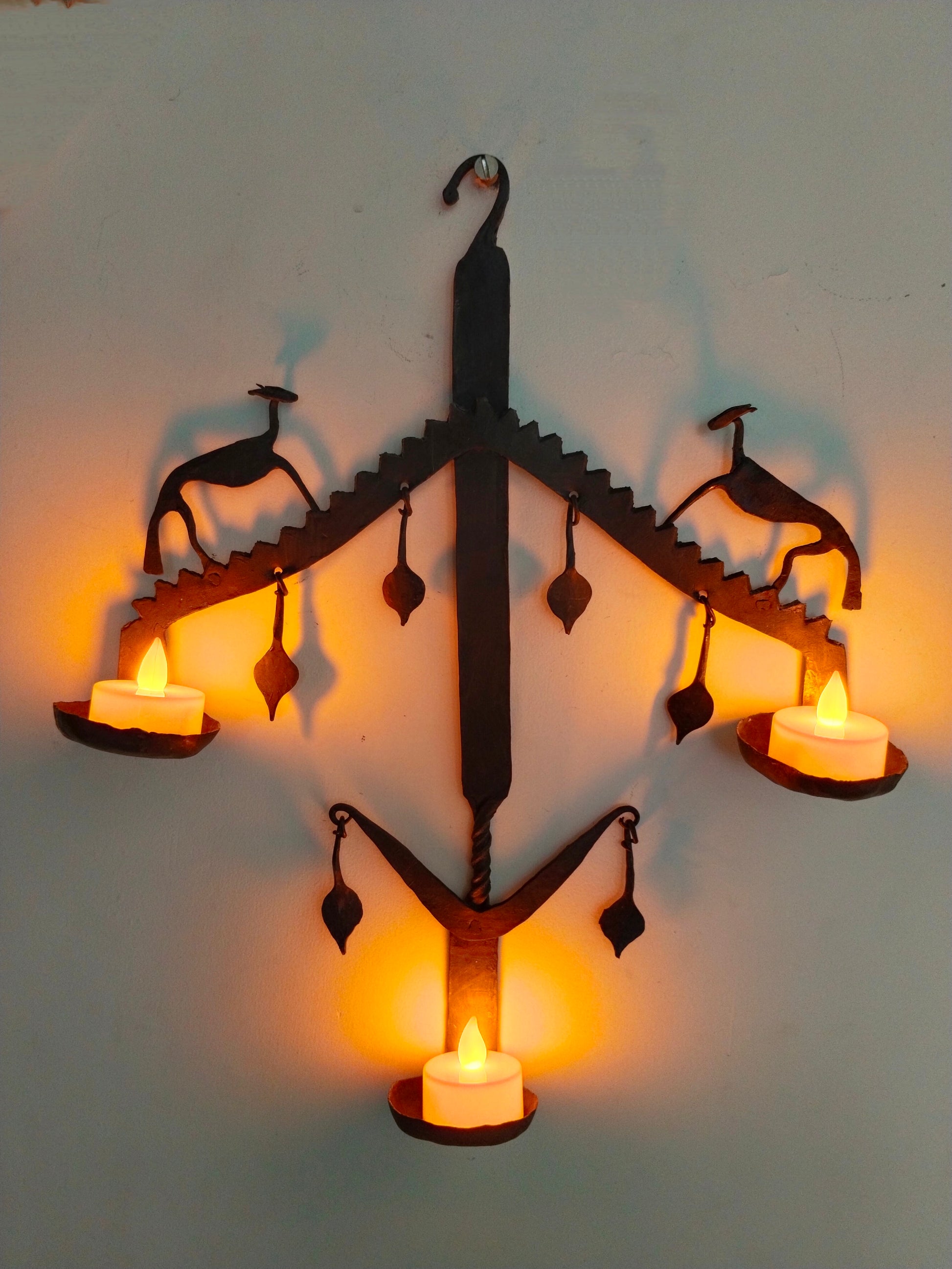 This is a Beautiful tribal craft form beating up wrought iron to give them human and animal shapes that are then welded onto a frame to which diyas (tea-light) holders are added.